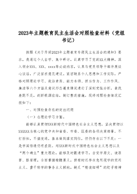 2023年主题教育民主生活会对照检查材料(党组书记)按照《关于开好2023年主题教育专题民主生活会的通知》要求,我通过个人自学、集中研讨,认真学习了党的XX大精神,深入领会XXX、XXX、xxxx等必读内容,认真与党员领导干部开展谈心谈话,广泛征求意见建议。紧密联系个人思想和工作实际,严格对照理论学习、政治素质、能力本领、担当作为、工作作风、廉洁等六个方面及意识形态履责情况进行了深刻党性分析,查找差距不足,剖析根源症结,制订整改措施。现将对照检查情况汇报如下:一、对照检查存在的突出问题(一)在理论学习方面。能够认真贯彻XXX新时代中国特色社会主义思想,坚决贯彻以XXXXXX为核心的党中央和省委、市委、区委的各项决策部署,不打折扣,不搞变通,基本做到落实到位,但仍存在以下不足:一是学深悟透仍有差距。对XXX新时代中国特色社会主义思想以及两个确立重大理论,能够及时跟进学习,自觉学原文、读原著、悟原理,全面掌握精髓要义,但有时还存在急用现学的实用主义、重干轻学的事务主义倾向,缺乏精读细研的钉子精神背记理论观点多、完成学习任务多,真正进入思想、进入工作还不够。二是学习氛围不够浓。对机关理论学习重视不够,总认为安排其他领导干部领学效果一样好,对全局党员干部的理论学习存在安排部署较多、检查落实较少,侧重于考虑大家忙于事务性工作,侧重于减轻大家的工作负荷,进而削弱了对理论学习的硬性要求。(二)在政治素质方面。政治斗争精神不够足。在学习XXX关于增强斗争精神的要求时自己是热血澎湃的,思想上情感上都是高度认同的,能够认识到党内不良风气和现象、损害党的利益,以及动摇党的执政根基的行为都是斗争对象,只有通过斗争才能实现我们党的自我革命。但现实中,对中央、省市区通报的、已经定性的问题开展斗争能够态度坚决、行动自觉,但在面对身边干部的不当言行时甚至工作中的官僚主义、形式主义行为时,很多时候也仅是作善意提醒没有真刀真枪开展斗争,咬耳扯袖都没做到。(三)在能力本领方面。通过深入理解党是什么、要干什么,更加激发了我心怀国之大者、贯彻新发展理念、担当履职尽责、全力做好各项工作服务中华民族伟大复兴的情感自觉、思想自觉、政治自觉、行动自觉。但是,深刻对照来看,依然存在一些问题。一是抓工作执行上还不够有力。工作中一张蓝图绘到底的韧性不够,有时认为工作安排了,由具体职能部门去抓工作落实就可以了,跟进指导不够及时,导致工作进展与预期目标出现差距。比如,在高质量考核工作中,虽能够对考核细则做出总体部署安排,但监督指导还不够到位。二是矢志锐意进取的劲头还不够强。随着任职年限的增长,虽然时时警醒自己不能懈怠、不能放任、不能随性,守好底线,忠于职责,但工作主动性、艰苦性不够,面对矛盾的勇气和担当精神不强,抓工作的狠劲有时也有所下降。有时抓工作按部就班,求稳求成,对个别干部出现的工作失误,没有严格提出批评,特别是在反复强调为基层减负的情况下,抓工作缺乏锐气,缺少创新,缺失激情。(四)在担当作为方面。斗争本领有待增强。在人社工作时间短,人社工作业务政策性强,对业务了解不全面不深刻,对政策的把握认识还不够,导致工作中出现缺乏创新、攻坚克难的意识,比如对劳动监察、仲裁等业务工作等方面存在的困难问题解决不够有力。(五)在工作作风方面。落实一岗双责不够有力。两个责任履行不到位,对班子成员的政治谈话落实不到位,在谈话中内容不够具体充实,没有按照文件要求进行深入谈话。在抓细抓实机关纪律建设方面还需要加强,如参加了警示教育大会后,向干部传达的仅限于大会上的会议精神,自己本身的思考传达较少、不到位。(六)在廉洁自律方面。在工作中,自己能够始终把坚持和加强党的领导贯彻到工作的全过程,严守党的政治纪律和政治规矩,党中央提倡的坚决响应、党中央决定的坚决执行、党中央反对的坚决不做,严格省、市委决策部署,自觉接受市委的领导,切实推动各项工作落实。但是深刻反思,依然存在一些突出问题。一是监督职责履行的还不够充分。虽然自己在强化监督职责方面作了一些工作,但是总体感觉到在监督上方式比较单一,廉政警示教育开展的不够经常监督检查成效还不明显,有重业务、轻监督的倾向。二、原因剖析(一)理论学习有所懈怠。随着工作阅历的增长,潜意识里就有了吃老本的思想,不由自主地放松了理论知识的积累,学习的劲头没有以前足了,精学细研变得少了,常常是急学现用浅尝辄止、零敲碎打,导致对自身存在的问题看得不清,严重危害性认识得不深,政治敏锐性不够强。(二)党性锻炼有所放松。随着时间的推移,加之党内一些消极腐败现象的影响,自己有时对社会上存在的一些坏风气缺乏足够警醒,没有用好批评和自我批评这一锐利武器,不知不觉淡化了理想信念,弱化了作为一名党员领导干部为党的事业奋斗终身的政治责任。(三)监督常态化有所下降。常态长效从严管理