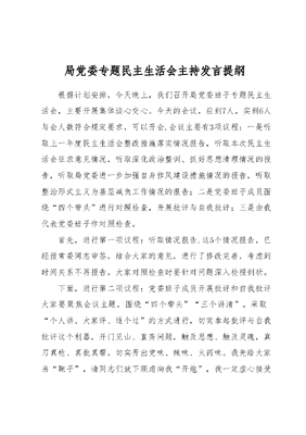 局党委专题民主生活会主持发言提纲根据计划安排,今天晚上,我们召开局党委班子专题民主生活会,主要开展集体谈心交心。今天的会议,应到7人,实到6人与会人数符合规定要求,可以开会.会议主要有3项议程:一是听取上一年度民主生活会整改措施落实情况报告,听取本次民主生活会征求意见情况,听取深化政治整训、抓好思想清理情况的报告,听取局党委进一步加强自身作风建设措施情况的报告,听取整治形式主义为基层减负工作情况的报告;二是党委班子成员围绕四个带头进行对照检查,开展批评与自我批评;三是由我代表党委班子作对照检查。首先,进行第一项议程:听取情况报告.这5个情况报告,已经报常委同志审签,结合大家的意见,进行了修改完善,考虑到时间关系不再报告,大家对照检查时要针对问题深入检视剖析。下面,进行第二项议程:党委班子成员开展批评和自我批评大家要聚焦会议主题,围绕四个带头三个讲清,采取个人讲、大家评、逐个过的方式进行,切实拿起批评与自我批评这个利器,开门见山、直奔问题,触及思想、触及灵魂,真刀真枪、真批真帮,切实开出党味、辣味、火药味。我先给大家当靶子,请同志们放下顾虑向我开炮,我一定虚心接受举一反三、坚决整改。下面,我先进行自我批评。……〔个人对照检查后〕关于党委班子建设情况和下步加强改进的措施打算,我最后综合大家的发言,在会议小结的时候一并报告。下面,请大家向我开炮。刚才,同志们对我提的批评意见都很好,共有XX条,我照单全收、虚心接受、坚决整改,恳请大家随时随地对我进行批评帮助,也真诚欢迎对我整改情况进行监督。下面,我对民主生活会作个小结这次民主生活会紧扣会议主题,贯彻严的标准和实的要求,从思想上政治上工作上盘点收获、检视剖析,开展批评与自我批评,既是政治上思想上的交心,也是工作上方法上的交流,达到了提领认识、促进团结、共同提高、推动工作的目的。突出特点有4个:一是充分体现了高度负责、担当尽责的精神。大家都有很高的政治站位、很强的使命担当、很深的境界情怀,都能以党的事业为重、以单位建设发展为重、以对同志真关心真负责为重,充分展现了对党委班子建设和单位全面建设真正负责尽责的真诚态度。二是充分体现了开诚布公、团结和谐的氛围。大家紧紧围绕四个带头三个讲清,坚持把自我革命和斗争精神贯穿始终,自我批评直面问题、具体实在,相互批评开诚布公、直截了当,既洗涤了思想、净化了心灵、升华了境界,也体现了求真务实的作风和直面问题的勇气,实现了严肃批评和自我批评这个党性淬火基础上的真团结。三是充分体现了实事求是、求真务实的作风。审议的5个报告,开展的批评与自我批评,都坚持深度检讨反思问题,单位建设和个人素质上的高与低长与短强与弱都得到了比较好地呈现,让大家更加清醒地认清了形势现状、班子现状、自身能力现状,进一步增强了投身奋斗事业提升能力素质的危机感紧迫感。四是充分检验了工作成效。这次民主生活会,大家把自己摆进去、把职责摆进去、把工作摆进去见人见事见思想,开出了党性、开出了团结、开出了前进力量,达到了统一思想、增进团结、凝聚力量、推动工作的目的。接下来,由我代表党委班子作对照检查。我们这个班子的X名成员,虽然以前各自在不同的局办任职,有不同的阅历,但优势互补的效益很好、齐心干事的状态很高,我感到,大家都非常讲政治、讲原则、讲事业、讲团结、讲感情是一个能够挺膺担当的坚强领导集体。主要有4个特点:一是带头抓政治训练立魂,是一个忠诚的班子。立魂塑形首先从常委同志做起,刚性落实政治纪律和政治规矩,制定落实《党委常委思想行为规范》,带头研学XXX新时代中国特色社会主义思想,带头清查清理思想雾霾,带头以普通党员身份参加党小组会剖析检讨,带头到学习教育联系点上党课,不断增强政治判断力、政治领悟力、政治执行力,努力做到学习习XXX重要讲话没有时间差、拥戴习XXX这个核心没有情感差、落实习XXX指示要求没有行动差。二是带头抓指导帮建立基,是一个务实的班子。常委同志都有着功成不必在我的情怀境界,注重干挂不上号、出不了名,但基层需要、群众叫好的事;干周期长、见效慢,但有利于蓄底气增后劲的事;干费劲大、落实难,但对单位长远建设有益处、经得起历史检验的事,每人都挂钩2个单位,经常深入一线调查研究听取意见、解决问题,在年初工作筹划、半年形势分析、年终工作总结等关键时节都开展解剖式指导帮带,一线窗口单位的主动性创造性充分释放,自主抓建的意识和能力不断增强,比拼追赶的氛围和干劲明显提振。三是带头抓红线底线立威,是一个清醒的班子。坚决贯彻落实XXXXXX坚持底线思维,强化风险意识的指示精神,常委同志都把抓安全保稳定当作政治责任、共同责任、分内责任,不厌其烦地讲,不知疲倦地抓,不留死角地查,不遗余力地防,年度没有发生安全隐患问题。四是带头抓团结自律立信,是一个