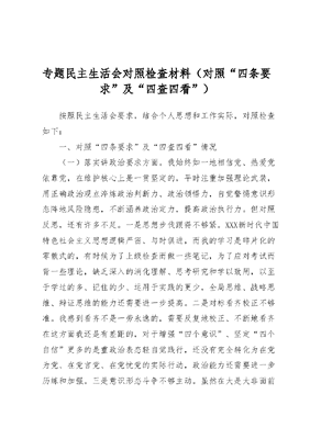 专题民主生活会对照检查材料(对照四条要求及四查四看)按照民主生活会要求,结合个人思想和工作实际,对照检查如下:一、对照四条要求及四查四看情况(一)落实讲政治要求方面。我始终如一地相信党、热爱党依靠党,在维护核心上是一贯坚定的,平时注重加强理论武装,用正确政治观点淬炼政治判断力、政治领悟力,自觉警惕意识形态阵地风险隐患,不断涵养政治定力,提高政治执行力。但对照反思,还有许多不足。一是思想步伐跟得不够紧。XXX新时代中国特色社会主义思想逻辑严密、与时俱进,而我的学习是碎片化的零散式的,有时候为了上级检查而做一些笔记,为了应对考试而背一些理论,缺乏深入的消化理解、思考研究和学以致用,以至于学过的多、记住的少、运用于实践的更少,全局思维、战略思维、辩证思维的能力还需要进一步提高。二是对标看齐校正不够准。我感到看齐不是一劳永逸的,需要反复地校正、不断地看齐在这方面我还是有差距的,对于增强四个意识、坚定四个自信更多的是重政治表态轻自觉践行,还没有完全转化为在党为党、在党言党、在党忧党的实际行动,政治能力还需要进一步历练和加强。三是意识形态斗争不够主动。虽然在大是大非面前时刻保持清醒坚定,但面对杂音噪音,甚至灰色信息,满足于自己不信不传,洞察不够敏锐,亮剑不够及时,没有形成无条件的心理反射去批判、去制止,根本上还缺乏绝对免疫的政治警觉和足够的政治担当,需要进一步提纯党性。(二)落实善创新要求方面。虽然我多次通读党的XX大报告也对一些新词划了重点,但仅仅只是划了重点,没有深入去了解去研究,很明显缺乏创新的意识,暴露出识变应变求变的敏感性不强。联系工作实际,同样存在创新意识欠缺的问题。一是缺少敢为人先的锐气。都说温州人有一种敢为天下先的精神,而我这个温州人在这方面比较缺乏,对分管的工作缺乏无功就是过,平庸就是错的责任担当。二是缺少创新进取的闯劲。探索真知的积极态度不够,习惯于墨守成规、按部就班,工作中凭老经验老做法,经常把以前怎么样挂在嘴边。三是缺少应变求变的能力。主要是知识储备不足,学习能力不够,以至于创新意识、创新思维处于低层次,久而久之不想变、不敢变。(三)落实重实干要求方面。入职以来,一直奉行着实干的精神,但这种实干更多的体现在肯吃苦,管好自己、干好自己的事。我也逐渐意识到这种肯吃苦离真正重实干还有一定差距。一是参与决策不够主动。站在全局思考问题不多,给党委领导主动出谋划策做得还不够好,一些分内工作因为担心与各单位时间人力产生冲突,抓得还不够落地到位。二是责任担当不够强烈。有时领会上级要求还不够准确,抓工作有时出现等靠、畏难情绪,跟踪问效、紧盯末端抓落实的力度还不够,重过程、重表象、重浅层的问题还或多或少存在。三是工作指导不够经常。一线指导缺少力度、准度和广度,解决制约单位建设的矛盾问题和人民群众实际困难做得不够,往往是上级重视什么、强调什么,才去抓什么,什么时候强调了,什么时候才去抓,不由自主的存在抓一阵、松一阵、停一阵的现象,回想近一年的时间,除了挂钩的单位去得多一些,到其他一线单位指导的比较少。(四)落实严自律要求方面。自己多次参加巡察和纪委监委审查调查工作,在这方面也特别注意,能够做到严于律己。但对照要求,一方面党性锤炼不够自觉。总觉得自己受党教育多年,思想是积极的,政治是坚定的。也正因此,从严坚持经常性的党性锤炼不够,没有经常用党性原则、党员先进性和纯洁性的标准反思自己的言行,主动进行自我警示、自我批判。另一方面律己修身有所放松。参加工作以来,我始终把形象问题看得很重,一言一行都在维护威信、树好形象,认为自己在自律方面有比较好的口碑。也正因此,自己产生了差不多可以了的感觉,持之以恒从严自重、自警、自省、自励的标准还不够高,没有完全做到事事认真、处处较真,对于一些不良风气,虽然保持了应有的警惕,但抵制不够坚决彻底。二、三个讲清情况选拔任用干部方面。干部选拔任用是否公正是政治生态纯正的具体体现,也是重要举措,我本人也是在组织关怀下的受益者。因此,我自觉强化政治意识、政策观念责任担当和斗争精神。但由于工作分工不同,在干部选拔任用上我的参与度不够,主要是在发现人才、培养人才、推荐人才方面做得还很欠缺,没能向党委提出实实在在的选拔任用意见。三个讲清方面。①本人没有信访举报反映、巡视审计反馈、组织约谈函询等问题;②严格落实领导干部有关待遇规定,没有享受过福利分房,按规定在单位申请分到一套公寓住房;③个人及家庭没有重大事项发生变化。三、整改落实措施下步,我将坚决抓好整改,做到四个注重下功夫。(一)注重在强化政治意识上下功夫。当务之急就是进一步用XXX新时代中国特色社会主义思想武装头脑,增强四个意识坚定四个自信、做到两个维护,养成自觉主动学的习惯保持及时跟进学的状态,及时学习