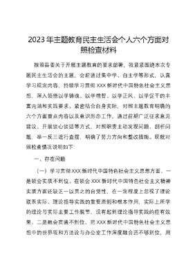 2023年主题教育民主生活会个人六个方面对照检查材料按照县委关于开展主题教育的要求部署,我紧紧围绕本次专题民主生活会的主题,会前通过集中学、自主学等形式,认真学习规定内容,持续学习贯彻XXX新时代中国特色社会主义思想,深入领悟以学铸魂、以学增智、以学正风、以学促干的丰富内涵和实践要求。紧密结合自身实际,对照主题教育明确的六个方面重点内容以及意识形态工作,通过前期广泛征求意见建议、开展谈心谈话等方式,对照职责主动发现问题、剖析问题,举一反三进行查摆,明确了努力方向和整改措施。现就对照检查情况说明如下:一、存在问题(一)学习贯彻XXX新时代中国特色社会主义思想方面。一是领会实质不到位。在领会XXX新时代中国特色社会主义精神实质方面还缺乏一以贯之的自觉性,在一定程度上忽视了理论联系实际、理论指导实践的重要原则和根本作用,实际上所学的理论与实际主要工作脱节,没有起到理论指导实践的应有效果。二是融会贯通不到位。把XXX新时代中国特色社会主义思想中的世界观和方法论与办公室工作深度融合还不够到位,用政治眼光观察和分析问题的水平还有待提高,主动服务和融入国家重大战略、置身全县大环境大格局的政治自觉还不够。(二)维护党中央权威和集中统一领导方面。一是两个确立认识不足。对两个确立认识理解还不够深入。政治判断力、政治领悟力、政治执行力不够强,对于其中的构成要素、实践路径了解不够深入,对两个确立中的理论逻辑、历史逻辑和实践逻辑,未能完全理解到位。政治定位把握不准。二是落实上级决策部署不够有力。尽管努力做到时刻关注党中央、省委、市委、县委在关心什么、强调什么,但是站在国之大者的政治高度和工作力度去抓工作做得不到位,政治敏锐性还有所欠缺,对于党中央的大政方针了解不够透彻。(三)践行宗旨、服务人民方面。一是一心为民政绩观树立不牢。工作重心大多放在业务工作上,对于如何树立正确政绩观认识不够深入,唯上不为下的风气没有根本扭转,深入基层面对面与百姓交流次数较少,对基层群众所思所盼了解不够深入。二是深入调研质量不高。有时仅仅按照上级要求调研次数完成规定动作,由于调研时间较短,调研方向不准,导致调研质量并不高,通过调研深入发现群众急难愁盼问题,做得还不够到位。(四)求真务实、狠抓落实方面。一是工作落实不够具体。落实上级决策部署简单化、一刀切,没有创造性开展工作,而是机械教条式的执行,督导跟踪做得不好,对具体业务工作、关键环节疏于把关,缺少一竿子插到底的精神。二是开拓创新劲头不足。有时仅停留在确保完成各项重点工作任务和推进日常工作上,存在工作按部就班,想问题、做决策顾虑较多,开拓创新少,就工作干工作多,主动落实少,研究情况多,解决问题少,工作上缺乏新意,缺少亮点,习惯于用老方法解决新问题,缺乏探索创新的及时性、主动性。三是锐意进取的精气神较为缺乏。干事创业的劲头不足,有的认为工作永远也干不完,有了歇一歇、等一等的想法,有了少干事、不出事的倾向,有着求稳怕乱的心理。(五)以身作则、廉洁自律方面。一是对全面治党学习认识不深入。对于XXXXXX关于全面从严治党的重要论述学习的不够深入,在清廉之风的弘扬上,在俭朴之风的养成上下的功夫还不够多,在慎独、慎微、慎权上还没有完全做到从严要求,在自警、自省、自律上还没有从高设标,在落实责任上存在偏差和失误。二是廉政风险防控存在漏洞。在运用法治思维和法治方式开展工作的意识不强,政治规矩意识还有待进一步增强,对于法无授权不可为的认识还不够深刻,廉政风险点查找和防控措施还不够全不够规范,一定程度上存在小节无害的思想。(六)履行全面从严治党政治责任方面。一是责任落实不够到位。在落实一岗双责上还没有真正做到把全面从严治党作为自己的责任田和份内事,对于党风廉政建设的各项要求部署落实还不够有力,对抓业务工作多,党风廉政建设讲的多监督少、听的多招法少。二是日常监督管理不够严格。对干部日常管理方面存在重使用轻管理、重任务轻关怀、重考核轻激励等现象,对重点环节、重点部位的监督检查力度不够大,开展党性党风党纪的监督检查的覆盖面还不够广、频次还不够高,没有有效形成震慑,对干部八小时之外的生活作风监督还存在死角、盲区,仅靠干部的自觉性,没有及时跟踪问效。三是警示教育质效不高。对党员干部思想政治教育工作投入的精力不多,积极主动与党员谈心谈话交流不多,教育引导办公室的党员干部树立正确三观的力度还不够大。二、原因分析(一)理论武装有所懈怠。感觉自己理论功底能够满足工作需要了,由此产生学多学少都够用了的想法,没有自觉地把学习当成一种态度、一种责任、一种追求、一个常态贯穿到日常工作中,在学习XXX新时代中国特色社会主义思想上下的功夫不够,没有融会贯通,以致于在用以指导办公室工作上还有差距。(二)党性修养有所放松