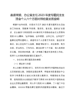 县委常委、办公室主任2023年度专题民主生活会个人六个方面对照检查发言提纲根据中央和省委、市委关于召开2023年度专题民主生活会的工作安排,我聚焦学思想、强党性、重实践、建新功总要求,在认真学习深刻领悟XXX新时代中国特色社会主义思想和党的XX大精神、以学铸魂、以学增智、以学正风、以学促干重要论述等的基础上,紧密结合个人思想工作实际,通过征求意见、谈心交流和个人自查,围绕理论学习、政治素质、能力本领、担当作为、工作作风、廉洁自律六个方面,深入检视存在问题,深刻剖析根源,进一步明确了整改任务和努力方向,现将个人对照检视剖析情况汇报如下。一、存在的主要问题及具体表现(一)理论学习方面本人注重日常理论学习,坚持用XXX新时代中国特色社会主义思想武装头脑,加强政治理论素养,积极参加县委理论中心组学习和县委办公室机关党支部主题党日、专题组织生活会等,指导党委办公室组织开展学习贯彻XXX新时代中国特色社会主义思想主题教育,深入学习党的XX大精神、二十届二中全会精神、XXXXXX视察内蒙古重要讲话重要指示精神,通过个人自学、研讨交流等形式,两个确立的决定性意义领悟更加深刻,理想信念愈发坚定,精神之钙持续补足。一是学习的深刻性不够。能够充分认识理论学习的重要性,积极参加县委中心组学习、办公室党支部学习,但由于每天忙于服务县委运转、搞好办公室三服务等具体事务,除了按时参加集中学习外,对个人自学抓得还不够,挤时间学习的劲头有所减弱,对党的一些创新理论和最新政策文件精神浅尝辄止、现学现用,没有做到领会更深、理解更透、把握更准,距离深学细研、学深悟透、学懂弄通的标准还有一定的差距。比如,对涉及办公室工作的知识、觉得有用的方面内容学得多一些、深一些,而对与分管联系领域不多的、其他方面的内容学得不够深入,存在重业务轻学习的错误倾向。二是学习的贯通性不强。习惯于以干代学、以会代学,对新思想新理论的思考领悟、理解把握还不够全面系统、精准透彻,未能真正做到融会贯通、入脑入心。比如,对XXX新时代中国特色社会主义思想中蕴含的基本方法、思维方法、工作方法等缺乏深入系统全面的研究,触类旁通、举一反三能力不足,还没有真正把蕴含其中的立场、观点和方法,转化为科学的思维方式、思想观念和工作方法,活学活用到谋划发展、深化改革等具体工作中去。三是学习的实践性不好。充分发挥理论对实践的指导作用实际成效还不好,灵活运用新思想新理论指导办公室工作还不够,特别是在自觉运用XXX新时代中国特色社会主义思想来破解难题、推动工作方面存在一定差距,密切联系实际来学习思考不够。比如,对如何以理念变革、主动服务推动办公室工作高质量发展,还缺少系统性的调研与谋划,以新理论加快推动办公室工作的具体创新性举措还不多。(二)政治素质方面能够始终以高度的政治责任感和使命感,深入学习领会XXX新时代中国特色社会主义思想和党的XX大精神,牢固树立四个意识、坚定四个自信、做到两个维护,在政治立场、政治方向、政治原则、政治道路上同以XXX同志为核心的党中央保持高度一致。但对照更高标准和要求,仍存在短板不足。一是思想认识有待进一步提升。能够充分认识到两个确立是时代的呼唤、是历史的选择,但对其中蕴含的科学内涵、阐释的深刻道理,还没有完全做到融会贯通,在把对两个确立的理解感悟真正转化为做到两个维护的思想自觉、政治自觉、行动自觉方面还有一定差距。二是贯彻落实方面有待进一步提高。对上级安排部署的工作任务,能够坚持马上就办、狠抓落实,但遇到一些困难大、问题多的工作时,协调、督促的力度还不够大。比如一些改革工作,如粮食体制改革、农信社改革等成效还不是很理想。三是政治觉悟有待进一步强化。经过深刻反思,自身政治觉悟更多还是出于对领袖的爱戴和拥护,出于对规矩的执行和坚守,对新形势下如何更好地维护党的形象权威,往深里学方面有待进一步加强。(三)能力本领方面坚持用XXX新时代中国特色社会主义思想统一思想、统一意志、统一行动,自觉把XXX新时代中国特色社会主义思想转化为坚定理想、锤炼党性和指导实践、推动工作的强大力量,立足全县发展实际,站位全县发展大局,主动担当作为,积极参与全县中心工作和重点项目建设,注重在综合协调、参谋辅政、深化改革、破解难题中提升能力,增强本领,但与新形势、新任务、新要求相比,个别方面做的还有不到位的地方。一是开拓创新的主动意识有待进一步强化。作为县委改革办主任,在全面深化改革工作方面,虽然在强力推进开发区体制机制改革、紧密型县域医共体改革、县域放权赋能改革、养老服务体系建设等方面取得了较好成绩,但总的来看,由于思想还不够解放,推进改革创新的胆子还不够大、步子不够快,在农信社、供销社等个别领域的改革尚未达到预期目标。二是敢于斗争的能力本领有待进一步提升。对工作和生活中出现的