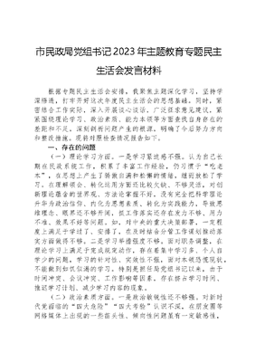 市民政局党组书记2023年主题教育专题民主生活会发言材料根据专题民主生活会安排,我聚焦主题深化学习,坚持学深悟透,打牢开好这次年度民主生活会的思想基础。同时,紧密结合工作实际,深入开展谈心谈话,广泛征求意见建议,紧紧围绕理论学习、政治素质、能力本领等方面查找自身存在的差距和不足,深刻剖析问题产生的根源,明确了今后努力方向和整改措施。现将对照检查情况报告如下。一、存在的问题(一)理论学习方面。一是学习紧迫感不强。认为自己长期在民政系统工作,积累了丰富工作经验,仍习惯于吃老本,在思想上产生了骄傲自满和松懈的情绪,继而放松了学习。在理解领会、转化运用方面还比较欠缺、不够灵活,对创新理论蕴含的世界观、方法论掌握不好,没有完全把科学理论升华为政治信仰、内化为思想素质、转化为实践能力,导致思维理念、眼界还不够开阔,抓工作落实还存在发力不够、用力不准、效果不好等问题。如,对中央的重大决策部署,一定程度上满足于学过了、安排了,在及时结合分管工作谋划推动落实方面做得不够。二是学习举措强度不够。面对职务调整,在理论学习上满足于完成规定动作,存在着集中学习多、个人自学少的问题,学习的针对性、实效性不强,面对本领恐慌现状,不能做到如饥似渴的学习。特别是担任局党组书记以来,由于时间冲突、会议冲突、工作影响等因素,存在挤占学习时间、推迟学习计划、减少学习内容的现象。(二)政治素质方面。一是政治敏锐性还不够强。对新时代党面临的四大危险四大考验认识不深,在朋友圈等网络媒体上出现的一些苗头性、倾向性问题虽有一定敏感性,但对一些损害党的形象和威信的言行警觉性不够,监控、制止舆情信息传播的方法措施较少。比如,看到一些网络谣言,收到一些手机段子,只要内容不牵涉到本地,就觉得无所谓;对一些传播的错误思想和言论抵制不力,不能积极地开展批评,没有挺身而出、以理服人的勇气和自信。二是执行组织生活制度不够严格。在坚守党的双重组织生活等制度方面,还有落实标准不到位的情况,没有用好批评和自我批评这一思想武器。如,每年仅仅在民主生活会和组织生活会上,才进行全面系统地自我反思,广泛听取意见建议,平时与班子成员、与普通党员干部开展谈心谈话、听取意见建议少,特别是思想感情方面的沟通偏少,对干部职工的工作生活困难了解和关心还不够。(三)能力本领方面。一是创新思维能力不强,在工作中遇到棘手的困难,会有变通、绕开的想法。存在按部就班的思维和心理,在工作推动中习惯于循惯例、找路径,创新思维、辩证思维、前瞻思维能力有待提升,科学研判形势、把握事物本质的能力还要强化。面对繁重的工作任务,有时会有畏难情绪和疲于应付心态,担当作为的主动性和积极性不足,降低了工作标准。如,在创新优化多元救助帮扶服务改革中,特别是扩中提低改革重点领域和重点群体,缺乏积极的心态和不破不立的决心,往往有等等看、慢慢推的想法,致使部分工作推动四平八稳,成效一般。二是攻坚克难的实践本领有欠缺。在面对新时代新时期民政工作的新问题、新矛盾,缺乏前瞻性谋划、系统性布局,特别是一些长期存在的老大难问题,不敢动真碰硬,存在畏难情绪,破题解题的拼劲和狠劲不足。如,一老一小服务一直是我市工作的难点和薄弱点,我在统筹推动设施和服务下沉,构建大社区养老服务新格局上迟迟打不开工作局面,建设基本养老服务体系与群众期盼还有很大差距,无法满足群众需求和提供高品质的养老服务。(四)担当作为方面。一是政绩观还不够端正。在正确处理对上负责、对下负责和对自己负责关系上均衡用力不够,往往仰望星空多,考虑对上负责多,眼睛朝下看少,对下负责少,没有把群众满不满意、高不高兴作为工作的出发点。如,在谋划五社联动试点县(区)时,考虑更多的是做锦上添花的事情,往往在条件好、基础设施完善的地方推行,没有把社会组织数量、质量、群众需求等综合分析,把好看、好观摩作为工作的出发点和落脚点。二是主动谋划担当不足。对照先进典型和身边榜样,对工作中出现的新情况、新问题缺乏积极的探索精神,对一些重大问题深层次研究不够,破解难题的新思路、新举措不多,贯彻新发展理念还不够积极,在思想上、行动上放不开。如,对于村社组织工作事务、机制牌子和证明事项规范行动,由于牵扯部门多,政策不统一,没有牵头抓总形成工作合力,只是象征性印发了文件,在抓落实过程中有降低标准、搞变通的情况,没有达到为基层自治组织减负松绑的工作目标。(五)工作作风方面。一是工作作风不够实。在一些急难险重工作中,缺乏一以贯之、一鼓作气、一抓到底的韧劲,注随大流、看风向、搞突击的心态仍然存在。如,在结亲帮扶工作中,帮扶方式简单,停留在上门走访慰问、做资料层面,没有根据结亲户、帮扶户家庭状况、特色特点制订可行的工作方案。再如,对一些文字工作,习惯于管方向、定大局,细细推敲、字斟句酌的绣花功夫不到位。二是形式主义整治还不彻底。