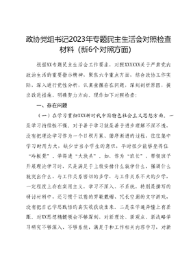 政协党组书记2023年专题民主生活会对照检查材料(新6个对照方面)根据XX专题民主生活会工作要求,对照XXXXXX关于严肃党内政治生活的重要指示精神,聚焦六个重点方面,结合政协工作实际,深入进行党性分析,认真查摆存在问题,深刻剖析原因,提出改进措施,明确努力方向。现作如下对照检查:一、存在问题(一)在学习贯彻XXX新时代中国特色社会主义思想方面。一是学习持续性不强。对于善于学习就是善于进步理解不深不透,没有把理论学习作为一个日积月累、循序渐进的过程,往往集中学习时用力大,缺少甘当小学生的意识,平时很少能够坐得住冷板凳、学得进大块头。如,作为班长,带领班子开展理论学习时,只是满足于上级安排什么就学什么,强调什么就突出什么,与工作关系密切的多学,与工作关系不大的少学,一定程度上存在实用主义,学习不深入、不系统,特别是撰写的研讨材料中,还习惯于以前的穿靴戴帽、冗长空洞的文字游戏,没有把自己学思践悟的真实收获谈出来。二是在学通弄懂上有差距。对XX思想精髓领会不够深刻,对新理论、新观点、新战略学习研究不够深入、不够系统,满足于和工作相关内容学习,对新思想知识体系和整体框架的建立缺乏系统的归纳整理,主要是在深钻细研、内化于心、外化于行上不够积极主动。如,在开展政协调研视察工作中,不能把党的创新理论贯穿在视察工作全过程形成的调研报告还存在万能问题,提出的对策建议还存在万能钥匙,缺乏有效解决问题的金钥匙。(二)在维护党中央权威和集中统一领导方面。一是党性修养不够。对实现共产主义远大理想的长期性、复杂性、艰巨性认识不足,放松了持续改造自身世界观、人生观和价值观的自觉性放松了对保持党员先进性和纯洁性的追求,不能时时刻刻对照党员标准严格要求自己,党性修养与党的事业要求、人民群众的期盼存在一定差距。如,作为党组书记,在组织召开理论中心组学习时,在更有效地推动学深悟透XX思想,着力提升工作质量、效率上,还存在示范引领不强、督促检查不严的方面。二是政治执行力有差距。对于上级的决策部署能够坚定坚决执行,但不同程度存在口头落实、实践落空的境地,对于一些工作往往雷声大雨点小,在具体执行中有时变了味、走了样。如,根据县委关于年轻干部的培养要求,作为班长我非常重视,选育了一批年轻干部,但在培育过程中一味的压担子、交任务,忽视为他们垒台阶搭梯子,导致一些年轻干部成长较慢。(三)在求真务实、狠抓落实方面。一是工作思谋不深。谋划工作精力都放在了具体任务的计划、实施方面,缺乏主动进行思想革命的自觉,很少有时间去思考拿出什么样的新举措。在政协规划工作布局、党员干部能力建设方面,如何聚焦主业,真正做到有所为有所不为,不断提高建设能力水平,自己的思维层次理论素养还有很大差距,研究解决制约单位发展的瓶颈问题中务虚的意见多,具体实施中可操作的措施少。如,围绕县委的决策部署,在如何发挥政协民主监督、建言献策职能上考虑不多措施较少,说到底还是有时存在惰性思想。二是求真务实的劲头有所减弱。抓工作缺乏一竿子插到底的韧劲和狠劲,不愿意多接几次烫手的山芋,多当几回热锅上的蚂蚁,对费时费力、关系长远的工作缺乏持之以恒、久久为功的劲头。如,在防范化解风险方面,对有的干部职工出现的麻痹思想、侥幸心理批评指正不够及时,还未真正通过驰而不息的耳提面命,让大家时刻保持忧患意识。(四)在践行宗旨、服务人民方面。一是服务意识不强。虽然能够在基层一线与群众沟通交流,但不善于捕捉和读懂群众表情包,听到群众对一些工作成效提出不同看法时就愁上眉头,对一些工作提出不同建议时就难上心头,这说明我干事创业的底气和担当不足,根源还是群众观念树得不牢、政绩观存在偏差。如,根据年度视察计划,围绕深化乡村振兴战略开展视察时,面对群众异见杂音存在畏难情绪,对于意见建议也是简单登记后就束之高阁,不能以积极心态去正视、面对回应。二是在树牢正确政绩观上有偏差。随着年龄的增长和所处环境的变化,对自身的要求有所放松,想问题办事情的立场、角度有所变化,服务基层、服务群众的意识有所淡化,有时重视对上多于对下,思考工作怎么符合上级意图想得比较多,如何倾听群众呼声、满足群众意愿想得比较少。如,在调查研究中有时候分不清主次和轻重,满足于眉毛胡子一把抓,看似聚焦中心服务大局,实际上却大而化之、就事论事,无法从个性中找共性从个案中找答案,提出的意见建议也都是些正确的废话,无法快速落地见效。(五)在以身作则、廉洁自律方面。一是严以律己作表率上有偏差。走在前、作示范的标杆意识不够强烈,与以往雷厉风行的工作风格相比,安逸思想有所滋长,抓长抓常抓细的严劲狠劲、韧劲不足,有时还存在惯性思维,思想上认为只要把工作做好就可以,忽略了有关纪律要求,特别是对一些未纳入明文规定的纪律规矩,既没