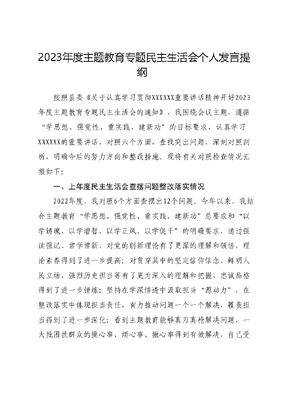2023年度主题教育专题民主生活会个人发言提纲按照县委《关于认真学习贯彻XXXXXX重要讲话精神开好2023年度主题教育专题民主生活会的通知》,我围绕会议主题,遵循学思想、强党性、重实践、建新功的目标要求,认真学习XXXXXX的重要讲话,对照六个方面,查找突出问题,深刻对照剖析,明确今后的努力方向和整改措施。现将有关对照检查情况汇报如下:一、上年度民主生活会查摆问题整改落实情况2022年度,我对照6个方面查摆出12个问题。今年以来,我结合主题教育学思想、强党性、重实践、建新功总要求和以学铸魂、以学增智、以学正风、以学促干的明确要求,通过强读强记、常学常新,对党的创新理论有了更深的理解和领悟,理论素养得到了进一步提高;对贯穿其中的坚定信仰信念、鲜明人民立场、强烈历史担当等有了更为深入的理解和把握,忠诚品格得到了进一步锤炼;坚持在学深悟透中汲取担当源动力,在整改落实中体现担当责任,有力推动问题一个一个解决,履责担当得到了进一步深化;看到主题教育能够真刀真枪解决问题,一大批困扰群众的操心事、烦心事、揪心事得到有效解决,自己受到很大触动,宗旨意识得到进一步强化;通过参加以案释纪、以案说法、以案为鉴警示教育,自己的斗争精神得到了进一步增强二、存在的主要问题(一)对照学习贯彻XXX新时代中国特色社会主义思想方面存在的问题。一是学习的自觉性不够。过多依赖于镇党委集中学习在个人自学方面计划的多,落实的少,实际学习总是滞后于既定的学习计划。比如,计划2023年12月前完成《XXX新时代中国特色社会主义思想的世界观和方法论专题摘编》学习,一拖再拖,近期才通读一遍。二是系统学习不深不透。缺乏系统思维,对XXX新时代中国特色社会主义思想的整体性和内在逻辑把握不好,孤立地去理解某一篇章,满足于学了、看了,没有沉下心思考、静下心感悟,看问题较为片面。比如,在学习《贯彻新时代党的组织路线》这一篇章时,没有结合基层组织工作条例去思考农村支部建设,说到底是系统学习不深不实的体现。三是学习成果转化成效不足。对于把握事物本质、把握发展规律、把握工作关键、把握政策尺度时常捉襟见肘,缺乏前瞻性思考、全局性谋划、整体性推进,造成推动包联村乡村振兴、服务群众、防范化解风险本领不强。比如,关于实施乡村振兴战略,中央经济工作会议指出了乡村振兴的发展方向和路径,但我没有做好转化文章,在指导包联村推进乡村全面振兴上办法不多,效果不明显。(二)对照维护党中央权威和集中统一领导方面存在的问题一是在践行两个确立的实践要求上有差距。筹备党的XX大知识竞赛期间,我深入学习了两个确立的科学内涵,并注重将其体现在自身的言行之中,但在如何把握好两个确立思想理论的抽象性和实际行动的实践性上,缺少全面深入的思考,政治态度与实际行动未能达到高度的统一性和一致性。二是在对两个确立的理论宣传上有差距。主题党日活动中,往往侧重于灌输式完成上级要求的理论学习篇章,对两个确立的宣传占比少,致使部分党员不能正确理解和对待党的领导核心与科学理论指导之间关系,没有真正形成广泛共识与共同行动,使两个确立在各领域各方面各环节的根本政治保证作用没有得到最大发挥。(三)对照践行宗旨、服务人民方面存在的问题。一是联系群众不够紧密。虽然一直在乡镇工作,但下乡多是去自己包联村与村两委班子成员打交道多,与群众联系少,缺乏与群众打成一片的热情。二是服务群众不够用力。在包村工作上,经常是领导安排什么干什么,没能将工作做到前面,缺少主动意识。深入包联村多是开展主题党日活动、宣讲政策和落实镇党委、政府的一些决策部署等,在精准对接群众需求,关心群众生活,办好小微实事上做的不够,与群众交情少、服务更少。(四)对照求真务实、狠抓落实方面存在的问题。一是追求求真务实的精神有所减弱。在开展工作时,缺乏持之以恒、久久为功的决心,工作落实没有形成闭环。比如,对各支部组织生活开展情况重视不够,仅仅关注党建规定动作完成和档案资料整理情况,日常监督、深入了解和交流指导少。二是推进工作落实的方法不够高效。有时过于关注自己负责的工作,在狭小的单位范围内思考问题,这就导致在服务全镇中心工作时支持度不足,缺乏遇事先统筹的意识和能力。比如,在党员教育管理上,注重的只是教育,对于引导党员在乡村振兴、乡村治理、森林防火医保征缴等实际工作中发挥先锋模范作用力度明显不足。(五)对照以身作则、廉洁自律方面存在的问题。一是自我革命意识不强。随着工作年限增长,走出舒适区的动力有所减弱有时候安于现状,得过且过,检视自身问题不够及时深刻,刀刃向内的狠劲不足,在改造主观世界上下功夫不够。二是模范带头作用发挥不够。在严以修身上还不注重细节,以身作则、率先垂范发挥得不够充分,说话办事不严谨,有时图一时之快,说话不经过思考,造成不良影响。(六)对照