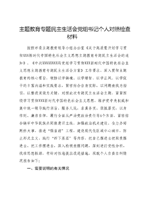 主题教育专题民主生活会党组书记个人对照检查材料按照市委主题教育领导小组办公室《关于高质量开好学习贯彻XXX新时代中国特色社会主义思想主题教育专题民主生活会的通知》、《中共XXXXXXXX局党组学习贯彻XXX新时代中国特色社会主义思想主题教育专题民主生活会方案》工作要求,深入贯彻主题教育的核心要旨,领悟以学铸魂、以学增智、以学正风、以学促干的丰富内涵和实践要求,紧密结合自身实际,以问题查找为指引,以整改实效为关键,对照此次专题民主生活会主题,紧紧围绕学习贯彻XXX新时代中国特色社会主义思想,维护党中央权威和集中统一领导践行宗旨、服务人民,求真务实、狠抓落实,以身作则、廉洁自律,履行全面从严治党政治责任等6个方面,紧密结合铸牢中华民族共同体意识主线,加强政治机关建设,全力办好两件大事,推进强首府工程,建设现代化区域中心城市,防止形式主义,践行四下基层等内容,把自己摆进去把职责摆进去、把工作摆进去,深入检视查摆问题,深刻进行党性分析,找准思想根源,有针对性地提出改进措施,现就个人自查自纠情况报告如下:一、需要说明的有关情况(一)个人重大事项报告本人未配备专职秘书和公务用车,办公室使用面积符合规定要求。无其他要说明的情况。(二)群众反映、巡视巡察和审计反馈、组织约谈函询等情况上一次民主生活会后群众反映、巡视巡察和审计反馈、组织约谈函询等方面:均未涉及我个人。二、存在的主要问题(一)学习贯彻XXX新时代中国特色社会主义思想,学风是否纯正、学习是否走心深入系统,是否用党的创新理论指导实践、解决问题,是否在把握科学体系、核心要义、实践要求上融会贯通,以思想理论水平的提高促进政治能力、领导能力的提升方面本人能够高度重视XXX新时代中国特色社会主义思想是党必须长期坚持的指导思想上的学习贯彻,我始终将理论学习置于首位会前通过集中学、自主学等形式,坚持研读XXXXXX系列重要讲话原文,持续学习XXX新时代中国特色社会主义思想,主动安排部署日常的政治理论学习,亲自参加研讨,能够把XXX新时代中国特色社会主义思想转化为坚定理想、锤炼党性和指导实践、推动工作的强大力量。对照查摆,本人在学思用贯通、知信行统一上存在不足,具体表现为:一是理论学习不够深入。当前政治理论学习尚未达到预期的深入和系统化,理论学习的常态化和强度有待加强,对原著、原文、原理的研读和领悟仍有不足。对XXX新时代中国特色社会主义思想的时代意义、科学内涵和核心要义的理解不够全面深刻。二是理论学习的运用不足。学习的目标性和实用性尚未充分发挥,未能将新思想、新理念、新理论充分融入XXXX事业高质量发展的实践中。三是在深入学习、结合实际、分析研判方面存在不足,例如在推动XXXX改革和发挥综合监管优势水平稳步提升方面,理论和指导实践的标准和要求尚不够高,实干导向实效为本的理念有待进一步巩固。(二)维护党中央权威和集中统一领导,是否不折不扣贯彻党中央决策部署和XXXXXX重要指示批示精神,是否存在有令不行有禁不止,作选择、搞变通、打折扣、不到位,不顾大局搞部门和地方保护主义;是否把铸牢中华民族共同体意识作为各项工作主线,落实政治机关建设有关要求方面本人能够做到深刻领悟两个确立的决定性意义,自觉增强四个意识、坚定四个自信、做到两个维护,始终在思想上政治上行动上同以XXX同志为核心的党中央保持高度一致党中央要求的坚定不移、不打折扣的做好贯彻落实,党中央禁止的坚决不做。在铸牢中华民族共同体意识作为各项工作的主线方面,时刻围绕怎样认识中华民族共同体建设、怎样铸牢中华民族共同体意识,深入学习宣传和研究阐释XXXXXX关于民族工作的重要论述,切实把XXXX全体干部职工思想和行动统一到党中央最新精神上来。在落实政治机关建设方面,坚定不移加强党的全面领导,坚持不懈推进党的政治建设,并强调持之以恒正风肃纪,带头弘扬党的光荣传统和优良作风,建设风清气正的政治机关。但本人结合工作实际对照查摆,存在以下方面不足,具体表现为:一是政治判断力、政治领悟力、政治执行力仍有待加强,有时片面的认为只要是在大是大非的原则问题上站稳脚跟、不迷失方向就行,思想上的防火墙筑得还不够牢固。二是大局意识、全局意识观念有待进一步提高,在吃透中央精神、准确把握上级工作的重心和节奏上,自己的思考深度、站位高度、工作力度还不够,缺乏更进一步、更深一层的思考和行动。例如在治理XX行业乱象方面,虽然取得了一定的效果,但究其深层次产生的原因,从根本和源头上强化预防和治理的举措仍需细化,提前预判、超前谋划做到不够。三是准确把握和理解政治机关建设的深刻内涵有待进一步加强,对于怎么看怎么干干什么为什么干的问题的研究和部署深度结合工作实际还不够。(三)践行宗旨、服务人民,是否存在宗旨意识和群众感情淡漠,脱离群众、脱离实际;