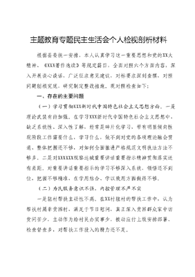 主题教育专题民主生活会个人检视剖析材料根据县委统一安排,本人认真学习这一重要思想和党的XX大精神、《XXX著作选读》等规定篇目,全面对照六个方面内容,深入开展谈心谈话,广泛征求意见建议,对标要求深刻查摆,对照问题刨根究底,研究制定整改措施。现对照检查如下:一、存在的主要问题(一)学习贯彻XXX新时代中国特色社会主义思想方面。一是理论武装有待加强。在学习XXX新时代中国特色社会主义思想中,缺乏系统性、深入性了解,经常是碎片化学习,带有明显倾向性现阶段工作需要什么,学习什么,做不到对党的各项理论融会贯通、整体把握还不够,对如何全面推进严格规范文明执法方法不够多。二是对XXXXXX视察运城重要讲话重要指示精神贯彻落实还有差距。对重要讲话重要指示的学习不够深入系统,领悟还不到位,把握不够精准,在学用结合、学以致用方面做得不够。(二)为民服务意识不强,内控管理不严不实一是驻村帮扶主动性不高。在XX村驻村的帮扶工作中,认为帮扶村属非贫困村,满足于节日慰问,真正深入贫困群众家中访贫问苦少,主动作为给村民办实事少,被动应付上级安排部署、检查督查多,对帮扶工作投入的精力还不足。二是工作管理要求不严。对个别股室在推进改革、管理、建设等工作上存在的进度不快、效率不高等问题,没有及时提醒督促、批评教育。对推进权责清单的监管工作缺乏通盘谋划和思考存在事项底数不清、监管措施不明的情况。三是财务管理把关不严。还存在个别发票无经手人、个别工会经费列支无领取人员名单、无出差事由支差旅费的问题。(三)履行管党治党政治责任有差距,党组织建设不够规范一是执行纪律的规矩意识不到位。严格审视自身,在党的纪律方面我可以做到坚定理想信念,坚守党的宗旨,但对班子成员一岗双责履行、廉政谈话的落实上有所忽视,比如一些工作时间紧、任务重,任何事项为工作进度让路,将规章制度放在一边,存在先上车后补票情况。二是贯彻民主集中制度还有偏差。虽然在主任办公会上做到了三重一大实行表决机制,但是发扬民主还有差距。决策中对于集体原则坚持得不够好,会议讨论附和多、建议少,一定程度影响最佳决策。三是党内政治生活质量有待提高。班子成员之间敞开心扉谈思想、讲问题少,特别是在开展批评和自我批评时,以自我批评为主,相互批评大多浅尝即止,红脸出汗还不够。二、原因剖析针对以上存在的问题,我由表及里地进行了深入剖析,主要是以下几个方面的原因。(一)理论学习不够系统。学习XXX新时代中国特色社会主义思想和党的XX大精神的深入性、全面性和系统性不够,以新思想定向领航、从新思想中寻策问道的政治自觉、思想自觉、行动自觉有待进一步加强。对抓好理论武装的紧迫性认识不足,学习的积极性主动性不够,平时更多是把精力放在了机构改革等业务硬指标上,对新思想中蕴涵的马克思主义世界观和方法论立场、观点、方法未能全面掌握,用新思想武装头脑、指导实践,推动工作还需持续加强。(二)担当作为不够坚定。工作中有时强调客观因素,不自觉地存在畏难情绪,不敢碰硬,不敢创新,尤其是在面对急难险重任务时,缺乏采用非常手段解决非常问题的胆识和魄力,苦干实干精神有所减退。对机构改革满足于开会发文、改革成效缺乏巩固,存在上级抓得紧,下面才抓得严的现象,工作抓在平时、抓在经常、重在落实的自觉性有待持续提高,缺乏钉钉子精神和水滴石穿的韧劲。(三)宗旨意识不够牢固。全心全意为人民服务的宗旨意识树立的还不牢,没有时时、事事站在群众的立场思考问题,没有把为人民服务贯穿始终。尽管也为群众做了一些事情。但在工作中满足于安排部署,缺乏调研主动性,针对群众最盼、最急、最忧的问题开展调研不深、了解不透,对了解到的问题也没有及时开展有针对性的工作及时纠偏。(四)党性锤炼不够深刻。在抓班子、带队伍履行第一责任人责任上不够,以上率下、带头示范作用发挥不够;对办机关干部执行党纪党规,满足于会上讲一讲、平时提一提,还缺少相应制度和机制作保障;对加强党性修养和党性锻炼重视不够,忽略了经常性抓党性修养以及自身对党员先进性和纯洁性的追求办党支部的政治建设和组织生活还要进一步加强。三、整改举措(一)坚持不懈强化理论武装,铸牢理想信念之魂。将学习贯彻XXX新时代中国特色社会主义思想和党的XX大精神作为第一要务,努力提升政治判断力、政治领悟力、政治执行力,进一步提高学习质量和效果。通过专题学习研讨、个人自学等方式,读原著、学原文、悟原理,坚持重点学与一般学相结合,集体学和自学相结合,全面学和具体学相结合,坚持以学促干、以学促行,依靠学习铸牢信念、增长才干。(二)立足本职增强斗争本领,突出担当作为之要。要深入学习贯彻XXXXXX关于机构编制工作的重要指示精神,突出重点、找准定位,在机构改革、实名制管理、事业单位运行评估等工作上下功夫、出实招,扎实推进各项任务落地见效。紧紧围