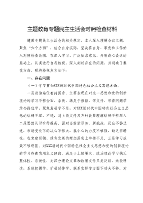 主题教育专题民主生活会对照检查材料遵循专题民主生活会的相关规定,本人深入理解会议主题,聚焦六个方面,结合自身实际,坚决将自身、职责和工作纳入对照检查范围。在深入学习、广泛征求意见、开展谈心谈话的基础上,认真进行自我检视,深入剖析存在的问题,并明确了整改方向。现将检视发言如下:一、存在问题(一)学习贯彻XXX新时代中国特色社会主义思想方面。一是政治站位有待提升。主要表现在对这一思想和党的创新理论的学习不够全面、系统,满足于报纸、学文件,带着问题学结合岗位学、聚焦发展学不足,对XXX新时代中国特色社会主义思想的钻研不深、不透,对上级文件及方针政策理解钻研不够深入二是思想认识有待提高。面对当前新形势、新挑战,反应不够迅速,市场变化下的决心不够大,抓中心的力度不够强,缺乏前瞻性,在党建引领、绿色发展的理念落实上举措不足。三是学习成效不够明显。对XXX新时代中国特色社会主义思想和党的创新理论的学习存在实用主义倾向,满足于上级要求,政治理论学习缺乏整体性、系统性,对部分理论文章和政策文件只是泛读,未能精读,系统把握学、扩展延伸学、联系实际学方面下功夫不够。对新发展阶段、新发展格局、新发展理念的学习不够,尤其是紧密结合高质量发展实际等方面的学习不足,学习的前瞻性、针对性指导性有待提高。(二)维护党中央权威和集中统一领导方面。一是政治站位需要提高。对XXX新时代中国特色社会主义思想和中央的重大决策,理解得不深不透,没有真正领会贯通。思想比较保守,行动相对滞后,缺乏高层次的思路和改革的举措。二是贯彻落实上级党组织的决策部署要更好。虽然对高质量发展很有信心,但落实上级决策的效率和质量还需提升。有时候重安排轻落实,缺乏督查。在创新发展上,主动寻求新方法、新举措、新思路不够,导致一些工作推进中各部门习惯于按部就班效果不明显、特色不突出、方法不多、力度不大。三是国之大者的理解和把握不够到位。虽然努力关注党中央和省委、省政府关心什么、强调什么,但对抓好XX等工作的重大意义理解得不深不透,对肩负的责任感和使命感认识不够到位,站在国之大者的政治高度和工作力度去工作的程度也不够。(三)践宗行旨、服务人民方面。一是服务群众尚显积极主动不足。例如,在处理群众的急难愁盼问题上,我们的积极性与主动性有时未能充分展现。我们往往将解决问题的责任传递给承办单位,但对于部分诉求,我们并未亲自研究并跟踪督办,这无疑影响了问题的解决率以及群众的满意度。二是满足人民群众的新期待与要求上仍有差距。尽管我们以我为群众办实事实践活动为载体,积极倾听人民群众的意见建议,并对相关问题进行研究及处理,但我们对不同群体的多样化、个性化、特殊化新需求尚未全面了解和系统把握,回应各方关切、兼顾各类诉求的及时性、科学性、合理性仍有待提升三是工作落实未能形成闭环。在接到党中央、国务院以及省委、省政府的文件后,我们对文件的研究不够深入,未能创造性开展工作,而是机械教条地执行,导致许多政策落地不够精准。很多时候,我们的工作仅停留在开会、部署、交办下级落实,而靠前指挥、督导跟踪的工作做得不够到位,亲临现场检查复核的次数较少,对具体业务工作、关键环节把关不严,仍存在走过场、形式主义的问题。(四)求真务实、狠抓落实方面。一是未能充分展现领导者的冲锋在前的精神。在面临艰巨任务时,思想上有过多的得失顾虑,行动上表现为等待、依赖和拖延的现象。作为团队的核心,未能以自身的实际行动为全体党员干部树立榜样,强化决心,提高工作要求。在遇到实际困难时,有时会产生懈怠的想法。二是职能作用发挥不充分,尽管在推动高质量发展方面进行了大量的思考,但在担当精神和职责使命上仍与上级要求存在一定差距。在面临重大任务和繁重工作时,有时创造性开展工作的思路并不明确,需要在做事必细、干事必精的能力上进一步加强。三是细节把握不够到位。对日常工作的部署不够细致,有时过分关注结果,而忽视了过程和细节。结合实际情况推动工作的力度不够,有时仅停留在会议和文件层面缺乏对落实情况的监督指导和跟踪问效。因此,需要树立钉钉子精神,坚定一抓到底的决心,以确保工作的落实达到预期效果。(五)以身作则、廉洁自律方面。一是政治敏感度有待提高。对于四风问题的苗头和倾向性,认识不够深刻,抵制力度不足。在处理相关问题时,未能站在维护党的形象、强化党性观念、保障人民利益、坚持原则的高度进行批判性处理。二是廉洁建设方面存在弱化现象。对廉洁建设的理解存在偏差,例如,过分关注显性指标的扩大和提升,却将廉洁建设视为自身发展中的次要因素,没有将其纳入建设和发展规划的重要位置进行统筹规划。因此,廉洁建设成果的转化效率较低。三是家教家风建设的深化存在不足。在研究推动家庭、家教、家风方面不够积极,未将家庭家教家风纳入日常监督管理范围,对家庭、家教、家风建设的重要性认识不足,未