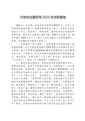 市政府主要领导2023年述职报告2023年,在省委、省政府和市委的坚强领导下,在市人大、市政协的监督支持下,我团结带领政府一班人,牢牢扭住经济建设这个中心,真抓实干,砥砺奋进,推动经济社会发展取得显著成效。地区生产总值同比增长7%,增幅列全省第一位,粮食产量达1000亿斤以上,城乡人均可支配收入取得显著增长。现将一年来履职尽责情况汇报如下:一、坚决做到两个维护,自觉同党中央保持高度一致坚持政府的一切工作就是贯彻落实XXX新时代中国特色社会主义思想,坚定不移贯彻XXXXXX重要讲话重要指示批示精神,对标对表、主动看齐,把中央和省决策部署同我市实际紧密结合、有效落实。统筹运用三长三短辩证法,在维护国家五大安全、推动五个要发展上持续发力。二、强化党的全面领导,始终把政府政治建设摆在首位。按照组织安排,参加了干部培训班学习,使我接受了一次全面的政治历练、思想淬炼、专业训练,更加把对XXXXXX、对党中央的绝对忠诚作为立身之本、为政之要,更加胸怀两个大局、心系国之大者,政治判断力、政治领悟力、政治执行力进一步提高。一是贯彻民主集中制。坚持把实行民主集中制作为加强集体领导、增强班子团结的利器,凡事相互支持、协作配合,特别是在三重一大事项决策上,充分发扬民主、集思广益,确保决策的民主性和科学性。二是发扬斗争精神。在重大原则问题和大是大非面前立场坚定、态度鲜明,面对秸秆禁烧、污染防治、教育双减、食药安全等矛盾多发领域,迎难而上、敢于负责,推动重点难点问题有效解决。三是严守政治纪律和政治规矩。牢记五个必须、五个决不允许要求,严格执行党章和新形势下党内政治生活若干准则,积极参加双重组织生活,时刻警惕、防范七个有之现象,时时处处按新时代好干部标准要求自己,做政治上的明白人。三、聚力经济建设中心,坚决扛起高质量发展使命担当。以完整、准确、全面贯彻新发展理念引领高质量发展,主动服务和融入新发展格局,心无旁骛加快发展。一是全力推动产业振兴。深入贯彻落实党的XX大精神和省委全会、省委经济工作会议部署要求,坚持大抓工业、狠抓产业,做好企业入规入统工作,努力打造农副产品精深加工、高端装备、新能源、新材料等优势产业集群。二是强化创新驱动发展。着力发展数字经济,成功国家级项目20个,其中高新技术创新创业服务中心成为国家级创新创业平台,理工大学科技园晋升国家大学科技园。三是实现招商和项目突破。组织央企对接,达成战略合作,推动百大项目建设投资超100亿元。全年固定资产投资、规上工业增加值增幅位列全省第12名。统筹发展和安全,全面落实安全生产第一责任人职责,全年未发生重特大安全生产事故,安全生产事故起数和死亡人数连续5年下降。自觉守好政治安全和意识形态主阵地,坚决遏制地方政府隐性债务风险,全面落实第3轮第3批中央环保督察反馈问题整改,牢牢守住了不发生区域性、系统性风险的底线。四、着力推动思想解放,更好融入服务全国全省发展大局进一步解放思想、转变观念,按照国家赋予我市的特殊战略定位,自觉将我市摆进全国、全省的发展大局中。把握国家碳达峰碳中和机遇,着眼发展新能源产业,整合全市风力资源,换来与各国的战略合作。把握国家推进高端电子产品国产化、智能化的历史机遇,发展高端电子产业,成功争取到电子产业园区落地。笃定攀高晋位、赶超跨越、争先创优之志,抓牢经济建设这一中心工作,加强经济运行调度监测,确保经济加快发展、加速增长。GDP和实际利用内资增幅位列全省第一,创下七年来最好水平。五、始终坚持人民至上,秉持勤政为民廉洁为公的作风。一是始终把人民摆在心中最高位置,全力以赴办好就业、教育、医疗、社会保障等方面的20件民生实事,以财力可及办成了普惠全民的大好事。二是对标先进抓营商环境,小微企业贷款增速位列全省第一,新增市场主体同比增长超全省同等地市%,城市信用综合排名位列全省第一。围绕发展实体经济,出台《市推进民营经济发展四十条措施》,落实助企纾困政策,市场主体信心活力明显增强。三是以能力建设提升年活动为契机,持之以恒开展走千企访万户和我为群众办实事活动,全面落实五细要求,大力弘扬工匠精神,推动各项政策措施精准落地,切实提高抓落实的能力。四是严格遵守中央八项规定及其实施细则精神和省委九项规定,带头坚持和发扬艰苦奋斗作风,坚持勤俭办一切事情,持续抵制和纠治四风,做好为基层减负各项工作。六、推进政府自身建设,认真落实全面从严治党要求。作为市政府主要领导,认真履行政府党组党风廉政建设第一责任人的职责,注重加强对班子成员的廉政提醒和教育,经常开展谈心谈话,按规定报告个人重大事项,时时处处按照党员领导干部相关规定要求约束自己,主动接受人大、政协和社会舆论监督。在市委的统筹部署下,扎实开展政府系统党史学习教育,以上率下、以身作则,带头讲