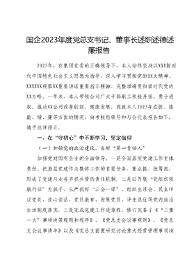 国企2023年度党总支书记、董事长述职述德述廉报告2023年,在集团党委的正确领导下,本人始终坚持以XXX新时代中国特色社会主义思想为指导,深入学习贯彻党的XX大精神、XXXXXX视察XX重要讲话重要指示精神、完整准确贯彻新时代党的XX方略。一年来,本人带领公司广大干部职工积极开拓、勇于进取,推动XX公司改革创新、健康发展。现就本人2023年在德、能勤、绩、廉等方面的情况,向考核组领导和与会代表报告如下,请予批评指正。一、在守初心中不断学习,坚定信仰(一)加强党的政治建设,当好第一责任人加强党对国有企业的全面领导。一是全面落实党建工作主体责任。把基层党建作为整体工作的首要任务,重点抓、统筹抓,形成了党建与业务齐抓共管的责任机制。二是以开展党组织领航行动为抓手,从严抓好三会一课、组织生活会、民主评议党员、谈心谈话、党员教育、发展党员、评先选优等党内政治生活制度落实。三是完成党建工作进章程,修订完善了《三重一大事项决策规则和程序》、《党总支会议事规则》、《党总支会议事清单》以及《党总支前置研究讨论重大经营管理事项清单》、《党总支书记和其他班子成员抓党建工作责任清单、问题清单、任务清单》,进一步保障党的领导融入公司治理、嵌入经营管理。(二)加强思想建设,坚定理想信念一是带头积极参加XX党委组织的主题教育读书班,通过学习必读书目和选读书目、聆听XXX党校专家讲座、进行交流研讨等多种形式,确保学习效果。二是坚持把党的XX大报告、《XXX著作选读》作为党总支落实第一议题的重要内容,组织集中传达学习XX次。紧紧围绕树立和践行正确政绩观学习运用浙江千万工程经验案例提升三种能力学习践行浦江经验坚决杜绝低级红、高级黑现象及以学铸魂、以学增智以学正风和以学促干等规定内容,X次深入开展集中学习和研讨交流,以深学、细悟、笃行为头脑充电、为精神补钙、为发展赋能三是组织召开公司党总支会议XX余次,对改革发展、人事任免、项目建设、党建暨党风廉政工作年度计划及专项落实方案等议题通过党总支进行讨论,实现了党总支把方向、管大局、促落实方面更好发挥作用。二、在明定位中加强实践,恪尽职守(一)全面夯实基层基础,促进党建与生产经营深度融合一是高质量开展党的组织生活。按期开展专题组织生活会,积极开展党旗映XX系列主题党日活动。组织开展了XX心向党巾帼展风采、消除隐患齐聚力共筑安全迎五一、XX心向党清明祭英烈铭史勇担当、庆祝中国共产党成立102周年党旗映XXXX心向党、民族团结一家亲喜迎双节共奋进、强作风、守纪律、正作风等专题教育活动。二是不断加强职工队伍建设。第一,加强管理人员队伍建设。严格贯彻落实《干部任用条例》,坚持把讲政治作为第一标尺,今年通过公开竞争选拔调整中层管理干部X名。第二,加强年轻干部队伍建设。加大苹果接班人计划后备干部及优秀年轻企业领导人员选拔培养力度,优化培养方案推动人才建设取得新突破。第三,开展师带徒。帮助应届毕业生尽快实现角色转换,提升专业技能,今年X名员工完成出徒答辩。三是加强党员队伍建设。第一,树立先进典型。今年公司对X名优秀共产党员、X名先进生产工作者、X个先进生产班组科室进行集中表彰,引导公司党员干部职工对标对表先进,弘扬公司正能量。第二,规范发展党员工作,把政治标准放在首位,重视在一线青年职工中发展党员,今年按期转正党员X名,新发展X名预备党员。第三,严格履行党员义务,按时收缴党费,2023年共收取党费X万元。(三)开拓思路,市场开发稳中求进一是扩大范围,提升业务总量,积极搜集各大招标网的信息并参与投标,截至目前参与投标项目共计X个;中标项目X个。二是主动适应调整意识、质量意识、效益意识、服务意识,提升专业化服务能力,打造专业化服务品牌。三是探索高端经营新方式努力进入规划行业,对潜在市场的城市、交通等进行顶层规划设计,协助顾客制定建设计划、项目建议书、项目可行性研究,做业主和政府部门决策的智囊,主动引导需求,创造项目。四是依托集团省内九大区域总部、省外经济总部、海外市场资源配置,加快市场布局,全面落实XX市场开拓战略。五是依托集团的平台,积极与外部(XX、XX等)单位保持良好沟通,在市场上寻找战略合作方共同开拓利润较高的中高端市场(高速公路、一级公路等设计咨询服务)。三、在促改革中履职尽责,助推公司发展一是推进董事会规范有效运行。设置内部董事X名、外部董事X名,强化董事会对经营层的监督和管理的责任。作为公司董事长积极出席、组织相关会议,认真审议董事会各项议案,为公司的经营献计献策,不断推进董事会在定战略、作决策、防风险方面更好发挥作用,积极促进董事会科学决策,公司规范运作,切实维护国有资产保值增值。二是完善质量管理体系文件和《生产部门