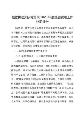 城管执法大队党总支2023年度基层党建工作述职报告 2023年,城管执法大队党总支在局党委坚强领导下,深入学习贯彻XXX新时代中国特色社会主义思想和考察湖北重要讲话精神,以主题教育为契机,不断推进党建工作全域覆盖、全面落实,以高质量党建引领城市管理执法工作推进发展。根据会议安排,现将2023年度党建工作情况述职如下:一、2023年度基层党建主要工作(一)抓牢着重点,让主题教育走深走实一是高位部署,统筹推进。结合城管工作实际,精心制定主题教育活动方案,拟定目标要求、组织领导成员、时间进度安排等内容。将《XXX新时代中国特色社会主义思想专题摘编》作为学习主线,贯穿始终。二是严格落实,纵深推进。通过三会一课等及时跟学习XXXXXX最新重要讲话,开展学习讨论。认真召开学深悟透思想,推进基层支部规范化建设、用主题教育学习实效指导基层城管执法工作实践四下基层以人民至上,引领城管发展大显身手等主题教育专题党课3场。发放主题教育必读选读书籍,通过开展支部共学、领读原文,组织个人深学、分享心得体会,推动全体党员认真学习原著、感悟原理、总结思想。三是调查研究,见行见效。将主题教育与大兴调查研究工作相结合,相继开展共享单车治理、工地渣土监管、油烟污染治理等专题调研工作。通过飞检模式、一点一策,利用闲置空地的应急中转区,严格控制单车总量,有效降低热点地区共享单车压力,缓解潮汐现象。通过道路巡查+卡点值守+工地守控的巡查巡检模式,结合工地双语音视频监控平台和车辆北斗定位系统,线上+线下全方位监控管理模式,有效提升了工地渣土控管效果。通过对重点区域、新建楼宇区域提前布局推广油烟净化设备,加大违法行为查处力度,落实区街巡执分离机制等。(二)把稳基本点,让理论学习入脑入心一是严肃党内政治生活。认真组织大队全体党员干部深入学习贯彻XXX新时代中国特色社会主义思想和党的XX大精神,深入贯彻落实XXXXXX考察湖北武汉重要讲话和指示批示精神。将各类学习活动贯穿到每月支部主题党日学习活动中,全年召开主题党课活动*场,创意主题党日我来开活动*场。认真召开专题组织生活会,对标查摆问题,严格整改落实,带头做到坦诚互评,提出意见,实现促进工作,帮助同志,增进团结的目的。坚持学习工作在一线,解决问题在一线,有力推进基层支部建设。二是注重思想教育引导。在不断丰富形式、把握时机、增强针对性上下功夫。加强意识形态教育,充分利用学习强国、干部学习网等网络学习平台组织党员学习提高,践行XXX新时代中国特色社会主义思想,时刻做到讲政治、顾大局、守底线,始终增强四个意识、坚定四个意识、做到两个维护。鼓励党员干部参加不同形式的文体活动,组织开展健步行活动、砥砺奋发拥抱春天春游主题活动、参观江夏革命烈士纪念馆等,促使思想教育方面取得更多良好成效。三是做好心得体会交流。组织党员深入开展读原著、学原文、悟原理,领会核心要义,把握精神实质。在个人自学的基础上,突出互动交流,在交流中互相启发、取长补短,在讨论中深化认识、坚定信念,营造出互帮互学的良好氛围。(三)夯实着力点,让党建引领制度建设一是强化纪律建设。始终绷紧廉洁自律这根弦,严格督促大队班子成员履行一岗双责,将党风廉政建设工作责任分解落实,形成一级抓一级,层层抓落实的责任体系,发挥党员领导干部头雁效应带头严格遵守政治纪律和政治规矩。认真贯彻落实执行《中国共产党廉洁自律准则》和中央、省、市、区有关领导干部廉洁自律各项规定,做到严于律己、严负其责、严管所辖。召开党风廉政建设和反腐败专题工作会议,部署年度工作任务,全体党员干部廉洁意识得到进一步提升。二是规范作风建设。充分发挥党支部战斗堡垒和党员先锋模范作用,组织开展党风廉政教育系列主题活动,切实将廉政教育、党纪法规学习落实到每一名党员,推动党风廉政建设不断走深走实。同时,定期开展规范执法警示教育学习活动。通过学习集中观看了警示教育短片、以案为鉴,全年开展廉政教育培训活动4次,印发督察通报*期,通报表扬*人次,通报批评*人次。进一步树立以人民为中心的发展思想,坚守严格规范公正文明执法底线,依法全面正确履行职能职责,着力打造出高素质专业化城市管理执法队伍。三是增强队伍建设。广泛开展党员干部下沉社区活动,鼓励大队党员干部在积极完成居住地社区的下沉任务的同时,积极参与社区共建活动。组织大队党员参与共建社区的独居老人包保工作,政策宣传和入户走访工作,慰问工作及清洁家园等。(四)铆定落脚点,让党建业务深度融合二、存在的突出问题一是思想教育不够有针对性。在准确把握党员干部思想动态,抓住其关心关注的热点重点问题,丰富教育内容,采取因岗因人施教,提高教育的针对性、实效性等方面,做得不够深入。二是党建活动形式不够丰富。政治理