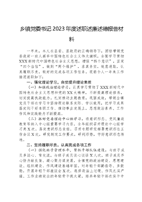乡镇党委书记2023年度述职述廉述德报告材料一年来,本人在县委、县政府的正确领导下,团结带领党委政府一班人高举中国特色社会主义伟大旗帜,全面学习贯彻XXX新时代中国特色社会主义思想,增强四个意识,坚定四个自信,做到两个维护,求真务实,锐意进取,认真履职尽责,较好的完成各项工作任务。现将个人一年来工作情况述职如下:一、强化理论学习,自觉提升理论素质(一)加强政治理论学习。认真学习贯彻了XXX新时代中国特色社会主义思想和党的XX大精神,不断提高理论修养,切实提高执政能力。扎实推动主题教育,巩固成效,带领全镇党员干部在学习中坚持理论联系实际、学以致用,把学习成果落实到干好本职工作、推动事业发展上,思想政治素养、工作作风和实践能力不断提高。(二)抓好党委理论中心组学习。将意识形态、党风廉政教育等纳入中心组重要学习内容,全年组织召开理论中心组学习共X次。落实意识形态责任,召开专题研究部署意识形态工作会议X次,研究制定工作要点,研判形势,守好意识形态阵地。二、坚持履职尽责,认真完成各项工作(一)强化班子管理水平,紧抓干部队伍建设。与班子成员多谈心、常交流,与班子成员谈心谈话X人次,班子成员齐心协力献良策、凝心聚力谋发展,全镇党的政治建设、思想建设、组织建设、作风建设基础牢固。对年轻干部勤指导、多鼓励,开展年轻干部座谈会X次,选择政治上过硬、作风扎实严谨、工作业绩突出的年轻骨干挑大梁,培养年轻干部在实干中提升研究能力和工作水平。(二)着重强化党员管理,发挥党员先锋作用。按照党员发展要求,严把党员队伍进口关,坚持从源头抓起,始终把政治标准放在首位,严格落实发展党员工作的各项制度,切实提高党员发展质量,全年发展党员X名。注重党员教育管理工作,在党员冬春训、新时代基层干部主题培训班授课X次,强化党员党性教育,推动党员在乡村振兴、森林防火、防洪抗旱等工作中主动作为,组织党员干部参与森林防火宣传巡查X余人次、抗旱送水X余人次,党员形象愈加光辉。(三)推进干部作风建设,不断提升治理效能。以开展X干部作风建设专项活动为契机,通过比干劲、比业绩、比作风、比奉献,在全镇广泛形成真抓实干、担当作为、比学赶超、争先进位的新常态。X月X日至X月X日,仅用X天时间完成全镇X个废弃矿洞的封堵任务;X月X日至X日,仅用X天时间超额完成恢复耕地工作任务X亩。(四)完善机制强保障,稳步推进项目建设。进一步深化项目为王工作理念,牵头制定《X民生工程项目建设实施方案》,亲自挂帅、亲上一线跑项目,前后X余次到县里、市里、省里汇报、争取X新建跨江大桥项目,目前已成功实现立项。反复对接X高速项目建设指挥部,争取高速公路延长线延伸至集镇,目前已取得初步立项意向。为在建项目提供优质的外围环境协调服务工作,X发电厂扩机工程实现超进度,X至X连接公路扩宽提质改造工程即将完工,集镇污水管网建设和停车场建设顺利完工。(五)不断优化营商环境,招商引资海纳百川。制定《X镇2023年度全民招商引资工作实施方案》,以真金白银鼓励全镇干部群众开展全民招商活动,营造浓厚的招商引资氛围。全年接待意向投资企业家X人次,主持召开了X有限公司投资参建新区X房地产开发建设项目配套设施附属工程合同签约仪式,出席了X村X厂开业仪式、X百货超市开业活动,成功实现招商引资X亿元,到位资金X万元。(六)脱贫攻坚成果巩固,稳步推进乡村振兴。一是对全镇X户X人脱贫户和X户X人监测户,实施全程监测,做到落实六类重点人群监测机制,应纳尽纳,应消尽消,应帮尽帮,确保政策落实,稳定增收。二是坚守一超过两不愁三保障防返贫底线,全镇脱贫户、监测户温定增收比例超X。充分利用最低生活保障政策、民政救助政策,保障困难群众基本生活。全年落实教育资助X万元,未发生义务教育阶段学生辍学现象。房屋安全鉴定X户,完成危房改造X户。完成困难群众城乡居民医疗保险资助参保全覆盖,实现100%参保率。(七)底线工作严防死守,强化责任守护净土。一是人居环境整治工作。全县人居环境季度考核第二季度排名第一,其余季度均排名第二,同时X村被评为X村部;X村被评为X;X村被X媒体称为X。二是安全生产工作。2023年,组织应急救援、地震灾害防治、灾情报送等相关业务培训,参加培训人数X余人次;建立镇、村两级应急救援力量X支,镇成立了X人民兵应急分队。全年镇、村应急处置森林山火、道路疏通、农村民房火灾、应急抗旱送水等任务X余次,出动工具装备X余台件,组织参加应急处置力量约X余人次。全镇排查治理各类隐患X个,道路安全隐患X处,基础设施隐患X处,消防安全X处,重点部位X处,全年没有发生较大安全生产事故。三是狠抓信访维稳工作。全年未发生一起进京赴省信访事件,重复信访案件X件,化解X件,化解率100%,有效维护了社会稳定。三、坚持依法执政,强力推进法治建设