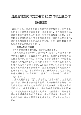 县应急管理局党支部书记202X年抓党建工作述职报告2022年以来,在局党委的正确领导和指导帮扶下,在党支部全体党员干部职工的团结协作、勇毅奋进下,作为党支部书记,我紧紧围绕年度党建工作目标,扎实开展目标细化分解,充分挖掘基层党组织的战斗堡垒作用以及党员干部的先锋模范作用,稳步推进党支部各项工作走深走细走实。下面,我就2022年度抓基层党建工作情况汇报如下:一、主要工作落实情况(一)持续加强政治建设,不断夯实思想根基。一是通过以身作则带。坚持把不忘初心、牢记使命作为加强自我教育、自我提高的终身课题,在党的创新理论武装头脑上先一步、深一层、多一分,当好学习贯彻……中国特色社会主义思想上的表率,围绕学习贯彻……中国特色社会主义思想和党的十九届历次全会、XX大大精神,以及国省市县的重大决策部署及重要会议精神,先后组织支部全体党员开展月度集中学习12次,通过原原本本学、联系实际学,切实引导支部党员增强了四个意识、坚定了四个自信、做到了两个维护。二是通过组织生活促。严格落实三会一课、主题党日、谈心谈话、组织生活会等党内生活,进一步强化党性锻炼,净化政治灵魂。今年来支部共召开党员大会6次,开展主题党日活动12次,带头上党课6次,局领导班子到直联村讲党课12次,带领支部全体党员重温入党誓词、过政治生日,组织党员群众集中观看优秀共产党员事迹,掀起了学先进、争先进、敢先进的热潮,持续巩固深化党史教育成效,更加坚定自觉初心使命。三是通过教育引导帮。积极开展党员革命传统教育先进典型教育、警示教育等活动,强化精准管理、动态管理,切实抓好党员学习教育工作,推动理论武装更加入脑入心、两个维护更加落实落细、履职尽责更加见行见效。(二)高度重视学习教育,学思践悟办好实事。一是坚持学思践悟,激励个人自学。在组织开展好集体学习外,倡导党员干部通过学习强国公众号等平台,多渠道、多层次、全方位认真做好个人自学,大力营造浓厚的学习氛围。同时多措并举不断解决好学什么、怎么学、做什么、怎么做的问题,敢于直面问题、主动查摆问题、及时整改问题,不断提升政治理论水平和担当意识、大局意识。二是坚持特色引领,强化学习效果。组织开展特色学习活动,深刻感悟革命精神、接受红色教育、锤炼党性修养。同时积极对接公司领导到党建联系点讲述了专题党课,进一步学习领会贯彻…………七一……精神,在党的十九届七中全会召开后,持续抓好迎接和庆祝党的XX大宣传活动,第一时间召开党员大会集中学习………………、《党的XX大报告》等文件精神,推动全会精神落地生根,形成指导工作实践的持久动力,促进年度目标实现的强大合力。(三)强化党员管理,增强党员队伍生机活力一是抓好发展党员工作。局党支部认真按照《中国共产党发展党员工作细则》、发展党员指导手册和发展党员规范手册有关要求,严格落实党员发展、转正标准和程序,按照年初发展党员的工作计划,今年已有2名同志转为正式党员,1名转为预备党员,8同志确立为发展对象。我局将严格按照发展党员程序开展发展党员的相关工作。二是扎实开展党费收缴工作。局党支部由专人具体负责党费收缴工作,并严格履行收缴党费手续,做到党费帐簿规范合理,做到党员交纳党费有登记,党支部上缴党费有收据,目前已按月足额收缴。(四)加强作风建设,继承弘扬党内新风正气一是持续改进工作作风。继承和发扬党的优良传统和作风,自觉践行党的群众路线,严格落实中央八项规定及实施细则精神,驰而不息地纠正四风问题,特别是形式主义、官僚主义问题。严格落实主体责任,切实把党风廉政建设的主体责任扛在肩上、抓在手上。二是全力推进岗位权力廉政风险防控工作。结合工作实际为深入推进党风廉政建设和反腐败斗争,坚持不懈把全面从严治党向纵深推进,一体推进不敢腐、不能腐、不想腐,积极拓展从源头上预防腐败的领域,提高岗位权力廉政风险防控能力,有效防止公权力异化、变质、滥用,确保公权力在正确轨道上运行。三是注重教育防控。坚持集中教育、专题教育与日常教育相结合,通过观看警示教育片,教育党员干部自觉在思想上划出红线、行为上明确界限、道德上坚守底线,引导党员干部知敬畏、存戒惧、守底线,本年开展警示教育3次。(五)常态化开展扫黑除恶斗争。一是领导不放松。根据年初工作安排,我处始终将扫黑除恶放在突出位置,作为一项重要常规工作抓落实,始终坚持思想上不松懈,工作上不放松,一如既往抓好各项工作落实,确保专项斗争有序开展。二是宣传不放松。充分发动群众和干部职工积极参与到扫黑除恶工作中来,全面宣传上级扫黑除恶专项斗争有关会议、成果等;在办公区域更新了扫黑除恶公告,新制作扫黑除恶横幅3条;利用工作群,适时推送扫黑除恶有关精神指示和相关知识。三是摸排不放松。各股室根据年度监督检查计划的要求,在开展安全生产监督检查的同时开展扫黑除恶专项