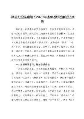 派驻纪检监察组长2023年述学述职述廉述法报告2023年,在常委会的坚强领导下,在分管常委的带领下,我坚持以XX为指导,深入贯彻XX精神和各级纪委全会精神,认真落实纪委常委会决策部署,立足派驻监督岗位职责,严格贯彻执行《纪检监察机关派驻机构工作规则》,充分发挥探头哨兵作用,做实做细派驻监督,深学习、提能力,细调研、抓落实,遵纪法、守底线,较好地完成了常委会部署的各项任务。现将本人2023年加强政治学习、履行工作职责、严格廉洁自律和学法用法守法情况报告如下:一、加强政治学习,锤炼忠诚品格一是强化理论武装。积极参加XX思想教育,严格对照学思想、强党性、重实践、建新功总要求,坚持个人自学与集体学习相结合,认真学习《XX纲要》《XX专题摘编》《XXX著作选读》等指定教材、必读书目,在全面学习、全面把握、全面落实XX思想上下功夫,用党的创新理论来指导工作实践、推动工作落实,在以学铸魂、以学增智、以学正风、以学促干中进一步提升了政治判断力、政治领悟力、政治执行力,深刻领悟两个确立的重大现实意义和深远历史意义,增强四个意识,树牢四个自信,做到两个维护,进一步增强了将学习成果转化为忠诚核心、维护核心、紧跟核心、捍卫核心的思想自觉、政治自觉和行动自觉。二是锤炼忠诚品格。全身心投入纪检监察干部队伍教育整顿,围绕铸就政治忠诚、清除害群之马、健全严管体系增强斗争本领目标任务,认真学习XXXXXX关于教育整顿重要指示批示精神和关于加强纪检监察干部队伍建设防治灯下黑的重要论述等指定材料和权威读本,立足学习教育、检视整治、巩固提升三个环节,认真学习贯彻各级纪检监察干部队伍教育整顿动员部署会议精神,充分认识开展教育整顿的重大意义,深刻领会纪检监察机关是党的纪律部队,派驻纪检监察组是推进全面从严治党的重要力量,在加强党风廉政建设和反腐败工作中肩负重要使命、发挥重要作用,必须提高政治能力、斗争精神业务本领、作风操守,自觉接受刻骨铭心的革命性锻造和深入灵魂的精神洗礼,确保党和人民赋予的权力不被滥用、惩恶扬善的利剑永不蒙尘,真正做到让党中央和XXXXXX放心、让人民群众满意。在检视整治环节,我围绕信仰缺失、政治动摇、放弃原则作风不正、滥用职权、清廉失守六个方面两轮共检视查摆问题XX个,查找廉政风险XX个,深入党性分析、剖析根源原因、明确努力方向和措施,目前已完成整改问题XX个。三是加强纪法业务学习。结合开展深学习、细调研、抓落实工作年活动,切实加强对党章、纪委工作条例、监察法实施条例等党纪法规的学习,不断巩固提升监督执纪问责和调查处置业务知识的储备;积极参加业务培训,集体学习《纪检监察机关派驻机构工作规则》严格执行最新条例法规,不断提升专项监督效能。二、发挥探头作用,做实派驻监督一是强化政治监督。按照委机关《关于开展三新一高专项监督的工作方案》,用好一台账、两清单、双责任、双问责监督机制,聚焦黄河重大国家战略、作风建设、营商环境、乡村振兴等专项监督,督促被监督部门单位根据职责分工制定责任清单,并根据部门单位责任清单制定跟进精准监督责任清单,结合两个清单任务,通过不定期明察暗访、每月召开专项监督调度会,每季度汇总工作进展情况,监督推动各项监督任务落实落细;按照委机关《关于做好政治监督活页建设工作的意见》部署安排,高标准监督推进被监督部门单位政治监督活页建设,通过开展专题培训、定期会商研判、下发问题清单、谈话调研等方式,共查阅资料XX份,下发问题清单XX份,我组XX个被监督部门单位政治监督活页已全部建设完成。二是做实日常监督。严格落实报备、参加三重一大事项要求,共参加被监督部门单位党组会议XX次,研究审核三重一大事项XX个,提出意见建议XX条;督促落实第一议题制度,把督促落实第一议题作为小切口,督促会前列出第一议题、会中真学细学并提出落实举措、会后及时跟进落实,全年共督促被监督部门单位落实第一议题XX次,督促整改问题XX个;做好廉政档案建档工作,完成XX个被监督部门单位副科级以上干部廉政档案XX份,动态更新XX名副科级干部廉政档案,新建XX名科级干部廉政档案;督促做好巡察整改,指导XX等单位制定巡察整改方案、整改台账共审核把关XX个被巡察单位整改方案、整改报告等材料XX份,提出意见建议XX条,督促全部按时召开巡察整改民主生活会,做好巡察整改社会公开等工作,参与指导专题民主生活会,督促制定整改措施XX条,已有XX个问题整改完成并长期坚持,XX个问题持续整改;开展驻点监督,对XX个被监督部门单位开展驻点监督,通过听取全面从严治党工作开展情况,查阅资料XX份,个别谈话XX人次,选取XX个重点项目开展下沉式监督,发现问题XX个并逐单位书面反馈;开展作风明察暗访,以落实中央八项规定精