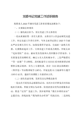 党委书记党建工作述职报告现将本人2023年履行党建工作职责情况述职如下:一、主要做法和成效(一)强化政治担当,压实党建工作主体责任一是认真履行第一责任人职责。主持召开5次会议研究党建工作,制定党建工作责任清单,与各支部书记签订2023年全面从严治党相关责任书。加强党委班子建设,完成新一届机关党委、纪委换届选举工作。完善党建工作联系点制度,开展支部达标创星活动。做好党员发展和入党积极分子的培养,3名预备党员按期转正,确定3名入党积极分子。二是严格落实第一议题学习制度。及时跟进学习XXXXXX系列重要讲话重要指示批示精神,带头上专题党课。结合《XXX谈治国理政》(第四卷)等读物开展学习研讨,开展党的XX大精神等专题学习研讨12次,邀请专家教授上专题讲座2次。(二)深化党建引领,发挥党员先锋模范作用一是扎实开展党员志愿服务活动。组织8名在职党员到居住地社区报到,开展文明行为劝导、防疫抗疫宣传等志愿服务活动,推进近邻党建工作。到乡镇开展我在乡间有亩田志愿活动,深化拓展我为群众办实事实践活动。二是深化五抓五做创建模范机关。制定《推进模范机关建设实施方案》,打造新闻阵地党旗红党建服务品牌,引导党员干部聚焦三提三效、聚力真抓实干,创作一批高品质的新闻宣传作品,2件作品分别获中国新闻奖二等奖、三等奖;3件作品获省级新闻奖,其中一等奖1件。单位入选全国1个市级新闻中心建设试点、全省推动地市级媒体加快深度融合发展现场会在桂林召开、作品获奖情况等融合改革成效写入县委十届七次全会工作报告。(三)坚持党管宣传,落实意识形态工作责任一是加强意识形态阵地建设和管理。认真贯彻落实《中国共产党宣传工作条例》,制定意识形态工作责任清单,严格落实三审三校,定期排查意识形态领域风险隐患,全面梳理意识形态风险点,确保XX大期间刊播安全。二是守正创新做好思想舆论工作。以迎接宣传贯彻党的XX大为主线,策划推出深入学习宣传贯彻党的XX大精神等多个专题专栏,为推动地区高质量发展示范区建设营造良好舆论氛围。省出版物监测与研究中心充分肯定中心开展的相关宣传报道,认为党的XX大宣传有声势、有氛围、有特色、有温度。一年来,我坚持以问题为导向,抓好2022年主体责任检查反馈问题和2022年度党建述职中查摆问题的整改工作,目前相关问题已整改到位。二、存在问题及原因2023年党建工作虽然取得了一定成绩,但对照上级对党组织书记抓党建的工作要求,还有一些差距和不足:一是压力传导不够到位。在落实全面从严治党过程中有时要求不够严不够实,注重用目标责任书和专题会议部暑等方式推进落实,对下属单位主体责任落实跟踪检查力度不够。二是党建品牌打造不够充分。党建工作亮点不够突出,品牌创建的氛围营造不够浓厚,党建引领作用和党员先锋作用没有很好的提炼总结,品牌引领效果不够明显。三是教育管理不够严格。与普通干部职工谈话谈心较少,更多的是交流业务和工作,对党员干部严加管理做得不够,未能及时教育纠正个别党员工作作风不实等问题。产生问题的主要原因:一是思想认识有所欠缺。有的党员干部对党建工作重视不够,抓党建工作创新性、主动性和积极性不高。二是落实要求不够严。对基层党组织从严督促不够,导致部分党支部落实组织生活等制度不够到位,影响了党建工作整体水平提升。三是机制不够健全。党员干部学习教育、追责问责机制不够完善,有时监督管理不实、制度落实不够到位,致使个别党员党性淡簿,宗旨意识有所淡化。三、下一步思路和措施一是强化主体责任意识,完善责任落实机制,以学习宣传贯彻党的XX大精神为动力,认真落实中央和省市委决策部署,聚焦三提三效、聚力真抓实干,全面落实从严管党治党的新要求,细化党建工作责任清单,层层传导压力,从严从实落实党建工作责任,切实将党建工作任务扛在肩上、抓在手上、落实在行动上。二是深化党建引领作用,牢固树立抓基层强基础的鲜明导向,持续抓好基层党支部达标创星工作,深入开展新闻阵地党旗红党建品牌创建活动,推动党建工作与业务工作双提升,促进媒体深度融合发展,彰显党媒担当与作为,为地区高质量发展示范区建设提供强有力的舆论支撑。三是加强日常监督管理,严格落实三会一课制度,加强对党员的教育管理,进一步增强党员的先进性,推动党员立足本职岗位,发挥先锋模范作用。完善党建工作联系点制度,深入开展调查研究,加强对下属单位和党支部监督指导,筑牢组织战斗堡垒,不断提升基层党建工作水平。