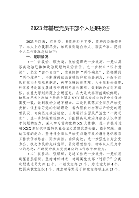 2023年基层党员干部个人述职报告2023年以来,在县委、县政府和乡党委、政府的坚强领导下,本人全力履职尽责,始终做到清白为人、踏实干事。现将个人工作情况总结如下:一、履职情况(一)讲政治、顾大局,政治意识进一步提高。一是认真落实政治纪律和政治规矩的政治责任。进一步树牢四个意识、坚定四个自信,忠诚拥护两个确立,坚决做到两个维护,不断增强政治敏锐性和政治鉴别力,不折不扣执行党内各项规章制度,树牢正确的世界观、人生观和价值观,科学看待改革发展进程中遇到矛盾和困难,做到政治方向不偏移。在重大原则问题上立场坚定,在大是大非面前旗帜鲜明,始终在思想上政治上行动上同以XXX同志为核心的党中央保持高度一致,做到政治立场不糊涂。二是认真落实全面从严治党责任。注重学习党的创新理论,着力强化对全面从严治党的思想认识,切实坚定政治站位,认真履行全面从严治党一岗双责,进一步加强党性修养,不断提高从政治角度去认识和思考问题的能力。深入学习贯彻党的XX大精神,进一步提升运用XXX新时代中国特色社会主义思想武装头脑、指导实践、推动工作的能力,坚持将全面从严治党与毫不放松履行意识形态工作责任相结合,同步共推,确保实效。进一步强化自身立党为公、执政为民的先锋意识,坚定理想信念,树牢以人民为中心的思想,不断提升服务党员群众的工作水平和能力。(二)抓基础、强组织,党建工作进一步提升。一是织密建强基层组织。坚持对标对表,对所属党支部过筛子分类定级先进党支部11个,一般党支部24个,后进党支部4个,软弱涣散党组织1个,建立领导党员干部党支部联系点23个,并完成全部软弱涣散党组织和后进支部的整顿提升。抓实五个规范深入推进村民小组党支部规范化建设,大力推行村级事务阳光工程,建强基层战斗堡垒。完成10个村(社区)大岗位制调整,进一步选优配强村干部,村两委高学历化、年轻化的趋势提速。二是建强乡村党员队伍。严把政治入口关,新发展党员17人、吸纳入党积极分子28人。排查十八大以来发展党员174人,涉嫌违规违纪发展党员49人,不承认党员身份2人,给予批评教育1人,提醒谈话46人,党员队伍质量进一步提升。以学习宣传贯彻党的XX大精神为主线开展万名党员进党校、善洲故里先锋行示范培训班1期105人,组织开展忆先贤、守初心,缅怀杨善洲老书记主题活动1次,全覆盖开展农村党员冬春训5期,开展云岭先锋夜校12期,严格落实三会一课、主题党日、组织生活会等制度,督促农村党组织组织生活和理论学习规范开展,农村党员党性进一步增强。健全基层党组织和党员我为群众办实事长效机制,全乡40个基层党组织领导班子共制定重大民生实事计划216件,全乡各级党员领导干部结合职责制定为民办事清单595件,全部办结,党员服务群众能力进一步增强。三是抓实抓党建促乡村振兴提升区工作。深入推进干部规划家乡行动,按照看得见山,望得见水,记得住乡愁的原则完成实用性村庄规划编制3个,绘制了乡村振兴蓝图;立足各村实际,完成村(社区)党组织领办合作社3个,进一步完善双绑利益连接机制,促进农户增收、村集体增效,村党组织的凝聚力、组织力和战斗力进一步增强。成功创建后寨村产业振兴、坪子地村烂泥塘人居环境提升2个基层党建示范点,提供了乡村振兴的县域经验。(三)讲规矩、守底线,纪律意识进一步增强。一是认真落实党风廉政建设工作责任制。将纪律教育作为党员教育培训的必修课,通过理论学习和案例教学相结合,强化农村党员底线意识。做到党风廉政工作与分管业务工作同研究、同安排、同部署,扛实党风廉政一岗双责政治责任。与分管部门、所挂村专题安排部署党风廉政工作各2次,引导教育下属职工和挂联村村干部强化廉政意识,自觉带头遵守相关规定,培养良好家风,全年开展廉政家访2次、廉政谈话4次。二是认真落实廉洁自律责任。带头强化自身执政能力建设,毫不放松抓实廉洁修身教育,做到谨言慎行,自觉抵制腐朽生活方式的侵蚀影响,不断增强勤政廉政意识,从严落实中央八项规定精神要求,严格执行廉洁从政各项纪律要求,做到任何时候都不为自己谋私利。毫不放松抓实廉洁齐家教育,始终注重对配偶、子女和挂钩村党总支书记以及家属的廉政教育,坚持从小事抓起,率先垂范,从严要求,使他们牢固树立廉洁自律、艰苦朴素和遵纪守法意识。三是严格落实意识形态工作责任。不断提高对意识形态工作极端重要性认识,紧紧围绕全乡中心工作任务,抓牢党员干部培训,积极督促干部在线学习,发挥思想引领、舆论推动、精神激励的重要作用,认真与分管部门、所挂村分析研判,及时发现并解决苗头性、倾向性问题,牢牢把握意识形态工作的领导权和主动权。二、存在的问题(一)理论知识学习不深不透。忙于事务性的工作,对理论学习没有一个系统的学习计划和落实措施,在一定程度上把学习作为应急手段,急着干什么