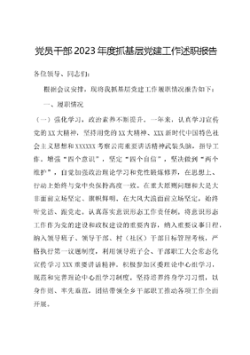 党员干部2023年度抓基层党建工作述职报告各位领导、同志们:根据会议安排,现将我抓基层党建工作履职情况报告如下:一、履职情况(一)强化学习,政治素养不断提升。一年来,认真学习宣传党的XX大精神,坚持用党的XX大精神、XXX新时代中国特色社会主义思想和XXXXXX考察云南重要讲话精神武装头脑,指导工作。增强四个意识,坚定四个自信,坚决做到两个维护,自觉加强政治理论学习和党性锻炼修养,在思想上、行动上始终与党中央保持高度一致。在重大原则问题和大是大非面前立场坚定、旗帜鲜明。在大风大浪面前立场坚定,始终听党话、跟党走。认真落实意识形态工作责任制。将意识形态工作作为党的建设和政权建设的重要内容,纳入重要议事日程,纳入领导班子、领导干部、村(社区)干部目标管理考核,严格执行第一议题制度,利用领导班子会、干部职工大会常态化宣传学习XXX重要讲话精神。积极参加区委理论中心组学习,规范和完善理论中心组学习制度。坚持培养终身学习习惯,以身作则、率先垂范,团结带领全乡干部职工推动各项工作全面开展。(二)坚定目标,法治建设不断推进。我始终紧扣法治建设目标要求,认真贯彻落实依法治国的基本方略,严格依法履行法定职责,认真履行学法用法第一责任人责任,时常把学法摆在首位,遵循重大决策依法、开展工作合法、遇到问题找法这一思路,将法律意识贯穿于各项工作中,严格做到依法办事、依法行政。严格落实第一议题制度,带头深入学习贯彻XXX法治思想,贯彻落实XXXXXX关于法治建设的重要指示精神。坚持重视法治素养和法治能力的用人导向,加强法治工作队伍建设和政法机关领导班子建设。组建普法小分队,开展集中法治宣传,全年累计组织开展宣传教育活动场12次,发放法治宣传资料7000余份,解答法律咨询100余人次,法治副校长上法治课16次,累计受教育人数5000余人次,全乡人民群众的法治水平和法治意识不断提高,实现从命案高发频发到4年多无命案发生的巨大转变,法治建设成效显著。(二)夯实基础,基层堡垒不断筑牢。坚持把党建工作与全乡发展建设工作同部署、同安排、相融合、共促进,完善领导班子成员一岗双责制度,根据主要领导分片挂钩、领导班子成员分村挂钩的原则,形成齐抓共管的工作格局。坚持党建任务清单化管理、项目化推进、常态化督导、制度化落实,调研党建工作4次,组织督查4次,真正把责任传导到位、措施细化到位、检查督促到位。一是狠抓理论武装,提高政治素养。以村组干部轮训、万名党员进党校、党务工作者培训等为载体,累计培训党员干部1000余人次,真正将党员理论教育抓在经常,融入日常。深入开展推进作风革命、加强效能建设,争做杨善洲式好党员好干部主题实践活动,先后开展五个大研讨活动,推进党员干部在各项工作中勇当先锋,创佳绩。二是夯实重点任务,树牢党建基础。加强基层党支部建设,积极打造基层党建示范点,通过抓示范、抓整改、抓规范,以点带面,把基层党组织建成为宣传党的主张、贯彻党的决定、领导基层治理、团结动员群众、推动改革发展的坚强堡垒。持续整顿软弱涣散党组织,严格落实四个一要求,从严从实抓好党员日常管理。强化干部作风建设。不断建强基层党组织,推进党建质量整体提升。(三)狠抓落实,脱贫攻坚成果同乡村振兴有效衔接。一是聚焦两不愁三保障,通过区乡村三级分析研判,全乡脱贫户、易返贫致贫户享受低保政策兜底帮扶926户2409人。同时通过发展种养殖,转移就业,设置公益性岗位进行帮扶增收。脱贫户、易返贫致贫户医疗、教育、住房、饮水均达到保障。二是持续关注脱贫不稳定户、边缘易致贫户、突发严重困难户。截至目前,全乡监测户593户2031人,其中脱贫不稳定户156户593人,边缘易致贫户239户907人,突发严重困难户198户530人。全乡未消除风险监测户379户,其中脱贫不稳定户风险未消除100户,边缘易致贫户风险未消除119户,突发严重困难户风险未消除160户。均已纳入监测,后续将继续按照补强弱项、补齐短板的要求,解决影响两不愁,三保障、饮水保障问题。三是持续推进劳动力转移就业。持续做好农村劳动力外出务工和稳岗就业工作,扎实开展农村劳动力转移培训、动员和引导脱贫户外出转移就业,确保有劳动力有意愿的贫困家庭实现稳定就业。截至目前,全乡贫困劳动力6372人,稳定就业3676,省内务工1541人,省外务工2135人,开发公益性岗位256人,各级护林员316人。四是大抓项目产业发展建设。进一步稳固烤烟、香料烟等传统产业,种植香料烟4308亩,实现产值1601.6万元。种植烤烟3695亩,实现产值1753.8万元。大力发展肉牛、生猪养殖业,牛出栏5943头,生猪出栏79291头,羊出栏16245只。万头牛场投入使用,6000余亩土地提质增效,350MW光伏发电项目有序推进,778亩联合蓝莓基地