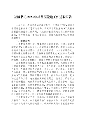 社区书记2023年抓基层党建工作述职报告一年以来,在镇党委的正确领导下,我坚持以XXX新时代中国特色社会主义思想为指导,认真学习贯彻党的XX大精神,紧紧围绕镇党委工作大局,扎实抓好基层党建各项工作的贯彻落实,较好地完成了各项工作任务。现将抓基层党建工作情况述职如下:一、主要工作一是聚焦思想引领,强化理论武装抓党建。以深入学习贯彻党的XX大精神为主线,扎实开展主题教育,积极主动参加各类学习教育培训活动,并通过集中学习、个人自学等形式,不断加强政治理论学习,在持续学懂弄通做实XXX新时代中国特色社会主义思想上下功夫,推动思想上不断完善、政治上不断成熟、工作上不断提升,使得自身综合素质得到全面提高。二是聚焦固本强基,夯实基层基础抓党建。扎实做好党员日常教育管理,严格落实三会一课制度,认真开展党史学习教育,及时组织召开支委会、党员大会、党小组会、主题党日活动等,深入学习贯彻XXX新时代中国特色社会主义思想和党的XX大精神,积极开展学习讨论、批评与自我批评、民主评议党员等工作,有效提高支部的凝聚力、战斗力。严格落实党务公开制度,充分发挥全体党员民主教育、民主管理、民主监督的积极性、主动性和创造性,加强社区党的建设,完善监督制约机制,着力锻造坚强战斗堡垒。主动关心关爱党员生产生活,坚持在春节、七一建党节等重要时间节点,定期走访慰问生活困难老党员,有针对性地帮助解决实际困难。三是聚焦重点工作,发挥核心引领抓党建。结合禁毒重点整治创文、创卫复检迎检等重点工作,积极动员党员群众参与无毒和文明创建活动,带头穿梭大街小巷宣传禁毒知识,帮助居民清理搬运堆放的杂物,彻底改变社区违章建筑多、生活垃圾乱堆乱放多的现象。结合主题教育,通过多种方式扎实开展我为群众办实事实践活动,针对部分路段无路灯、停车难、污水排放不便等问题,认真做好龙兴小区路段加装路灯、*小学周边草地改建停车场、*圩村一带修建污水排放管道、长堤边安装石板凳等8件民生实事。同时,积极构建社区大党委,着力整合单位成员资源,成立党员志愿者服务队,组织开展为困难群众送棉被棉衣的暖心行动,为老年人检测视力的光明行动,为残疾人、老人提供移动发廊服务的义剪行动,为儿童提供托管服务的四点半课堂行动,有效提高社区居民的获得感。四是聚焦党风廉政,转变工作作风抓党建。作为社区书记,我认为自己的一言一行、一举一动都关乎党在人民群众中的形象。为此,在日常工作中我始终坚持严格要求自己,带头落实党风廉政建设责任制,严格实行民主集中制,坚持按制度办事,坚持清清白白做事、堂堂正正做人,绝不辜负组织的培养和信任。同时,定期向广大党员干部和群众广泛宣传党的路线方针政策和有关反腐倡廉的文件、会议精神,在日常工作中勤打预防针,切实做到警钟长鸣、防微杜渐,不断增强遵纪守法的自觉性和坚定性。二、存在问题目前,社区管理的党员多为下岗失业人员、离退休人员及毕业生和退伍军人,大部分毕业生和退伍军人往往是将党组织关系转入社区后,便外出务工并更换联系方式,从不主动与社区党支部联系,加之部分下岗失业人员党性淡薄,组织纪律涣散,很难组织起来过组织生活,给社区党建工作造成了很大阻碍。同时,部分党员对理论培训、思想教育不重视,全心全意为人民服务的宗旨意识没有入脑入心,导致服务群众意识不强。三、认识体会和努力方向基层党组织是党全部工作和战斗力的依托。作为社区书记以社区党建引领社区治理,通过社区发展治理促进经济社会发展、带领居民把幸福生活的向往逐步变成现实,是我们面临的重大考验。为此,我将扎实推进以下几项重点工作:一是进一步强化思想引领。突出抓好党员党性教育和政治理论教育,不断探索实施党员分类管理、分类教育、分类服务,引导党员积极参加组织生活,自觉发挥先锋模范作用。二是进一步夯实基层基础。严格落实组织生活会、三会一课、主题党日活动等制度,聚焦优秀农民工等重点群体加大党员发展力度,加强党费收缴、使用和管理工作。三是进一步推动服务转型升级。持续深化我为群众办实事实践活动,创新服务方式,优化服务流程,为群众提供优质、便捷、高效的服务,不断满足群众多元化需求。