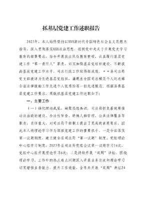 抓基层党建工作述职报告2023年,本人始终坚持以XXX新时代中国特色社会主义思想为指导,深入贯彻落实XXX法治思想,按照党中央关于开展党史学习教育的部署要求,结合开展政法队伍教育整顿,认真履行基层党建工作第一责任人职责,切实加强基层党组织建设,不断提高基层党建工作水平,司法行政工作取得新成效。××县司法局党支部被评为先进基层党组织,涌现出全国司法模范个人刘连娣全省法律援助工作先进个人张秀怡等一批先进模范。根据县委基层党建工作要求,现就抓基层党建工作述职如下:一、主要工作(一)强化理论武装,凝聚思想共识。司法局担负着统筹推动法治政府建设、合法性审查、特殊人群管理、公共法律服务等职责,责任重大,对司法局干部职工提出了更高的素质要求,因此本人将理论学习作为狠抓党建工作的重要抓手。一是全面落实第一议题制度,建立健全县司法局第一议题制度、党组理论中心组学习制度,2023年县司法局党组会议第一议题学习16次,党组中心组开展理论学习6次;二是持续开展双周讲坛,围绕理论学习、工作中的热点难点问题深入开展业务交流和理论学习切实增强业务能力、提升工作效能,全年共开展双周讲坛24次。三是要求党员干部制定个人学习计划,重点学习XXX新时代中国特色社会主义思想、XXXXXX在庆祝中国共产党成立100周年大会重要讲话等系列讲话精神、《XXX谈治国理政》等,以及《中国共产党支部工作条例(试行》《中国共产党农村基层组织工作条例》等有关基层党建的党内法规制度。通过学习,进一步提升了党员干部的政治素养和业务水平。(二)突出重点任务,抓实党史学习教育以及政法队伍教育整顿工作。开展党史学习教育以来,县司法局积极组织开展集中学习和个人自学,累计开展了10次专题讲座、宣讲以及交流研讨持续深入学习贯彻XXX新时代中国特色社会主义思想、党的十九届六中全会精神、XXXXXX对广东重要讲话和重要指示批示精神。根据政法队伍教育整顿的工作要求,认真组织开展政治教育、党史教育、警示教育、英模教育。组织观看《时代楷模》系列节目、学习先进典型事迹3次,到下庄铀矿科普教育基地接受现场红色爱国主义教育,观看警示教育片《恶伞》《浊流之虐》等警示教育组织开展了重温入党誓词、红军北伐粤北纪念馆等教育实践活动进一步加强党员干部的思想理论武装,对两个确立内涵和实质有了更深的认识,切实增强四个意识、坚定四个自信做到两个维护。着力打造一支政治过硬、业务过硬、素质过硬、纪律过硬、作风过硬的司法行政队伍。(三)夯实基层组织,筑牢战斗堡垒。县司法局机关党支部严格按照组织建设要求,严肃开展党的组织生活,严格落实三会一课、民主生活会、组织生活会、民主评议党员、谈心谈话等基本制度,通过组织生活严明党的纪律,查找解决问题,锤炼党性修养,推动党员干部在思想上认同组织、政治上依靠组织、工作上服从组织、感情上信赖组织。积极推行领导干部讲党课、主题党日等做法,切实增强组织生活的感染力、吸引力、针对性实效性。全年共开展党员外出活动6次、党员培训教育活动21次。2023年发展入党积极分子1名,补选党支部支部委员2名。(四)强化疫情防控,提供法律保障。一是积极组织开展党员进社区活动,县司法局党员志愿者充分发挥先锋模范作用,积极配合社区工作人员,深入社区开展《传染病防治法》等法律法规的宣传活动,引导社区群众积极配合支持疫情防控工作。二是做好特殊人群的管控工作,疫情期间县司法局对社区矫正对象安置帮教重点人员逐一进行摸排,登记造册、分类管理,同时加大对社区矫正对象定位手机的核查和抽查力度,要求矫正对象做到每日签到、每日打卡,坚持特殊时期对矫正对象升级管控,切实筑牢特殊人群管控大坝。三是开展在线公共法律服务,引导人民群众更多运用12348公共法律服务热线和网络等远程服务平台,切实满足人民群众请律师、办公证、求法援、找调解等法律服务需求。(五)严抓廉政建设,锤炼过硬作风。我坚持处处严格要求自己,自觉遵守中央八项规定精神,坚决反对四风,自觉增强法治观念,在思想上筑起拒腐防变的钢铁长城。严格落实党风廉政建设一岗双责制度,把党风廉政建设作为一项持续性工作来抓,结合工作实际开展党员廉洁自律承诺,筑牢党风廉政建设工作基础。组织党员干部观看党风廉政教育片《警钟长鸣》,让全体党员干部以案为鉴,时刻绷紧纪律廉政之弦。坚持把党风廉政建设、预防职务犯罪与党纪国法学习教育有机结合,组织全体党员干部集体学习《廉政准则》《纪律处分条例》,把作风建设融汇贯穿于党组工作、贯穿于日常工作,做到党风廉政建设一级抓一级、层层抓落实,确保党员干部清清白白、干干净净。二、存在问题(一)抓党建力度不够。对于加强基层党建工作的重要性认识不够深刻,一定程度上存在重业务、轻党建的思想,将精力过多地用于业务管理、单位发展等方面,没有很好将党建工