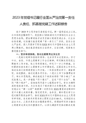 2023年党组书记履行全面从严治党第一责任人责任、抓基层党建工作述职报告我于2023年2月开始任局党组书记,新一届党组成立以来,在市委的坚强领导下,我坚持以XXX新时代中国特色社会主义思想为指导,团结带领班子成员坚持以党建促进业务、以业务检验党建,切实履行基层党建第一责任人职责,落实全面从严治党,深入开展学习贯彻XXX新时代中国特色社会主义思想主题教育,推动基层党组织全面进步、全面过硬。现将有关情况报告如下:一、坚持举旗铸魂,推动主题教育走深走实一是高位统筹加强组织领导。先后召开6次党组会,学习中央、省委、市委主题教育工作会议精神,研究制定局党组主题教育工作方案,取工作进展情况,研究下一步工作措施。及时跟踪检查各部门主题教育工作开展情况,压紧压实工作责任,推动各部门按照局党组工作方案,一体落实理论学习、调查研究、检视整改、推动发展各项任务。二是以上率下加强理论学习。带头学思践悟,带动局党员干部深刻领悟两个确立决定性意义,进一步增强四个意识、坚定四个自信、做到两个维护。坚持按月开展中心组理论学习,举办为期两周的党组读书班,为全体党员干部讲授2次专题党课。建立局党组会议第一议题制度第一时间传达XXX重要讲话精神和党中央重大决策部署,督促党支部、各科室、青年理论学习小组定期开展政治学习,推动XXX新时代中国特色社会主义思想常学常新,各支部共开展支部主题党日活动60次,支部组织生活会5次。三是求真务实加强调查研究。将调查研究作为推动主题教育走深走实的重要抓手,以深化调查研究推动解决发展难题。制定局党组《关于进一步改进工作作风深入开展调查研究的工作方案》,明确调研重点和目标任务,推动党员干部在提升调查研究能力和本领上下功夫。突出目标导向,立足我局职能职责,围绕构建现代产业体系、推动乡村振兴、优化营商环境等实际需要,由班子成员领衔确定12个重点调研课题,带领各部门深入开展的调查研究20余次。坚持问题导向,把解决实际问题作为调查研究的出发点和落脚点,以发现问题、找准问题、解决问题明确调研方向,及时梳理汇总调研情况,运用XXX新时代中国特色社会主义思想的世界观、方法论进行深入分析、充分论证,找准问题根源,研究对策措施,出台惠企惠民政策制度12项,切实使调查研究的过程成为推动事业发展的过程。四是从严从实深化检视整改。将检视整改作为主题教育的一项重点措施,督促党员、干部正视和解决党性党风党纪方面的问题,以新风正气振奋人民群众发展信心。坚持把自己摆进去、把职责摆进去、把工作摆进去,发扬共产党人最讲认真的精神,结合巡视巡察反馈、调查研究发现和群众反映强烈的突出问题,切实查摆问题13条,逐条明确整改措施42条,及时强化整改落实跟踪督导,逐条逐项去落实。坚持当下改与长久立相结合,对于能够马上解决的即知即改、立行立改,对于那些一时解决不了的问题、容易反复出现的问题,着力推动制度建设,让当下改有规可依、长久立有章可循。二、坚持强基固本,推进组织建设提质增效一是建强支部战斗堡垒。巩固支部标准化规范化建设成果,推动党建业务深度融合,切实发挥党建高质量引领改革发展稳定事业高质量的作用,督促各党支部围绕局党组中心工作开展急难险重任务集中攻坚活动,形成一批良好经验做法,推动中心工作亮点纷呈。强化党务工作培训,从严把好党员发展关,充实机关党员队伍力量。坚持党建带团建,围绕青春团建品牌创建,加强青年干部培养教育,确保党和国家事业后继有人。二是优化干部队伍结构。大力选拔任用政治业务双通双优的干部,树立正确选人用人导向,提振干事激情,营造有为有位价值主流。运用职务职级双通道,向市委组织部推荐提拔副处级干部2人,新提任科级干部6名,晋升职级12人次,中层干部平均年龄由43岁降至36岁。三是强化干部教育培训。把教育培训作为推动干部成长成才的重要手段,制定并严格落实年度教育培训计划。注重实战练兵,鼓励青年干部经济担当作为,坚持为干部能力展示搭建平台,开展机关小讲堂12期,组织36名青年干部结合岗位实践和专业所长,交流工作经验、研究成果,选派6名青年参加市委巡察和市政府各专项工作,推动干部职工拓展视野、实战成才。三、坚持正风肃纪,推动干部作风持续好转始终严于律己做好表率,努力在一体推进三不上下功夫,营造风清气正干事环境。一是严格干部教教育管理。坚持惩前毖后、治病救人,开展党员干部违规吃喝、形式主义和官僚主义等专项整治,运用第一种形态进行提醒谈话6人次。密切关注干部8小时内外生活,教育引导干部职工涵养良好家风,树牢正确的政绩观权力观事业观,自觉净化朋友圈交往圈生活圈。二是推动党风廉政教育常态长效。深入开展党风廉政宣传教育月活动,强化元旦、春节、端午、中秋等重要节假日廉洁提醒,制发廉洁过节通知4份,发送廉洁短信12条,覆盖干部职工600