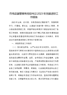 市场监督管理局党组书记2023年党建述职工作报告2023年以来,在市委、市政府的的正确领导下,我重视抓学习、打基础、管长远,认真履行党建第一责任人职责,用心组织推进党建工作,积极带领全体党员干部较好地完成了各项工作任务,按照市委组织部《关于精心开展2023年度党组织书记抓基层党建述职评议考核工作的通知》文件要求,现将2023年度抓基层党建工作作如下简要汇报:一、抓基层党建工作情况(一)强化政治担当,从严从实扛牢主体责任。2023年,我始终把学习贯彻XXX新时代中国特色社会主义思想作为长期重大政治任务,认真学习贯彻党的XX大精神,紧紧围绕新时代党的建设总要求和全国、全区、全市组织工作会议精神,以铸牢中华民族共同体意识为主线,严格贯彻落实意识形态工作责任制,认真履行党组书记抓基层党建工作职责,将党建工作与业务工作同部署、同要求、同推进,扎实推进局党建和业务工作创新发展。制定《党建工作要点》《全面从严治党主体责任清单》等,明确全年党建工作目标和任务。坚持定期专题研究党建工作,定期督导各党小组工作,累计召开党建工作专题会议5次,制定下发重点任务清单45期,开展党建工作督导检查18次,促进全局党建工作全面进步、全面过硬。(二)强化政治引领,务求实效抓好主题教育。牢牢把握学思想、强党性、重实践、建新功总要求,坚持高站位谋划、高效率推进、高质量落实,将理论学习、调查研究、推动发展、检视整改建章立制等重点工作一体部署,一体推进。一是提高站位深学细悟,在理论学习上下功夫。严格落实第一议题制度,采取党组理论中心组学习+三会一课+青年理论学习小组等形式,累计开展读书班3期,专题党课5次,16次中心组专题学习研讨,40余次集中学习,5次读书分享,形成示范带动学、全面覆盖学、多元载体学的格局,推动全体党员干部在学中干、干中学。二是聚焦问题深查细研,在调查研究上求实效。班子成员围绕招投标乱象的表象及解决办法、优化局领域营商环境等内容展开走访调研,确定调研课题4个,形成调研报告4篇,梳理问题13个,提出对策措施23条,形成探索构建监督之上再监督的大监管格局,深化市场监督管理局平台整合共享等9项成果转化清单,将调查研究成果运用转化为提高市场监督管理局工作质效的有效措施。三是精准发力检视问题,在检视整改上出实招。自上而下系统梳理调查研究发现的问题、推动发展遇到的问题、群众反映强烈的问题,检视列入清单问题4个、制定整改措施12条,清单问题全部完成销号,累计解决群众急难愁盼问题8个。及时梳理总结主题教育中的经验做法,建立健全理论学习、调查研究、推动高质量发展密切联系群众等长效机制、相关制度、方法措施等7项。(三)强化政治建设,常态长效做好党风廉政工作。一是持之以恒正风肃纪。始终把政治建设摆在首位,开展经常性学习教育、警示教育等活动,组织观看《扣好廉洁从政的第一粒扣子》《家声》等警示教育片,共开展警示教育活动7次,参观廉政教育基地1次,干部大讲堂一岗双责宣讲11次。梳理了内控廉政风险点147条,制定防范措施156条。健全完善各项制度机制,为支部全体党员更新了廉政档案,进行廉政风险谈话提醒30余人次。二是做好巡察整改工作。市委第X巡察组向我局党组反馈巡察意见后,局党组第一时间制定整改方案和整改台账,针对4个方面33个具体问题,细化整改措施101项,已全部完成整改。在集中整改期内,组织学习相关制度法规等共计26项,追缴资金3728元,新制定、完善制度15个、通知3个、台账10套,出台方案4个,优化完善流程4处。三是深化坚强堡垒模范支部创建。开展亮晒比活动,打造坚强堡垒模范支部。不断完善党员积分制管理制度,通过两大类五项内容,15项标准科学细化评定细则,按照月积分、月公示、年考评的方式进行动态积分管理,全程跟踪了解党员干部日常表现,进一步培养党员干事创业积极性,激发党员内生动力。(四)强化党管干部,突出政治标准做好选人用人工作。一是推进落实领导干部能上能下《若干规定》。党组承担主体责任,以健全和落实推进领导干部能上能下工作责任制为重点,加强考核和督促检查,以调整不适宜现职和拿下不作为乱作为干部为重点,系统施治、综合施策,着力推动形成能者上、优者奖、庸者下、劣者汰的用人导向和从政环境。二是做深做实干部日常了解工作。通过制定《市场监督管理局平时考核工作办法(试行)》,捕捉干部在平时工作和生活中的政治表现、政治素质和廉洁自律等关键信息,为选人用人提供好基础信息。三是压实责任担当,做到以事察人。通过向干部压担子来检验干部干事创业的能力,及时掌握干部在重大原则问题和大是大非面前的具体表现,把干部的政治表现摸准看清。今年,共调整干部8批次,涉及65人次,为两个二级单位配备了领导班子,完成了事业单位的聘岗工作,真正做到把那些有政治定力