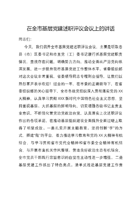 在全市基层党建述职评议会议上的讲话同志们:今天,我们召开全市基层党建述职评议会议,主要是听取各县(市)区委书记和市直党(工)委书记履行抓基层党建职责情况,查找存在问题,明确努力方向,推动全面从严治党向纵深发展,进一步提升我市基层党建工作整体水平。省委组织部对这次会议非常重视,省委领导同志专程到会指导,让我们以热烈掌声表示欢迎!过去的一年,在市委的正确领导下,在省委组织部的关心指导下,全市各级党组织深入贯彻落实党的XX大精神,认真学习贯彻XXX新时代中国特色社会主义思想,坚持重视基层、大抓基层的鲜明导向,切实增强各级书记主责主业意识,不断强化管党治党政治自觉,认真落实上次述职评议作出的各项承诺,在推动基层组织建设全面提升全面过硬上取得了明显成效。一是扎实开展主题教育。坚持创新学的方式,搭建做的平台,着力推进学习教育和党的XX大精神有机结合,与学习贯彻省市党代会精神和省市委全会精神有机结合,与开展市直机关作风整顿、营造良好政治生态有机结合,全市党员干部践行宗旨意识的自觉性主动性进一步增强。二是基层党建工作抓出了特色亮点。清单式推进基层党建工作责任、任务双落实,形成了抓基层党建工作的操作指南。三是基层党组织活力进一步显现。基层党建工作经费、社区服务群众专项经费、村级组织运转经费得到落实,基层党建保障水平进一步提升。普遍制定基层党组织三会一课、组织生活会、民主评议党员和主题党日活动,推行微视频记录组织生活制度,基层组织生活规范化程度明显提高。虽然我市基层党建取得了较好成绩,但仍存在一些问题。比如,主体责任落实还不到位,有的地方抓基层党建上热下冷,存在工作力度逐级递减的问题;有的党(工)委书记抓基层党建不够积极主动,投入精力还不足,没有把责任真正扛起来,亲自抓的氛围还不够浓。等等。这些问题必须引起我们的高度重视,认真研究解决。下面,结合述职评议,就提升基层党建工作质量,我再强调几点意见。一、突出政治功能,抓严基层党建。政治功能是党组织第一位的功能。我市有x个基层党组织、近x万名党员,如果政治功能不突出,就会影响党的路线方针政策落实。必须把党的政治建设摆在首位,作为党的根本性建设来抓,强化基层党组织政治功能,增强党的意识、党员意识,切实夯实党在基层的执政基础。一要坚定政治方向。教育基层党员干部牢固树立四个意识,坚定四个自信,严守政治纪律和政治规矩,坚决贯彻党的路线方针政策,坚决维护以XXX同志为核心的党中央权威和集中统一领导,在政治立场、政治方向、政治原则、政治道路上始终同党中央保持高度一致。二要锤炼政治定力。切实加强基层党员干部理想信念教育、党性教育、宗旨教育、党章党规党纪教育,着力解决理想信念模糊动摇、党的意识淡化、宗旨观念淡薄、精神不振、消极懈怠等问题,筑牢信仰之基、补足精神之钙、把稳思想之舵,做到政治合格、执行纪律合格、品格合格、发挥作用合格,保持党员队伍的先进性纯洁性。要严肃党内政治生活,认真落实《准则》《条例》,严格执行三会一课、组织生活会、民主评议党员等基本制度,着力增强党内政治生活的政治性、时代性、原则性、战斗性。三要强化政治领导。党的基层组织是党的领导延伸到基层的重要载体,必须发挥党的政治优势,把党的全面领导落实到基层组织。在农村,要以抓党建促振兴为重点,支持其他各类组织按照法律和各自章程开展工作,使农村基层党组织成为实现乡村振兴的战斗堡垒。在城市,要以构建共驻共建、互联互动格局为重点,落实街道社区党组织领导基层社会治理各项职责任务,领导和引领社区各类组织自我约束、自我管理、自我教育、自我服务。二、聚焦重点任务,抓实基层党建。一要宣传党的主张。充分发挥基层党组织联系群众的桥梁纽带作用,宣传党的路线方针政策,宣传党中央、上级党组织和本组织的决定、决议,使党的意志、党的声音、党的要求及时传达到基层,转化为党员群众的思想共识和自觉行动。宣传党的主张既不能大而化之、水过无痕,也不能简单生硬、机械灌输,要采用通俗易懂、喜闻乐见的方式,把党的主张讲明白、说透彻,引领群众听党话、跟党走。二要贯彻党的决定。在这方面,不能有丝毫含糊,必须严格按照党的路线方针政策和决策部署办事,坚决执行党组织决定,绝不能打折扣、做选择、搞变通。要把政治过硬作为首要标准,加强基层党组织带头人队伍建设,开展经常性教育培训,不断提高政治领导本领、正确履职本领、狠抓落实本领。三要领导基层治理。把党的领导落实到基层治理中,使基层党组织建设与基层治理有机衔接、良性互动,以党的建设贯穿基层治理、保障基层治理、引领基层治理。要加快城市基层党建试点市建设,强化街道社区党组织统筹功能,推进街道社区与驻区单位、新兴领域组织互联互通、互动互融。三、创新方式方法,抓活基层党建。一要创新组织设置。近年来,各地在这方面进行了积极探索,有的在街道成立联