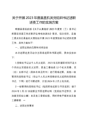关于开展2023年度县直机关党组织书记述职述责工作的实施方案根据县委组织部《关于认真做好2023年度党(工)委书记抓基层党建工作述职评议考核的通知》要求,结合实际,县直工委决定在县直机关党组织开展2023年度党组织书记述职述责工作。具体方案如下:一、述职述责的范围和时间安排本次述职述责活动分为现场述职和书面述职,具体安排如下:1.党组织书记以个人名义述职,2023年实际履职时间不足6个月的以党组织名义述职。县直工委抽选12个机关党委、党(总)支部书记(具体名单见附件)进行现场述职,其他一级管理的党组织书记(含以个人名义和党组织名义述职的党组织书记,下同)进行书面述职,计划2024年2月上旬完成。2.一级管理的党组织书记(包括现场述职与书面述职)请于2024年1月22日前提交书面述职材料(党组织书记签字,并加盖党组织公章)至县直工委组织股,同时将电子版发至县直工委邮箱:**二、述职述责要求(一)述职述责的重点内容重点围绕学习贯彻党的XX大精神,深入开展主题教育,贯彻落实省委1310具体部署和全国及全省、全市、全县组织工作会议精神等开展述职述责。1.深入扎实开展第二批主题教育,一体推进理论学习、调查研究、推动发展、检视整改、建章立制等重点措施,分类抓好基层党组织和普通党员主题教育,坚决防止形式主义、官僚主义和低级红、高级黑等的情况。2.增强基层党组织政治功能和组织功能,贯彻落实省委1310具体部署、市委三化三大发展思路及县委1+3+6行动计划,在聚焦激活三大动力、抓好创新赋能向海发展,落实制造业当家,深入实施百千万工程,加快建设百业并进、多彩遂溪乡村振兴示范带,全面推进绿美遂溪生态文明建设,打造更高水平平安法治遂溪,推进全面从严治党体系建设等重点工作中发挥基层党组织作用的情况。3.提升党的组织体系建设整体效能,深入实施基层党建三年行动计划,贯彻落实基层党建提质年1+2+6行动,大力推进遂行先锋计划,深入推进抓党建促乡村振兴、以党建引领城市基层治理,推进党建联建,找准基层党建工作与重点工作深度融合的切入点,打造特色党建品牌。把坚持和加强党的全面领导落实到机关、国有企业、医院等事业单位,强化党建对群团组织的建设引领作用,加强新经济组织、新社会组织、新就业群体党建工作的情况。4.发挥党员先锋模范作用,把坚持政治标准放在首位,提高发展党员质量,在发展党员上严格把关、完善机制、优化结构、提高质量,充实后备力量和落实发展党员责任制,抓好党员经常性教育,严格落实党的组织生活制度和基层党组织按期换届制度,深入开展党员评星定级和星级党支部创建评定,加强和改进流动党员管理,严肃稳妥处置不合格党员,推进南粤党员先锋工程,持续推动头雁工程,深化我为群众办实事,推广运用乡村振兴积分制,完善落实平急转换机制、网格化管理机制、接诉即办等工作机制,深化平急转换机制助力百千万工程典型镇建设,引导党员在维护社会稳定、联系服务群众、防汛抢险救灾等工作中发挥作用的情况。5.落实基层党建责任制,树立大抓基层的鲜明导向,推动党组织履行抓基层党建工作主体责任、党组织书记履行第一责任人职责、其他领导班子成员履行一岗双责的情况。6.突出问题导向,紧扣基层党建难点堵点痛点问题,特别是主题教育检视整改、总结评估和上年度述职评议查摆的问题,紧盯短板弱项,提出对策措施。各党组织要结合实际,确定1-2个重点难点问题作为必答题,集中推动解决。(二)述职述责的基本要求1.述职述责报告控制3000字以内,6分钟现场发言稿控制1200字以内,分为导言、主要工作、存在问题、认识体会和努力方向等几个部分。导言部分简述党组织书记履行抓党建第一责任人职责的政治站位和基本方法;主要工作部分重点总结本级党组织和书记本人围绕但不限于六个方面抓落实的主要举措和变化成效;存在问题部分重点查找在基层党建工作责任、质量、水平中存在的关键性问题;认识体会和努力方向部分重点是运用XXX新时代中国特色社会主义思想和党的XX大精神,谈个人的实践感悟,并针对存在问题提出推动机关党建高质量发展的具体举措。2.述职的党组织书记要把自己摆进去,讲清履行第一责任人职责抓基层党建工作的硬招实招,讲透抓基层党建工作存在的问题,讲实对策措施,特别是要围绕党建引领保障百千万工程实施进行述职,注重用事例和数据讲话,客观反映成效和问题,形成述职报告和现场汇报稿。三、述职述责的方法步骤1.认真做好述职准备工作。述职的党组织书记结合调查研究,事前要深入了解掌握本单位党建工作情况,认真撰写述职报告,全面总结抓党建工作情况,深入剖析存在的问题,提出今后的工作设想。2.真开展述职评议。会上党组织书记要认真向大会作述职报告,述职时尽量脱稿。组织参会人员对党组织书记进行评议,以党组织名义述