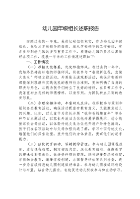幼儿园年级组长述职报告回顾过去的一年里,虽然忙碌但很充实,作为幼儿园年级组长,我听从学校领导的指挥、服从学校领导的工作安排,有幸参与到幼儿园的多项重要工作中,根据幼儿园的要求认真做好各项工作,现就一年来的工作情况述职如下:一、工作情况(一)厚植文化根基,优化师德师风。在过去的一年中,我始终坚持高标准的师德师风,积极参与奋进新征程,志做大先生师德主题活动,开展张玉滚观影活动,确保所有教师都能深刻理解和实践优良的教师行为准则,更加明确了自身的职责与角色,从而为孩子们树立了良好的榜样。在日常工作中,我注重树立良好的师德榜样,以身作则,为团队树立正面的教育形象。(二)合理安排活动,丰富幼儿生活。我积极参与策划和组织各类教育活动,确保活动既富有教育意义,又能激发幼儿的兴趣。比如,以儿童节为依托开展我和爸妈趣童年等各种节日主题活动,以家长开放日为依托开展早操展示、幼小衔接家长会等活动,以体验传统文化为依托开展户外特色游戏,孩子们在各项活动中与父母加强沟通了解,学习中国传统文化,增强他们的探索欲望,提升他们的身体素质,提高他们的动手能力。(三)强化教育驱动,深耕教学管理。参与幼儿园课程改革,进行课程梳理,制定相应内容,深化教育驱动,提高教学的趣味性和有效性。做好资料归纳整理,顺利迎接劳动校创建,学前融合教育,清廉学校创建,办园督导评估等系列检查,进一步为省级师范幼儿园创建做好准备。参与幼儿园楼道环创设计与布置,贴合幼儿需求,有效促进幼儿积极参与和主动学习。(四)致力共同成长,共筑美好未来。在团队建设方面,我鼓励并实践了教师间的共同成长。通过开展大班组优质课比赛、旦班本课程分享、国培计划接待等活动,依托实地开展教研活动,形成定期教学研讨和经验分享,不断提升团队的整体教学水平,共同为孩子们创造更加美好的学习未来。二、工作不足在反思过去一年的工作时,我意识到在一些方面还有待提高。一是教学内容与进度有待调整。在回顾过去一年的教学实践时,我发现教学内容和进度在某些方面未能完全适应孩子们的学习需求。例如,在进行数学基础教学时,我们发现部分孩子在理解抽象概念方面存在困难。因此,我们需要对教学方法进行调整,以更好地适应孩子们的学习节奏。二是教学资源和环境创设有待优化。尽管我们的教学资源相对充足,但在实际运用中还存在一些不足。比如,我们的阅读角落需要更多更新的书籍和学习材料来吸引孩子们的注意力。同时,我们也需要改善一些学习区域的布局,使之更加适合幼儿的活动和学习,为幼儿提供新鲜感和兴趣点,激发他们的好奇心和求知欲。三、工作计划1.实现户外大循环。为了促进不同年龄组孩子之间的交流和学习,我计划在来年实施户外大循环活动。通过这种方式,孩子们可以在不同年龄组之间进行互动,从而促进社交技能的发展和经验的交流。2.环境实现与幼儿的对话。接下来,我们将重点优化学习环境,让环境本身成为孩子们学习的一部分。我们计划设计更多富有教育意义的主题墙,开展更多区域活动,并创设富有创意的楼道环境,以激发孩子们的好奇心和探索欲。3.提升教师教育观念。在教师培训方面,我将致力于提升教师们的教育观念,优化教学活动,规范幼儿园一日活动。关注活动的计划性、整体性、操作性、趣味性,注重健康、语言、社会、科学、艺术五大领域之间的相互渗透和整合,各环节衔接自然、有序、有趣、高效,优化活动效益,确保教学活动和日常活动环节能够更好地满足幼儿的发展需求。四、对幼儿园的建议一是提升教学素质。进行一次针对教师需求的调查,了解他们在教学和专业发展方面的需求,病根据调查结果,投入最新的教育书籍和资源,帮助教师提升自己的教育观念和专业素质。二是寻找帮扶共建园所。学校可以寻找合适的合作伙伴,共同建设和改善幼儿园的教育环境。通过这种合作,我们不仅能够共享资源,还能够共同提升教育质量,为孩子们创造更好的学习和成长环境。在未来的一年里,我将继续致力于我的工作,不断探索和创新,为孩子们的成长和发展贡献我的力量。