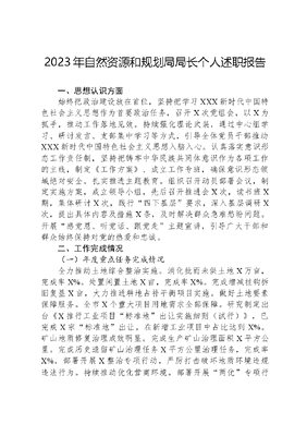 2023年自然资源和规划局局长个人述职报告一、思想认识方面始终把政治建设放在首位,坚持把学习XXX新时代中国特色社会主义思想作为首要政治任务,召开X次党组会,以X为抓手,推动工作落地见效。持续强化理论武装,通过中心组学习、研讨发言、支部集中学习等方式,引导全体党员干部推动XXX新时代中国特色社会主义思想入脑入心。认真落实意识形态工作责任制,坚持把铸牢中华民族共同体意识作为各项工作的主线,制定《工作方案》、成立工作专班,确保意识形态领域绝对安全。扎实推进主题教育。组织召开动员部署会议,制定实施方案,成立领导小组,先后召开推进会X次,读书班X期,集体研讨X次,践行四下基层要求,深入基层调研X次,提出具体内容及措施X条,及时解决群众急难愁盼问题。开展感党恩、听党话、跟党走主题宣讲,引导广大干部和群众始终保持对党的热爱和忠诚。二、工作完成情况(一)年度重点任务完成情况全力推动土地综合整治实施。消化批而未供土地X万亩,完成率X%。处置闲置土地X亩,完成率X%。完成增减挂钩拆旧复垦X亩,大力推进耕地占补平衡项目实施。做好土地要素保障服务。全市X个重大项目用地需求全部保障。研究制定出台《X推行工业项目标准地出让实施细则(试行)》,已完成X宗标准地出让,在新增工业项目中占比达到X%。矿山地质修复治理成效明显。完成生产矿山治理面积X平方公里。完成历史遗留矿山治理任务X平方公里治理任务,完成率X%,部署开展X整治专项行动,严厉打击破坏地质环境违规违法行为。持续推动优化营商环境。部署开展两优专项行动,共减权放权X项,精简办事材料X份,压减办事时限X个。全面提升不动产登记服务水平,不动产办证难问题彻底解决。圆满完成各专项工作。煤炭资源领域常态化治理率先完成销号。(二)履行推进法治建设第一责任人职责情况强化自身法治思维。坚决履行法治建设第一责任人职责,带头贯彻落实XXX法治思想,先后召开X次党组会、专题会传达学习XXXXXX关于法治方面的指示批示精神和相关法律法规。强化法治宣传教育。制定法治工作计划和宣传教育计划清单,利用土地日、宪法宣传日广泛开展法治宣传和普法教育,将法治建设履职情况纳入领导班子和领导干部绩效考核。不断提升行政效能。聘请优秀律师担任法律顾问,鼓励支持执法人员参加行政执法考试,依法行政能力不断提升。严格执行三重一大事项集体决策议事规则和民主集中制,进一步完善党组会议议事规则和决策程序。三、廉洁自律方面带头遵规守纪。严于律己,慎独慎微,坚决抵制形式主义、官僚主义,严格落实中央八项规定精神和省里配套规定,召开X次局党组会议,及时传达学习党中央、省委、市委关于全面从严治党工作会议精神和具体要求,系统全面研究部署从严治党各项工作任务,确保全系统把好政治方向。加强作风建设。督促制定《2023年度全市自然资源系统履行党风廉政建设主体责任清单》,明确X方面X项具体落实措施。加强和改进作风建设,持续解决三多三少三慢问题,对照七个摒弃要求和慢、粗、虚问题开展自查,推动全局提标提速提效。强化监督管理。经常性开展廉政谈话,带头并要求全体党员干部签订《个人廉政承诺书》。部署抓党风树新风专项行动,排查出重点整治6方面23种类型的突出问题,守牢纪律规矩底线。四、存在的问题和不足一是政治站位还不够高。对上级方针政策把握不够精准,落实重大决策部署行动还不够迅速有力,工作预判能力、提前谋划能力不够强。二是理论学习不够扎实。学习的主动性、系统性、深入性还不够,在学以致用、学用结合上还存在一定差距。三是工作思路不够宽。对一些难点、重点工作深入研究不够,破解制约发展难题的办法还不够多。五、明年工作主要思路下一步,我将切实按照中央、省和市里决策部署,以全面加深两统一为根本遵循,以推动高质量发展为工作主线,全面提升支撑和保障经济社会发展的能力,为书写X发展新篇章贡献自然资源力量。一是以更高的站位,落实党的XX大精神和党中央各项重大决策部署和政策方针。将继续深入学习贯彻XXX新时代中国特色社会思想和党的XX大以及二十届二中全会精神,不断切实增强四个意识、坚定四个自信,切实把牢政治方向,将中央、省里的决策部署不折不扣落到实处。二是以更优的效率,为全市经济高质量发展注入自然资源力量。采取长牙齿的硬措施,落实最严格的耕地保护制度。确保全X耕地保有量X万亩、永久基本农田保有量X万亩的保护任务不减少。持续强化土地综合整治实施。确保消化批而未供土地X万亩,处置闲置土地X万亩,力争提前在2024年基本完成十四五期间的消化处置目标任务。力争实现增减挂钩跨省交易X万亩。提早谋划保障全市X个重点项目用地需求。强化国土空间规划管控。在批复全市国土空间总体规划的基础上,提早行动详细规划修编工作。积极推进矿山地质环境治理。积极争取国家专项资
