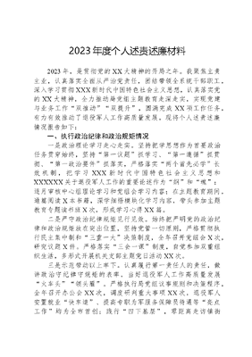 2023年度个人述责述廉材料2023年,是贯彻党的XX大精神的开局之年。我聚焦主责主业,认真落实全面从严治党责任,团结带领全系统干部职工,深入学习贯彻XXX新时代中国特色社会主义思想,认真落实党的XX大精神,全力推动局党组主题教育走深走实,实现党建与业务工作双推动双提升,圆满完成XX项工作任务,有力有效推动了退役军人工作高质量发展。现将个人述责述廉情况报告如下:一、执行政治纪律和政治规矩情况一是政治理论学习走心走实。坚持把学思想作为首要政治任务贯穿始终,坚持第一议题抓学习、第一遵循抓贯彻、第一政治要件抓落实,严格落实两个首先必学长效机制,把学习XXX新时代中国特色社会主义思想和XXXXXX关于退役军人工作的重要论述作为纲和魂;逐月审核中心组理论学习和党组会学习内容;在主题教育期间,通篇阅读X本书籍,深学细悟模块化学习内容,带头参加主题教育专题读书班X次,形成学习心得XX篇。二是严守政治纪律规矩见行见效。始终把严明党的政治纪律和政治规矩放在突出位置,坚持党管一切原则,严格贯彻执行民主集中制和三重一大决策制度,全年召开党组会X次,研究议题X件。严格落实三会一课制度,自觉参加双重组织生活,多形式开展机关支部主题党日活动XX次。三是示范带动以上率下。认真履行第一责任人的责任,做讲政治守纪律守规矩的表率,当好退役军人工作高质量发展火车头领头雁。严格执行局党组议事规则和决策程序,全年召开办公会XX次,调度研判重大事项XX次,退役军人安置就业快车道、提高专职为军服务保障员待遇等亮点工作均为全市首创;践行四下基层,零距离走访镇街(村社)退役军人服务站走访X次,入户走访退役军人XX户,解决问题XX个,调研成果转化工作措施XX条。深入开展党建扎桩·治理结网工程,带领XX名区外党员干部,赴单位驻地报到。二、履行管党治党责任情况一是发挥政治引领作用,增强基层党建活力。全面落实党建主体责任清单和任务安排,明确班子成员及XX个党组织党建工作责任和具体内容,分解细化年度党建要点XX项,两个责任全面履行、一岗双责全面落实。利用学习强国等平台,通过线上+线下等方式,常态化开展时事政治宣传、送书到家、送学上门,使主题教育真正活起来;不断强化政治功能,XX个基层党组织真正成为组织群众、凝聚群众、宣传群众、服务群众的主心骨。二是严肃党内政治生活,增强党组织凝聚力。突出大抓基层的鲜明导向,切实增强基层党组织组织功能。规范执行民主生活会、三会一课、主题党日活动和民主评议党员等制度,结合实际组织重温入党誓词、退役军人重温军人誓词、过政治生日等政治仪式,为全局党员上党课XX次,累计开展主题党日活动XX次,组织生活会XX次,全系统的凝聚力、战斗力、向心力全面增强。三是守好意识形态主阵地,增强舆论引导力。牢牢把握党对意识形态工作领导权,认真落实意识形态工作责任制,专题分析意识形态工作XX次,开展意识形态领域风险防范监测、研判、预测,动态了解舆情,全年未发生意识形态领域风险。讲好党的故事、军人和退役军人故事,高质量撰写调研报告XX篇、正反案例XX篇,先后在《中国退役军人》《新时代中国双拥》等杂志发表文章X篇,《整合+聚合+融合,带动军地共向发展工作法》入选全国党委退役军人事务工作领导机构示范工作法汇编,连续三年荣获中国退役军人先进宣传单位。三、推进党风廉政建设和反腐败工作情况一是强基固本培元,狠抓作风建设。修订完善国有资产管理制度、公务车辆管理制度等XX项制度,汇总印制《区退役军人事务局制度汇编》;开展以案四说XX场次,运用案件XX件,教育对象XX余人次;坚持落实信息发布三审三校制度,全年在门户网站上发布工作情况、政策文件、其它法定信息等政务信息XX条,均未出现负面影响。二是激荡清风正气,狠抓执纪问责。始终保持监督执纪问责高压态势,加强党员干部的日常教育和党内监督,召开廉政警示专题会XX次,通报违纪违法案例、廉政警示教育XX次,组织参观廉政教育基地、观看廉政专题片XX余人次,开展班子成员交心谈心XX人次,廉政谈话XX人次,广大党员干部的知敬畏、存戒惧、守底线的思想自觉和行动自觉进一步增强。三是夯实发展基石,狠抓队伍建设。建立重实干重实绩的考核制度,以大抓基层实现赢得全局。实施差异化考,将考人与考事评分与排名相结合,整理编印《区退役军人服务中心(站)应知应会一本通》,同步开展知识综合测试,队伍能力水平全面提升。实施常态化督,围绕XX项重点任务逐一建设任务落实清单台账,让以督促改、以督提效落地落实。实施最优化办,对标互联网+督查办件标准规范,全年共受理办结退役军人求助事项XX条,办结率达100%,平均办结时长XX天,远低于全市平均办结时长XX天。四、