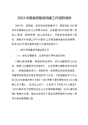 2023年度县局基层党建工作述职报告2023年,在县委、县政府的坚强领导下,我坚持以XXX新时代中国特色社会主义思想为指引,认真履行机关党建第一责任人职责,团结带领一班人真抓实干,不断筑牢基层战斗堡垒,把高水平党建工作作为指导*工作高质量发展的坚实保障。现将2023年度抓基层党建工作情况报告如下:一、2023年度基层党建主要工作(一)抓实主题教育,以深学笃行把牢政治方向1.精心谋划部署。根据本单位实际,召开主题教育工作会议,梳理《主题教育任务清单》,扎实开展主题教育读书班活动,一体推进理论学习、调查研究、检视整改各项任务落实。专题研究制定党支部全年理论学习计划、《党组理论学习中心组2023年度集体学习方案》《县*局学习宣传贯彻党的XX大精神工作方案》。坚持以上率下,认真学习《党的XX大报告》《XXX新时代中国特色社会主义思想专题摘编》《XXX著作选读》等重点内容,推动全体党员干部自觉把思想和行动统一到党中央决策部署上来。2.抓实理论学习。开展线上+线下全覆盖党员轮训。线上灵活运用宜昌智慧党建云、学习强国、*干部在线学习等平台,线下采取班子成员带头学、党员集中学、支部专题学、干部自觉学等多种形式学习,通过抓实理论学习,确保主题教育学习不走偏、不走样、不走空。今年共开展7次领导班子专题党课、8次党组理论中心组学习、9次主题教育专题学习、5期股长讲堂、12期四个讲堂、25次*业务培训,3次*业务知识竞赛。3.开展调查研究。局党组始终坚持把调查研究作为推动主题教育走深走实的重要抓手,制定实践活动和调查研究三张清单,围绕党中央明确的12个方面调研重点,组织党员干部扑下身子、沉到一线,实地调研100余次。围绕调研发现的6项问题,制定班子成员主题教育问题清单,明确整改措施、整改时限,形成发现问题、检视整改、巩固提高的工作闭环。(二)聚焦主体责任,以组织之力厚植发展之基1.坚决扛牢机关党建责任。本人认真履行抓党建第一责任人职责,坚持对党建工作亲自抓、负总责,全年共召开3次党组会议研究党建工作,结合实际认真制定2023年党组织书记履责承诺口袋书、党支部书记口袋书。严格落实意识形态工作责任制,将意识形态纳入中心组学习内容,加强舆论引导,全年未发生负面舆情影响事件。认真落实三会一课、领导干部双重组织生活等制度,全面严肃党内政治生活。高质量召开了2022年度民主生活会、组织生活会,并对查摆的问题制定了整改方案,明确时间节点,细化整改举措,确保问题整改见底到位。2.抓实支部规范化建设。积极推动党支部晋位升级。严格按照《党支部建设晋位升级三年行动实施方案》《党支部规范化建设标准(机关事业单位)》,全面对标对表,扎实推进创建工作,补短板强弱项,确保达到一类支部标准。充分利用互联网+党建新模式,做好*智慧党建云平台日常管理。今年以来,共培养发展正式党员1名、预备党员1名。创新开展特色党建品牌打造,紧紧围绕建强支部堡垒、发挥党员作用两个根本,大力开展*党建特色品牌、群众满意机关创建。3.筑牢廉洁从政防线。坚持把党风廉政与业务工作同布置、同检查、同落实,先后召开3次党组会议专题研究党风廉政建设工作,制定《局党组2023年落实全面从严治党主体责任清单》。扎实开展**领域廉洁从政风险排查,规范外出考察、商务接待等管理制度。认真组织党风廉政建设宣传教育月活动,由我讲授《清廉自律、守好底线》廉政党课。通过观看警示教育片、开展纪法小课堂实施测试等形式,深入开展以案说德、说纪、说法、说责,提升警示教育效果。深化清廉长阳建设,按照《县**局2023年清廉机关建设实施方案》,全员开展一次廉政谈话、一次专题学习、一次纪法测试等活动,签订《建清廉家庭、树新风正气》承诺书,督促党员干部自觉树好家风。强化监督预警,运用监督执纪第一种形态,抓早抓细抓实日常监督。今年来运用第一种形态1次,谈心谈话10次。(三)坚持久久为功,以党建引领推动高质量发展1.工作目标全面完成。坚持党建、业务双融双促,结合局党组中心工作任务,扎实开展**攻坚行动,把重大任务落实作为检验基层党组织政治功能、组织功能试金石。先后被**授予集体嘉奖、**县委授予三季度**奖荣誉。2.扶持政策全面落实。充分发挥服务企业联络员、企业困难化解员、企业党建指导员作用,优化营商环境。坚持每月走访**公司,深入企业生产经营一线,了解企业详情与需求,分类指导、精准帮扶,全年免申即享兑现产业扶持资金**万元。3.基层实践扎实推进。坚持以党建引领促基层治理,签订社区《共建协议》,积极帮助**社区解决基层工作中的难点、堵点。深入践行党建引领共同缔造理念,做深做实社区双报到双报告机制。扎实推进党员干部下沉社区,开展社区大走访、人居环境整治行动。截止目前,对所联**社区责任