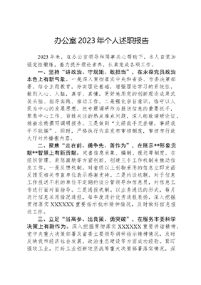 办公室2023年个人述职报告2023年来,在办公室领导和同事关心帮助下,本人自觉加强党性锻炼,着力提升理论素养,认真完成各项工作。一、坚持讲政治、守规矩、敢担当,在永葆党员政治本色上有新气象。一是深入贯彻落实中央和省委、市委决策部署,结合主题教育,夯实理论基础,增强理论学习的系统性,做到入心、入脑,真学、真懂,更好地用党的创新理论成果武装头脑、指导实践、推动工作。二是强化宗旨意识,恪守以人民为中心的发展思想。把专题调研作为报送信息的重要抓手,聚焦中心工作、百姓关注的热点难点问题,深入细致调研论证,精益求精撰写调研报告。三是做到文经我手无差错,事经我手不耽搁。同时,严格执行内容发布审核制度,审核市行政大厅对外播报内容。二、聚焦走在前、勇争先、善作为,在展示**形象贡献**智慧上有新贡献。完善信息采集、编制、报送等制度,在组织管理、奖惩激励等方面创新,创建三个工作机制来推动信息工作。一是反馈机制。对省级以上刊物采用的信息立即发函反馈至相关市直单位表示感谢支持。二是约谈机制。对于信息工作报送不利的单位不定期约谈分管领导和信息员,对信息工作进行面对面指导。三是通报机制。以业务通讯的形式,每月进行信息采用情况通报,每年度进行优秀通报表扬。深入挖掘贯彻落实XXXXXX重要指示批示精神情况,及时做好信息报送工作。三、立足当高参、出良策、勇突破,在服务市委科学决策上有新作为。深入挖掘贯彻落实XXXXXX重要讲话精神、党中央重大决策部署及省委主要领导调研指示精神情况,及时反映我市经济社会发展、政治生态建设等方面成功经验。紧盯强攻工业,打好工业创新攻坚战等重大决策部署落实情况,深入调研并形成报告,反映各地各部门贯彻落实情况、工作部署推进情况。围绕农业发展、乡村振兴等专题开展调研,及时了解基层政策落实情况。四、坚决正其身、严律己、守底线,在新时代作风建设中有新作为。时刻做到以党章党规规范自身言行,用点滴行动树立党员形象。始终把牢政治方向、严守政治纪律,做到立场坚定、头脑清醒、旗帜鲜明,增强党性立场和政治意识,永葆对党绝对忠诚的政治品格。始终严格遵守廉洁自律有关规定,严格按照各项规章制度办事,做到大事讲原则,小事讲风格,遇事多担待。一年来,虽然努力做了一些工作、取得了一定成绩,但是自身还存在许多不足,如统筹谋划不到位,办公室工作干得多,对应急管理工作抓得不够紧;平时忙于文字工作,与同事之间沟通交流不足;工作亲力亲为的多,向下传递压力不到位等。在今后的工作中,我将不懈努力,克服困难,加强学习,不断改进,争取在新的一年实现更大提升。