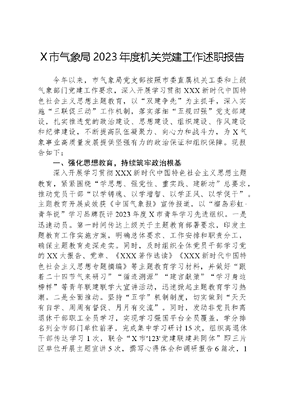 X市气象局2023年度机关党建工作述职报告今年以来,市气象局党支部按照市委直属机关工委和上级气象部门党建工作要求,深入开展学习贯彻XXX新时代中国特色社会主义思想主题教育,以双建争先为主抓手,深入实施三联促三动工作机制,落实落细五规四强党支部建设,扎实推进党的政治建设、思想建设、组织建设、作风建设和纪律建设,不断提高队伍凝聚力、向心力和战斗力,为X气象事业高质量发展提供坚强有力的政治保证和组织保障。现报告如下:一、强化思想教育,持续筑牢政治根基深入开展学习贯彻XXX新时代中国特色社会主义思想主题教育,紧紧围绕学思想、强党性、重实践、建新功总要求,推动党员干部以学铸魂、以学增智、以学正风、以学促干。主题教育开展成效获《中国气象报》宣传报道,以榴岛彩虹·青年说学习品牌获评2023年度X市青年学习先进组织。一是迅速动员。第一时间传达上级关于主题教育部署要求,印发主题教育工作实施方案,明确总体要求、工作安排和职责分工,确保主题教育走深走实。同时,及时组织全体党员干部学习党的XX大报告、党章、《XXX著作选读》《XXX新时代中国特色社会主义思想专题摘编》等主题教育学习材料,并做好跟着二十四节气来研习循迹溯源建言献策学习身边榜样等青年联建联学大宣讲活动,迅速掀起主题教育学习热潮。二是全面推动。坚持五学机制制度,切实做到天天有自学、周周有督促、月月有交流。同时,发动非党员和离退休干部职工全员学习,实现学习强国平台全员覆盖,学分排名列全市部门单位前茅。完成集中学习研讨15次,组织离退休干部传达学习1次,联合X市'123'党建联建共同体即三片区单位开展主题宣讲5次,撰写心得体会和调研报告6篇次,1篇在第八届全国气象科普论坛大会交流,1篇获市机关党建课题调研优秀论文三等奖。三是丰富载体。坚持线上线下学习相结合,今年以来,共组织开展红七月·七个一大陈岛垦荒精神实地学习、与新疆阿克达拉大气本底站党支部开展跨越4500公里的线上联学、参观学习X学术馆和X建设、循迹溯源调研X村防灾减灾和科普文化建设、参观中国工农红军第十三军教育基地并重温入党誓词等多形式活动共8次。将双龙村全国气象科普教育基地这一红色资源点位作为线下学习的主阵地,充分发挥其教育示范作用,深入学习XXX对防汛防台工作的重要指示和殷切嘱托。二、强化支部建设,不断夯实战斗堡垒持续强化五规四强党支部建设,打响榴岛彩虹·党旗飘扬党建特色品牌IP,不断提高队伍凝聚力、向心力和战斗力。支部工作获XX红云X机关党建等媒体宣传报道9篇次。一是加强组织生活。认真落实三会一课、民主评议等制度,就党员学习、党支部组织生活、党员培养发展、党内监督、双重组织生活、党风廉政建设责任、谈心谈话等制度进行规范化明确,定期召开支委会、党员大会认真研究支部工作,制定支部年度工作计划和学习计划。作为X市机关党建三片区副组长单位,与三片区单位共同成立X市'123'党建联建共同体,制定行动方案。全年召开三会一课、主题党日及志愿服务活动共51次。二是提升党务水平。依托X市'123'党建联建共同体平台,发挥部门联动合力,确保党组织换届选举、党员发展、党费使用、党员活动等各项党务工作规范有序。常态化开展主题教育期间的党务台账交叉互查、党务工作交流研讨、党务问题同题共答等活动。其中,制定《基层党务工作实用手册》1份,拍摄一问一答随手拍视频1个,开展基层党务工作调研活动3次,支部书记、党务干部培训学习5次,党务台账交叉检查3次,共查出党务不规范各类问题19个,共性问题13个,整改问题16个。三是抓实清廉建设。持续打响清风暖阳·榴屿气象廉洁文化品牌。通过开设廉洁课堂,观看警示教育专题片、签订廉洁承诺书、分享清廉家书;开展廉洁文化活动,种廉洁树、包青廉团、刻廉字、送廉枕;组织廉洁提醒谈话等多种方式,引导党员干部明辨是非、不碰红线,作风正派、廉洁自律,让清廉二字入心入脑、贯彻始终。开展常态化作风效能检查12次,让躺平混日子人员无所遁形,努力营造人人都当顶梁柱的实干争先氛围。三、强化责任落实,全力服务中心大局以党建品牌榴岛彩虹·党旗飘扬赋能气象服务供给,推进气象服务惠农惠民效益转化,发挥气象党支部战斗堡垒和气象党员先锋模范作用,践行服务为民办实事,积极助力社会公益、文明志愿等活动。一方面,主动下沉基层一线送服务。常态化开展党员干部下沉专项行动,在一线扎实开展人民至上·生命至上主题实践活动,认真落实社区吹哨、党员报到要求,积极使用先锋台XXXX等数字化平台,全年共开展各类志愿服务活动31次。其中,全体党员认领完成微心愿1个;赴X社区、X社区、X村、X村等基层村(社区)开展安全巡逻、文明创建、科