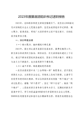 2023年度基层团组织书记述职报告2023年,在XX委和XX党支部的坚强领导下,我坚持以XXX新时代中国特色社会主义思想为指导,坚定扛起团组织书记职责,凝心聚力、锐意进取,带领广大团员青年以实干笃定前行,为XX发展贡献青春力量。一、2023年度总结(一)凝心聚力,组织建设日臻完善2023年,团支部认真开展团员发展培养、团费收缴等工作。团支部全体成员同力协契,踔厉奋发,在完善团组织建设上下功夫,通过不断夯实团组织基础建设,团务工作稳步提升,凝聚力与战斗力不断提升,充分展现青年干事热情。(二)谋干并举,制度建设有序推进一是坚持落实团中央三会两制一课制度要求。召开团支部团员大会、支部委员会会议,开展线上及线下团课,认真学习宣传贯彻党的XX大精神,带动全体团员深刻领悟两个确立的决定性意义,增强四个意识、坚定四个自信、做到两个维护。二是组织团员青年参与青年大学习。定期组织团员开展集中学习,学习内容涵盖XXX新时代中国特色社会主义思想、XXXXXX系列重要讲话和指示批示精神等内容,积极开展理想信念教育、爱国主义教育、国情和形势政策教育、道德品行教育、法纪教育,着力加强团员政治教育和政治训练。三是开展专项学习组织党员集体收看党的XX大开幕会,召开展学习宣传贯彻党的XX大精神专题研讨,确保会议精神入脑入心。(三)深入开展各项活动,锻炼青年实践能力一是坚持党建带团建模式。团支部同党支部合作开展业务活动,推动党建工作与业务工作结合,为发展焕发新动能。二是围绕重点开展工作。团支部年围绕国家重大战略、本地区本单位党的中心任务和急难险重新工作,参与了疫情防控等多项活动,助力团员学习理论知识的同时,为团员青年发展兴趣爱好结交朋友、打开视野提供了更广阔的平台。三是组织团员青年开展社会实践和志愿服务。团支部联动结对社区,先后组织开展基层防疫等社区志愿活动,助力环境保护、疫情防控、反诈宣传等主题行动,引导团员青年增强社会责任感,共同建设美好家园。二、存在的问题与不足一是对团组织建设工作中遇到的新情况、新问题思考不够多比如在谋划团组织工作时,对存在的一些深层次问题考虑还不足掌握情况还不够透彻,缺少管用可行的创新举措。二是调查研究还不够深入。对团组织工作的指导还不够具体,与团员坐下来、面对面开展团务调研、谈心谈话工作的时间较少。三是团建亮点不够突出。结合单位实际,体现创新、亮点的自选动作还存在不足,没有充分挖掘基层党建首创成果,对标兄弟单位先进经验和做法还存在诸多短板。三、2024年工作计划(一)坚定理想信念,深化思想政治理论武装持续深入推进团员青年的思想教育,结合党史学习教育,依托学习强国青年大学习等平台载体,不断丰富知识储备增进对党的认识,提高综合素质,有效推动认识两个确立的决定性意义,增强四个意识、坚定四个自信、做到两个维护。(二)坚持从严治团要求,纵深推进制度建设一是继续坚持党建带团建的模式。紧密围绕党支部的重大决策部署,把党的要求贯彻落实共青团的建设当中,坚持党的领导贯穿工作始末。二是继续抓好三会两制一课。落实好支部大会、支部委员会、团小组会、团员教育评议制度、团员年度团籍注册制度、团课,引导团员增强政治意识、大局意识、核心意识、看齐意识,让团员更加紧密地团结在党中央周围。三是开好团支部组织生活会。通过团的组织生活会提高团员的思想政治觉悟,增强团员的组织纪律观念,提高团员履行团员义务的自觉性。同时保证团员行使权利,使团员有机会以主人翁的态度讨论和评价团的工作,参加关于团的工作和青年关心的问题的讨论,监督团支部干部的工作。(三)坚持多措并举,高效强化队伍建设一是坚持民主集中制,发扬团内民主。尊重团员主体地位,严肃团的纪律,提高解决自身问题的能力,保证团的决议得到有效的贯彻执行。二是全面开展推优入党和推优入团工作团支部将针对团员的平时表现,对表现优异的团员进行入党推荐同时吸纳优秀青年加入团组织。三是探索完善激励机制。持续完善人才发现、培养、激励机制,深挖人才潜力,激发创新活力,努力将团支部打造建设成为一个具有感召力、凝聚力、战斗力的先进青年组织。(四)坚持活动引领,助推团员青年全面发展深化学习教育,结合工作实际,围绕爱国主义、传统文化、社区实践、艺术体育、志愿服务等专题,于组织内外开展形式多样、内容丰富的青年活动,切实促进青年思想道德文化建设,树立先进青年品牌形象。