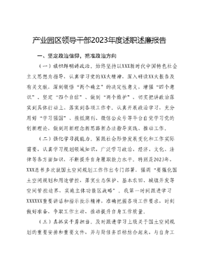 产业园区领导干部2023年度述职述廉报告一、坚定政治信仰,把准政治方向(一)旗帜鲜明讲政治。始终坚持以XXX新时代中国特色社会主义思想为指导,认真学习党的XX大精神,深入研读XX大报告及有关文献,深刻领悟两个确立的决定性意义,增强四个意识、坚定四个自信、做到两个维护,切实把讲政治落实到具体行动上、落实到各项工作中。认真开展政治学习,充分用好学习强国、报纸期刊、微信公众号等平台自觉学习党的创新理论,做到用新理念新思路新办法指导实践、推动工作。(二)强化学习提能力。紧跟社会形势发展变化和工作实际需要,认真学习规划领域知识,广泛学习政治、经济、文化、法律等各方面知识,不断提升自身履职能力水平。特别是2023年,XXX总书多次就国土空间规划工作作出专门部署,强调要强化国土空间规划和用途管控,落实生态保护、基本农田、城镇开发等空间管控边界,实施主体功能区战略。我第一时间跟进学习XXXXXX重要讲话和指示批示精神,准确把握各项工作要求,时刻做好准备,争取工作主动,推动提升自身工作质量。(三)真抓实干勇担当。及时跟进学习上级关于国土空间规划的重要安排和重要文件,并与局任务目标结合起来,与自身工作职责结合起来,真抓实干、狠抓落实,推动上级各项重大部署走深走实、见行见效。二、坚持恪尽职守,推进重点工作(一)积极推进国土空间规划体系建设。聚焦大连市政府工作部署,根据园区自身发展方向和发展实际,与市级国土空间总体规划同步开展园区国土空间分区规划的编制工作,提出山水林田湖海等自然资源管控要求,保障园区发展空间,合理安排各类用地布局,重点推进以下几个方面工作:一是落实英歌石科学城规划建设,全面提升园区科技创新能力;二是合理布局产学研创新发展空间,构建活跃的园区创新创业生态;三是科学布局产业发展空间,保障园区以数字经济为特色的现代产业集群发展;四是加强与园区国民经济和社会发展十四五规划衔接,保障重点建设项目落地;五是统筹考虑园区空间拓展后的区域协调与功能布局。(二)扎实推进园区国土空间规划。一是按照市自然资源局统一工作部署,完成全区三区三线划定工作,并重点保障英歌石科学城的发展空间;二是对园区划入市级总体规划中心城区部分规划方案进行细化研究,优化用地布局;三是进一步完善英歌石科学城用地布局方案,并加强分区规划与英歌石科学城规划衔接工作;四是加强重点区域规划选址论证工作;五是园区整体风貌控制规划,旨在加强城市设计引导,提升园区建设品质。(三)着力提升规划管理水平。组织召开11次园区规划委员会,审议地块收储情况35宗、选址论证及规划设计条件46件、地块出让划拨置换及收回方案53项、及规划方案5项。办理项目公示8件,核发规划条件37件,规划核实11件,发放《用地预审和项目选址意见书》6件,发放《建设用地规划许可证》9件,《建设工程规划许可证》10件,处理民心网民意网12345等投诉56件,政府信息公开25件。三、履行岗位职责,严守纪律规矩(一)严格落实一岗双责。坚定扛稳自身党建职责,认真落实三会一课、组织生活会、谈心谈话等制度,以普通党员身份参加支部活动。对倾向性苗头性问题有针对性地进行研判引导切实把意识形态工作做在前、做到位。(二)加强廉政建设。持续强化廉洁和作风建设,落实全面从严治党要求,推进科室廉洁文化建设,强化制度意识和法治思维,做到依法依规办事,不断强化制度执行力和治理能力。(三)始终严以律己。严格遵守党章党规党纪,自觉遵守国家法律法规和单位各项规章制度,落实中央八项规定及其实施细则精神和各项廉政规定,严于律己、秉公用权,坚决反对四风特别是形式主义、官僚主义,持续强化清正廉洁行为规范。(四)弘扬良好作风。规划管理工作量大、专业性强,要做好这项工作,就必须勤奋务实、踏实肯干、雷厉风行。工作中我坚持勤勉敬业作风,团结协作、认真负责,在工作中领着干、带头干、具体干,不推诿、不拖延、不敷衍,确保政令畅通、令行禁止。特别是面对疫情防控大战大考,积极响应组织号召,投身防控工作,践行初心使命、积极担当作为、服务工作大局。四、2023年工作中存在的不足一年来,尽管取得了一些成绩,但仍存在一些问题和不足,主要表现在以下几个方面。一是理论武装需要继续入脑入心。工作中越来越认识到学习的重要性,但具体事务性工作占用精力多,更多把重心放在事务性工作上,自己静下心来开展理论学习研究做得还不够,投入的时间和精力还不足,深入思考、学用结合与预期要达到的程度还有差距。二是部分重点工作推进效果还不够理想。受经济大环境影响在推进规划编制工作时有时无法及时到达现场调研,无法有效与各方面对面沟通,对一些工作持续跟踪问效做得不够,导致工作成效不理想。三是工作作风需要继续从严从实。时刻牢记XXXXXX对作风问题任何时候都不能掉以轻心的要求,以严的作风、