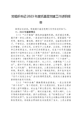 党组织书记2023年度抓基层党建工作述职报告按照会议安排,现就履行基层党建工作责任述职如下:一、2023年履职情况(一)三个坚持强化担当履职尽责。抓好基层党建,履行第一责任人职责。一是坚持开展理论学习,紧紧围绕学思想、强党性、重实践、建新功的总要求,全面落实理论学习、干事创业、检视整改等重要措施,以实际行动在以学铸魂、以学增智、以学正风、以学促干上见真章、出实效。开展党委书记讲党课X次,支部书记讲党课X次,在X个村开展XXX新时代中国特色社会主义思想进农村宣讲活动。二是坚持落实目标任务,建立《村两委工作交接清单》《近期重点任务清单》《镇村两级书记抓党建责任清单》三个清单,明确干部责任;开展能力提升、向上问计、头雁领航三大行动,提升干部素质;健全小微权力清单、工作督导、量化考核三项机制,督导责任落实。三是坚持农村重点工作月度考核,亮成果、晒业绩,培育X个镇域优秀村,其中X和X村在X市党组织分档管理中被评为X档。考核制度的实施,促使实干兴X组工争先活动取得明显效果,受到X大督查第X督察组的肯定与表扬。(二)四个全面狠抓落实注重实效。一是全面发挥两个作用。X个党组织、X个志愿服务队、X余名志愿者开展人居环境整治、安全生产等志愿活动,践行使命担当。二是全面推行两会一团。制定实施方案,利用大喇叭、公众号等载体提高知晓度,提升治理效能。在村情恳谈会议事作用的发挥下,X出村道路两侧X户村民主动腾出田地支持道路拓宽规划,将道路由原来的X米拓宽到了X米。三是全面推进村级事务公开平台规范化建设,着力打造指尖上的公开。规范公开内容,严把质量关,X余条事项码上公开,接受群众监督。四是全面提升党组织书记头雁领航能力。率先完成X个村党组织书记大专以上学历X%提升;召开党建擂台赛X次,促使村干部有学习、有晾晒、有收获,于边讲边干中实现学做结合。(三)三个创新激发活力凸显成效。找准创新路径,激发党建活力。一是创新载体为民办实事,以两会一团、干群夜谈会为载体,推动X个村开门一件事全部落地见效,X村X树下话发展集体增收有盼头典型案例入库省委组织部。二是创新思路促集体增收,制定一村一策,指导各村因地制宜发展特色种植业、生态养殖业、乡村旅游业,集体收入X万元村全部清零。三是创新方法提升干部素质,加强干部队伍日常教育管理和综合能力培育,在全市召开的实干兴X、村社争先擂台赛中,X村在基层治理主题擂台赛中荣获X等奖。二、存在问题及原因分析一是部分村两委班子能力素质、理论水平不高,X村、X村两委干部文化素质整体偏低,平均年龄偏高,接受新事物能力较弱,缺乏创新精神,综合素质待提升,抓班子带队伍建设方面需加强。二是阵地规范化建设水平有待提高,一方面像X、X村党员人数多,但阵地狭小、配套设施陈旧、不能满足党组织正常开展活动,需加快阵地改造提升。另一方面党支部缺乏凝聚力,出现热情不够、活动开展不够的现象,党建活动难见成效。三是村集体发展经济缺乏大胆的创新思维,求稳心理重;收入来源简单,经营性收入较低,在原有产业基础上,以党建促进产业升级、优化产业结构的能力仍需进一步努力。三、2024年工作打算(一)强化业务培训,提升农村干部综合素质能力。着眼于加强村干部队伍建设,采取定期组织学习、实地调研、观摩拉练、述职演讲、党建大比武等方式,促使村干部每月有学习、有晾晒、有收获,综合素质能力最终实现大提升。(二)加强阵地建设,提升村级规范化建设水平。一是抓点带面,示范带动。X新阵地建设已完工,下步将加强办公场所和基本制度设施配套;建成示范点,发挥典型带动和引导作用,促进镇域各村阵地建设大提升。二是强化功能,凸显作用。将阵地建设和日常工作相结合,充分发挥阵地政治功能,使之成为党员议事参政的大平台。三是营造氛围,加强学习。定期召开三会一课,利用好远程教育平台,提高群众受教育比重,扩大党建工作影响力和渗透力。(三)发挥党建引领,提升集体经济收入助力产业振兴。一是转变村干部发展思路,向上问计,多为村里谋出路想办法,提供政策引导和支持。二是组织外出学习,积累致富经验。带领村支部书记、致富带头人走出去学习经验,打造一村一品,发展高效农业。三是促进党支部领办合作社示范点落地见效。2024年实现党支部领办合作社全覆盖,围绕适宜发展模式,吸纳更多党员群众入社,实现收益分红,促进村集体和农户双增收、共致富。