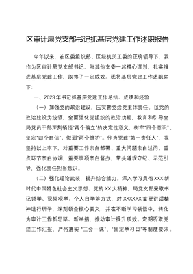 区审计局党支部书记抓基层党建工作述职报告今年以来,在区委组织部、区级机关工委的正确领导下,我作为区审计局党支部书记,与其他支委一起精心谋划,扎实推进基层党建工作,取得了一定成效。现将基层党建工作述职如下:一、2023年书记抓基层党建工作总结、成绩和经验(一)加强党的政治建设,压实管党治党主体责任。以党的政治建设为统领,全面强化党组织的政治功能,教育和引导全局党员干部深刻领悟两个确立的决定性意义,树牢四个意识、坚定四个自信、做到两个维护。作为党建第一责任人,我坚持以上率下,对重要工作亲自部署、重大问题亲自过问、重点环节亲自协调,重要事项亲自督办,带头遵规守纪、示范引导,强化责任担当意识。(二)强化理论武装,提升综合能力。深入学习贯彻XXX新时代中国特色社会主义思想、党的XX大精神,局党支部采取书记领学、视频观学、个人自学等方式,对XXXXXX重要讲话精神进行研学,深刻领会核心要义,并在不断学习领悟中,转化为审计工作新思路、新举措,推动审计提升质效。定期听取党建工作汇报,严格落实 三会一课、固定学习日等制度要求。全年开展集体学习共*余次,组织开展重温红色记忆传承革命基因等主题党日活动*次,全年全局学习强国参与率、活跃率基本保持*%以上,党员干部理想信念和宗旨观念不断增强,学习型党组织建设不断深化。(三)紧扣国之大者,践行为民初心。一是深入贯彻XXXXXX对审计提出的以审计精神立身、以创新规范立业、以自身建设立信总要求,自觉地把政治建设摆在首位,加大对重大政策措施贯彻落实、重点民生资金和项目的审计力度,着力揭示经济社会运行中各类风险隐患、确保党的重大决策部署到哪里、审计工作就跟进到哪里。二是践行审计为民理念,2023年陆续开展了一大批涉及教育、卫生、社保、粮食等民生领域审计项目,着力解决人民群众急难愁盼问题,助力补齐民生短板,促进党的各项惠民政策落到实处,用审计力度呵护民生温度。三是深入*社区开展村村到、户户进、人人访集中走访调研,提升主动服务意识;组织全体党员下基层开展双报到双服务活动,倾听社情民意,践行审计为民初心。四是发动党员干部带头参加我先上、跟我上行动,助力全区护林防火、创文创卫等工作。(四)深化廉政教育,强化监督执纪。一是加强廉政教育,推进作风建设。开展转作风、提效能、树形象活动,从严从紧落实中央八项规定和实施细则精神、审计四严禁和八不准工作纪律,力戒不作为、慢作为、乱作为等慵懒散拖问题发生,着力营造风清气正、廉洁高效的清廉环境。二是深入查摆问题,推动工作提质增效。结合审计工作实际,采取群众提、自己找、互相帮等多种形式,重点排查不思进取、作风拖沓、效率低下、纪律淡薄、执行不力等行为,建立问题清单,抓好整改,推动工作提质增效。三是坚持依法审计,弘扬实干之风。坚持一切从实际出发,制定和实施好审计计划;创新方式方法,为被审计单位减负;注重审计监督与服务并重,发挥审计在宏观管理中的作用,为区委区政府决策提供重要参考。二、抓基层党建方面存在的突出问题一是党建工作的重要性认识不足。作为党支部书记,对党建工作投入精力还不够,谋划和指导还不够到位,党建就是最大政绩理念还需加强,没有真正严起来,管到位。三是党建活动的创新程度不足。满足于按部就班地开展中心组学习三会一课等活动,对如何增强政治功能,提升组织力和组织生活质量思考不多,谋划不深。对政策理论没有学深学透,缺乏解刨麻雀的钻研精神,党建活动有点墨守成规,缺少活力,缺乏党味。三是对党建工作的信息宣传有待加强。未能充分利用好学习阵地和平台,全局刊用的党务信息相对较少,缺乏党建工作的辐射效应。产生问题的原因主要有三个方面:一是抓党建的主责意识没有树牢,时常缺位,由于审计业务工作繁重,没有把业务和党建工作深入融合。二是抓党建的思维不够开放,创新意识不强,工作方法、措施缺乏大格局、站位不高。三、2024年度书记抓基层党建工作的思路、重点和措施2024年,我支部党建工作将继续以XXX新时代中国特色社会主义思想、党的XX大精神为指导,落实好主体责任,进一步增强服务大局的主动性、针对性和有效性,为推动审计事业高质量发展提供强有力的组织保障。(一)全面提升政治定力。把政治建设摆在首要位置,全面强化党组织的政治功能,教育和引导党员干部严守政治纪律和政治规矩,切实做到对党忠诚,坚定维护XXXXXX的核心地位、领袖权威,在政治立场、政治方向、政治原则、政治道路上同党中央保持高度一致。(二)以制度落实抓好党建工作。保证制度的执行力,用好的制度管人,敢于较真碰硬,敢于互相批评,提高党内政治生活的原则性。落实制度体现规范性,全面夯实党建工作基础,健全党建工作机制,切实提高党建工作的科学化水平。(三)全面落实从
