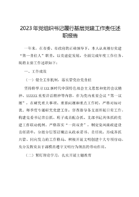 2023年党组织书记履行基层党建工作责任述职报告一年来,在市委、市政府的正确领导下,本人认真履行党建第一责任人职责,以党建促发展,全面完成年度工作任务,现将主要工作述职如下:一、工作成效(一)健全工作机制,落实管党治党责任坚持将学习XXX新时代中国特色社会主义思想和党的会议精神、XXXXXX重要讲话精神等内容,作为党内重要会议第一议题,在研究重大事项、重要问题和重点工作时,严格对标对表。每季度专题研究党建工作,督查指导各支部开展日常工作,构建党委书记亲自抓、班子成员配合抓、支部书记具体抓的党建工作联动机制。严格落实一岗双责,制定党风廉政建设责任清单,分级分层签订廉洁从政承诺书、责任状,形成齐抓共管、同向发力的工作格局。积极开展文明创建十大专项行动,充分发挥党员干部模范遵守文明行为规范的带动作用。(二)紧盯理论学习,扎实开展主题教育一是精心谋划部署。及时召开党委委员会议,传达学习各级主题教育工作会议精神,研究谋划本单位主题教育工作,制定重点工作任务清单。召开党委扩大会议,学习领会XXXXXX关于主题教育系列重要讲话精神,解读市主题教育实施方案和本单位工作任务清单,明确目标任务、时间节点和责任主体。二是做好示范引领。坚持党委会第一议题学和中心组专题学,原文领学党章、党的XX大报告和《专题摘编》等书籍。中心组成员结合所思所悟开展高质量交流研讨,注重理论学习与工作实践相结合,带头讲好专题党课。三是抓实三个活动。认真开展建言献策促发展立足岗位作贡献及学习身边好榜样活动,组织党员深入群众听访民意民情,解决实际问题。设立党员示范岗,组建党员志愿服务队,结合党建+微网格,进社区服务群众,开展结对共建活动,持续为民办实事好事。四是认真检视整改。结合单位实际,深入查摆执行上级组织决定、严格组织生活、加强党员教育管理监督、联系服务群众、抓好自身建设等5个方面突出问题,制定整改措施,明确整改目标和整改时限,着力固强补弱、破难攻坚,以主题教育整改整治成效提升本单位工作质效。(三)加强组织建设,夯实党建基层基础巩固提升党支部五化建设,认真落实三会一课、主题党日等制度,开展党务知识培训班,完善两个指数考核管理。深入推进党代表微宣讲党员人人讲微党课活动,全面加强党员干部学习教育。按照党章等有关规定,*党支部于6月份完成换届选举,进一步夯实了组织基础。严格发展党员程序,今年在优秀青年和业务骨干中发展新党员6名,预备党员转正8名,培养入党积极分子20名。扎实推进我为群众办实事等结对共建活动,组织开展的*等活动先后被*党建、*日报等平台推介报道。(四)全面从严治党,深化清廉单位建设全面压实两个责任,深入推进清廉单位建设。创新开展清廉主题系列活动,提高廉洁意识;严格落实教育提醒、集中学习和警示教育,念好廉洁紧箍咒;抓细抓实月考核、季查房、年综合考评等举措,规范廉洁行为,开展日常监督、专项督查、专项整治行动60余次。加强重点领域、重点项目和重点人员监督,对财务、采购、人事等重要岗位的中层干部实行轮岗竞聘。召开建设项目负责人、政府采购招标代理公司、设备供应商等廉洁教育会4次,开展例行廉政谈话、新任干部履新谈话、日常廉政谈话100余次。开展廉洁知识抢答赛、廉洁诗歌朗诵等活动,报送的廉洁书法作品被清廉*刊载。(五)压实主体责任,牢牢把握意识形态压紧压实意识形态工作责任制,健全意识形态领域重大情况分析研判、应急处置等机制,深化网络综合治理,守住管好各类意识形态阵地。本人联系2个基层党支部,每季度深入联系支部指导工作,与支委班子成员当面交流。今年为全体党员干部讲党课2次,为联系支部讲党课2次。定期与重点岗位、敏感科室负责人谈心谈话,每天坚持下基层查房,与一线职工沟通交流,凝心聚力、共谋发展。7月份,组织全体党员共同参观省博物馆,深入了解我省的历史文化和光辉历程,从千年凝聚的红色基因中汲取精神力量。(六)正确选人用人,着力提升队伍能力建立健全人才队伍培养和管理机制,有计划、有目的、分层次培养人才梯队,设立专项人才培养基金。落实人才计划和柔性引才政策,引进博士研究生、硕士研究生5名,学科青年人才6名。制定人力资源配置方案,合理配置岗位人员,今年通过定岗定编优化岗位10个,优化人员30人,激发了新活力。开展第三届十佳人才评选活动,评选出十佳*优秀*20名,有力加快了人才队伍建设。二、存在的问题一是抓党员教育方式方法单一。个别党支部在对党员的教育上没有针对性,对阶段性的内容与阶段性的工作和形势任务结合不紧密,教育实效性不强,导致党员干部参加组织生活不积极、不认真,有应付了事的现象。二是人才梯队培养规划不够清晰。部分学科人才梯队培养规划不太系统不太科学,出现断层等现象,优秀人才培养迫在眉睫,学科带头人考核工作