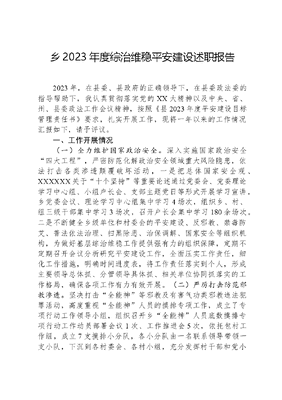 乡2023年度综治维稳平安建设述职报告2023年,在县委、县政府的正确领导下,在县委政法委的指导帮助下,我认真贯彻落实党的XX大精神以及中央、省、州、县委政法工作会议精神,按照《县2023年度平安建设目标管理责任书》要求,扎实开展工作,现将一年以来的工作情况汇报如下,请予评议。一、工作开展情况(一)全力维护国家政治安全。深入实施国家政治安全四大工程,严密防范化解政治安全领域重大风险隐患,依法打击各类渗透颠覆破坏活动,一是把总体国家安全观、XXXXXX关于十个坚持等重要论述通过党委会、党委理论学习中心组、小组户长会、支部主题党日等形式开展学习宣讲,乡党委会议、理论学习中心组集中学习4场次,组织乡、村、组三级干部集中学习3场次,召开户长会集中学习180余场次。二是不断健全乡级单位和村委会的平安建设、反邪教、禁毒防艾、普法依法治理、扫黑除恶、治保调解、国家安全等组织机构,为做好基层综治维稳工作提供强有力的组织保障,定期不定期召开会议分析研究平安建设工作,全面压实工作责任,细化工作措施,明确时间进度表,将工作责任落实到个人,形成主要领导总体抓、分管领导具体抓、相关单位协同抓落实的工作格局,确保各项工作有力有效开展。(二)严厉打击防范邪教渗透。坚决打击全能神等邪教及有害气功类邪教违法犯罪活动,高度重视全能神人员的摸排专项工作,成立了专项行动工作领导小组,组织召开乡全能神人员底数摸排专项行动工作动员部署会议1次、工作推进会5次,依托包村工作组,成立7支摸排小分队,各小分队由一名联系领导带领一支小队,下沉到各村委会、各村小组,充分发挥村干部和党小组的排头兵作用,积极开展四轮摸排行动,做到摸排工作全面覆盖,确保村不漏户、户不漏人。(三)认真开展特殊群体服务管理,打好命案防控攻坚战一方面,紧盯重点区域、重点行业、重点领域、重点人员,健全落实人民调解、司法调解、行政调解三调联动和多元化调解机制。全乡共有社区矫正人员9人,刑释解矫人员46人,全部按要求定期开展帮教工作;全乡有在册精神病人82人,卫生院2名医护人员和2名派出所民警共同挂包进行网格化管理全乡有留守儿童57人,明确学校教师、干部职工进行一对一包保开展关爱帮扶教育,切实将风险化解在初始和萌芽状态。另一方面,全面贯彻落实省、州、县制定下发的命案防控工作各项文件规定,进行严密安排部署。年内研究部署命案防控工作4次,召开全乡性命案防控专题工作会议2次。同时,乡以预防和减少可防性刑案、命案为重点,坚持问题导向,抓源头防范,以加大各类矛盾纠纷、家庭风险隐患排查化解和重点人群跟踪管控为重点,强化源头治理、综合治理,确保不发生命案。(四)组织开展防范电信诈骗工作。坚持严打方针,包村工作组联合派出所民警到各村小组结合反诈宣传案例及高发警情开展入户宣传,现场推广下载国家反诈中心APP817人次,在醒目位置张贴防范电信诈骗宣传海报10余份、发放宣传手册300余份,组织反诈宣传入校宣讲6场次,通过老师、学生将防范电信诈骗知识传递给家人,形成一个孩子带动一个家庭的宣传效应。(五)推进矛盾纠纷大排查大化解工作。积极落实综治中心牵头、包村工作组负责、责任单位配合联动的矛盾纠纷化解机制,实现矛盾纠纷一站式接待、一揽子化解。2023年初排查各类矛盾纠纷46户(高风险14户,中风险6户,低风险16户),已成功消除风险28户。另一方面,积极化解信访案件。坚持预防为主、教育疏导、依法处理、防止激化的原则,建立健全了排查、预警、联调、处置等矛盾纠纷排查调处工作机制,全乡共有3名重点信访人员,全部落实网格化管理。(六)信访工作开展情况。及时召开专题会议研究部署重要会议期间安保维稳信访工作,制定信访突出问题及重点群体重点人员包保稳控方案,落实包保重点人员责任,由班子成员带队对村委会、相关的职能站所落实维稳信访工作情况进行督促检查,确保发现问题及时整改,排查纠纷及时调处,收到信访及时回复,真正做到工作有人抓、问题有人管、责任有人担。另一方面,积极化解信访案件。坚持预防为主、教育疏导、依法处理、防止激化的原则,建立健全了排查、预警、联调、处置等矛盾纠纷排查调处工作机制,全乡共有3名重点信访人员,全部落实网格化管理,现已成功化解2名,有1名正在沟通努力中。2023年以来,乡共收到6件上级交办的信访案件,及时受理6件,办结3件,年内未发生重点人员赴昆进京上访事件。2023年重要会议期间我乡未发生到州、到省和进京上访事件。(七)扎实开展普法强基补短板工作。根据普法强基补短板专项行动工作要求和具体职责任务,乡召开动员部署、工作推进等各项会议12次,对普法强基专项行动进行安排部署,明确工作职责,细化工作责任。结合一标三实信息采集工作,进村入户,向群众宣传国家反诈中心App注册