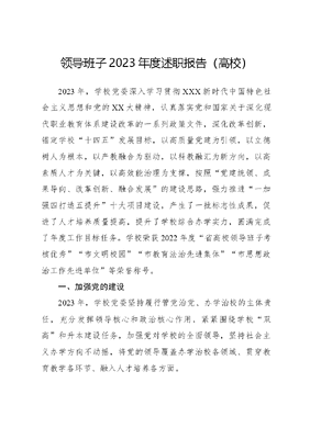 领导班子2023年度述职报告(高校)2023年,学校党委深入学习贯彻XXX新时代中国特色社会主义思想和党的XX大精神,认真落实党和国家关于深化现代职业教育体系建设改革的一系列政策文件,深化改革创新,锚定学校十四五发展目标,以高质量党建为引领,以立德树人为根本,以产教融合为驱动,以科教融汇为新方向,以高素质人才为关键,以高效能治理为支撑,按照党建统领、成果导向、改革创新、融合发展的建设思路,强力推进一加强四打造五提升十大项目建设,产生了一批标志性成果,促进了人才培养质量提高,提升了学校综合办学实力,圆满完成了年度工作目标任务。学校荣获2022年度省高校领导班子考核优秀市文明校园市教育法治先进集体市思想政治工作先进单位等荣誉称号。一、加强党的建设2023年,学校党委坚持履行管党治党、办学治校的主体责任,充分发挥领导核心和政治核心作用,紧紧围绕学校双高和升本建设任务,加强党对学校的全面领导,坚持社会主义办学方向不动摇,将党的领导覆盖办学治校各领域、贯穿教育教学各环节、融入人才培养各方面。(一)充分发挥党委领导核心作用,把方向、管大局、保落实一是严格落实党委会、校长办公会制度。始终坚持党委领导下的校长负责制,完善党政分工协作的工作机制,充分发挥领导班子集体的作用,全年召开党委会xx次,校长办公会xx次。二是严格落实决策部署。贯彻以党的建设高质量推动事业发展高质量理念,定期召开党建工作例会、基层党组织书记抓党建工作述职评议,开展基层党建督查,推进党建工作落实。三是深入学习贯彻XX大精神,扎实推进主题教育。切实落实党委理论中心组学习制度。制定学习计划,转化学习成果,做好理论学习与学校发展、学习宣传贯彻党的XX大精神和主题教育结合文章,全年党委理论学习中心组集中学习xx期。党委书记宣讲专题党课,基层党组织开展讲师团宣讲、七一专题党课、培训辅导、心得分享会等多形式、分层次、全覆盖的全员教育培训。坚持高标准深化主题教育,学校党委聚焦主题主线,全面对标对表,把推动学校高质量发展作为主题教育的着力点和落脚点,一体化推进理论学习、调查研究、检视整改等工作,把主题教育成效转化为推动学校高质量发展的生动实践。(二)夯实党的建设基础,提升党建工作质量一是持续深化党建领航工程,围绕基层党组织攀登、党员先锋、党务工作者红领、党建工作筑力四大计划,深入实施党建+双带头人培育工程和一总支一品牌一支部一特色活动。《创建党建特色品牌,凝聚医学育人合力》荣获全国职业院校党委书记抓基层党建优秀案例。《党建红+护理白筑牢人才培养主阵地》荣获xx省高校党建工作典型案例二等奖。二是提升党建工作水平,抓好抓实系部党政联席会,完成校级两优一先评选表彰,获评市教育工委先进基层党组织x个、优秀共产党员x名、优秀党务工作者x名。全年发展党员xx名,预备党员xx名,确定入党积极分子xxx名。加强党建工作研究,xx省高校党建研究会课题结题x项,立项x项。(三)加强干部队伍建设,强化干部教育培训和管理一是提升领导干部思想觉悟和业务能力,组织各级干部参加培训班。党委书记参加全省高校党委书记教育强国专题读书班研讨会,处级以上干部参加xx干部网络学院培训班,x名系部党支部书记参加2023年全国高校学生党支部书记主题教育网络培训班,x名双带头人教师党支部书记参加全省高校基层党组织书记示范班培训。二是加强业务型干部的培养和使用,推进干部年轻化进程,调整充实系部教学科长岗位,公开竞聘选任副科级干部2名。(四)聚焦立德树人根本任务,抓好思想政治教育工作一是构筑三进扎根工程。制定三进年度实施方案把学习宣传贯彻XXX新时代中国特色社会主义思想和党的XX大报告作为思政课程和课程思政的重要内容。二是共筑三全育人工程。制定创建国家级三全育人典型学校年度推进计划,召开培育建设工作会议,统筹实施十大育人质量提升工程,打造线上线下、课上课下、校内校外的思政工作立体格局,xx项重点工作任务稳步推进。提炼形成具有医专特色的示范性育人项目和品牌x个。xx省人力资源社会保障科研合作课题《职业教育三全育人新格局实践研究》顺利结题。《党建引领铸魂育人打造医学职业院校思政工作品牌》荣获xx省政研会2023年度基层思想政治工作优秀案例。三是继续推进以学生为主体的党建+思政课实践教学创新。举办大学生讲思政比赛,x部优秀作品被推荐省级竞赛平台。在第六届我心中的思政课全国高校大学生微电影大赛上,作品《半条被子》斩获全国二等奖。四是建设思政课教师教学创新团队。开展系统化培训xx余人次,集体备课xxx余次,教学方法集中研讨x次。教师参加各类理论宣讲xx人次,x名教师被评为市普法宣传员。获得xx省第三届教育科学研究优秀成果奖一等奖x项,xx