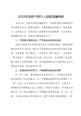 2023年党员干部个人述职述廉报告全年以来,在党支部的坚强领导下,我始终坚持以XXX新时代中国特色社会主义思想为指导,不断提高政治判断力、政治领悟力、政治执行力,坚决落实上级党委各项决策部署,扎实开展分管领域各项工作。现将有关情况报告如下:一、不断强化理论武装,严守政治纪律政治规矩坚持以XXX新时代中国特色社会主义思想为统领,积极参加党组织的各类学习活动,重点学习贯彻落实党的XX大及系列会议精神,切实增强四个意识,牢固树立四个自信,坚决做到两个维护,始终在政治立场、政治方向、政治原则、政治道路上同党中央保持高度一致,坚定做XXX新时代中国特色社会主义思想的信仰者、践行者和奋斗者。二、加强业务知识学习,不断提高自身综合素质以学为先,重视理论和业务知识学习,不断提升自身的综合素质水平和业务能力,进一步增强法制意识和法制观念。以挤为法,在工作时间之外有针对性地进行学习,认真学习XXX新时代中国特色社会主义思想、中国共产党党史、乡村振兴战略以及xx相关法律知识,深刻领会其思想内涵。以点为要,充分结合基层工作实际特点,在学习效果上做到找重点,抓难点,破关键,并以其作为推动农业农村工作的助推器。三、明确工作重点任务,推进xxx工作落地见效一是在xxx工作中,扎实推进xxx工作,与xxx做到精准对接,对xxx工作做到精准监测,不断巩固工作成效,实现xxx目标。二是坚持xxx主导地位,持续抓好xxx特色工作,将xx工作推向实处。三是全力推进xxx工作,深入到xxx指导,并加强xx配套工作落地见效,以零容忍的态度坚决遏制xxx行为。四是做好XXXX工作,积极做好宣传,深入推进xxx建设,实现xxx全覆盖,及时落实好环保督查要求。四、严守廉洁自律底线,保持务实清廉政治本色全年严格遵守《中国共产党廉洁自律准则》,带头贯彻执行中央八项规定精神,严格执行个人有关事项的报告制度,按时如实向组织报告个人有关事项。始终以谦虚谨慎、不骄不躁、艰苦奋斗的作风要求自我,从未有特权主义思想和行为,做到清正廉洁干工作、依法依规办事情,对家人子女也严格教育,做到廉洁修身、廉洁齐家。工作期间,能够经常调研走访,倾听人民群众的心声,聚焦xxx问题,抓好xxx工作,把解决好人民群众最关心、最直接、最现实的问题作为工作导向和目标开拓思路、创新工作方式方法探索富有实效的服务和举措。五、存在不足之处(一)政治理论学习还不够及时。没有养成时时汲取新知识新理论的良好习惯,对学习抓得不紧,没有做到持之以恒,缺乏激情。(二)学习成效还不够显著。未能从战略的高度充分认识到系统的理论知识和成熟的战略思维,对实际情况了解还不够深入与基层群众没有进一步拉近距离。(三)工作创新意识还不够。工作存在惯性思维,凭经验办事,有时还习惯凭经验考虑问题和办事,习惯用一些老办法、老套路、老思维来想问题,缺乏创造性开展工作。六、下一步工作计划(一)要把强化理论武装作为动力源泉。坚持把学习党的创新理论作为终身必修课,在学深悟透中加强理论修养,在融会贯通中强化系统把握,在知行合一中提高工作水平,推动学习贯彻往深里走、往心里走、往实里走,持之以恒补精神之钙。(二)要把勇于担当干事作为不懈追求。坚持把担当作为一种责任和使命。积极推进xxx工作,在总结中不断提出新思路,对xxx工作进行分析调研,拿出新举措,做大做强xxx产业,突出特点特色,推动高质量发展。(三)要把坚守为民初心作为价值取向。牢固树立为民服务思想,将保障和改善民生作为一切工作的出发点和落脚点,扎实推进xxx建设,补齐xx工作短板。集中精力抓重点难点和薄弱环节的突破,着力解决好人民群众的忧心事、烦心事,不断增强人民群众的获得感幸福感安全感。