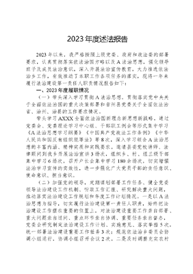 2023年度述法报告2023年以来,我严格按照上级党委、政府和政法委的部署要求,认真贯彻落实依法治国方略以及A法治思想,强化领导班子及成员法治意识,深入开展法治宣传教育,大力推进依法治乡工作,有效推动了本职工作各项任务的落实,现将一年来履行法治建设第一责任人职责情况报告如下:一、2023年度履职情况(一)带头深入学习贯彻A法治思想,贯彻落实党中央关于全面依法治国的重大决策部署和省州县党委关于全面依法治省、治州、治县的工作要求情况。带头学习AXXX全面依法治国新理念新思想新战略,通过党委会、党委理论学习中心组、干部职工例会等形式集中学习《A法治思想学习纲要》《中国共产党政法工作条例》《中华人民共和国反有组织犯罪法》等8次,深入学习领会A法治思想的丰富内涵、精神实质和实践要求。邀请县委党校讲师、法律顾问到我乡开展法治宣讲3场次,组织乡、村、组三级干部集中学习6场次,召开户长会集中学习180余场次,切实增强法治学习宣传的实效性,进一步强化广大党员干部的责任意识、使命意识、担当意识。(二)加强党的领导,定期谋划部署工作任务、健全党委领导法治建设工作机制、听取工作汇报、研究解决重大问题,推动落实法治建设工作规划和年度工作计划情况。一是以A法治思想为指导,切实履行法治建设第一责任人职责,始终把法治建设工作摆在重要的位置上,对法治建设重要工作亲自部署、重大问题亲自过问、重点环节亲自协调、重要任务亲自督办,党委会研究制定法治建设工作计划、实施意见、落实举措5次,统一部署法治建设重要工作任务3次;规范依法治乡委员会协调小组运行,协调小组召开会议2次。二是及时调整充实农村网格化服务管理工作领导小组及调解委员会组成人员,不断健全乡级单位和村委会的法治建设组织机构,全面压实工作责任,细化工作措施,明确时间进度表,将工作责任落实到个人,形成主要领导总体抓、分管领导具体抓、相关单位协同抓落实的工作格局,确保各项工作有力有效开展。三是始终把法治建设作为一项重要政治任务来抓,列入党委重要议事日程,全面落实中央和省州县党委关于法治政府建设的决策部署,以法治思维定期分析形势,研究解决相关问题,有力推进法治政府建设工作。乡党委会议题研究法制建设、普法强基补短板专项行动工作3次,听取工作汇报2次。(三)落实全面从严治党、依规治党,加强党内法规制度建设和执行情况。一是严格按照上级规定的主要行政权力运行流程和财务审批、人事管理等内部管理流程,梳理并确定重点职权,构建权力运行系统。为合理规范机关干部依法行政,严格要求机关事业单位人员,公正合理用权。坚持民主集中制,所有重大事项均由乡党委会议研究决定,做到事前有谋划、事中有商量、决定有记录。严格按照《党政干部选拔任用条例》规定和程序任用干部,按规定实行表决确定人选,杜绝用人上的不正之风。严把干部入口关,严格按照《干部任用条例》的规定和要求选任干部,杜绝违反规定。二是落实监督制约机制,筑牢拒腐防线。持之以恒落实中央八项规定及其实施细则精神,保持高压严管态势,开展警示教育4次。持续强化党风廉政建设责任制,通过党务政务公开等形式加强监督,认真做好我乡工作宣传栏信息维护和更新,及时公布工作动态、财政收支、社会公益事业发展等群众关注的热点内容,增加工作透明度,规范权力运作,接受群众监督,让权力和责任在法治的阳光下运行,有效防控廉政风险。(四)严格依法依规决策,落实党委法律顾问、公职律师制度,党委文件、重大决策的合法合规性审查制度情况。一是严格依法依规决策。制定《乡党委会议事规则》,严格执行重大行政决策程序规定的决策程序。坚持民主决策,三重一大集体研究、民主决策,做到决议、决定规范合法,避免一言堂。二是严格执行末位表态制度,重大事项充分征求意见,集体决策过程中坚持末位表态,避免一把手先定调子、会议讨论不充分、集体决策走过场等问题。三是深入推进政府法律顾问工作制,2023年聘请法律顾问1人,参与重要行政决策论证,对具体行政行为提出法律意见。对党委政府的重大决策及合同协议进行合法性审查2次,确保政府的重大决策科学性、合法性与可操作性。(五)支持本级人大、政府、纪委依法依章程履行职能、开展工作,督促领导班子其他成员和干部职工依法办事,不得干预司法活动、插手具体案件处理情况。党委会定期听取人大、政府工作汇报2次,积极研究解决工作中遇到的问题,把党的领导体现到工作各领域、各方面、各环节。自觉维护司法权威。充分发挥党委统揽全局、协调各方的作用,作为党委班子主要负责人,加强对领导班子其他成员的监督,督促各成员依法办事,年内未发生领导干部违规干预司法、插手具体案件处理情形。(六)坚持重视法治素养和法治能力的用人导向,加强法治工作队伍建设和政法机关领导班子建设情况。坚持重视法治素养和法治能力的用人导向,将能否遵守法律、依法办事作为考察干部