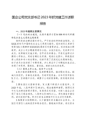 国企公司党支部书记2023年抓党建工作述职报告一、2023年履职主要情况(一)突出政治建设,扎实开展学习贯彻XXX新时代中国特色社会主义思想主题教育始终把政治建设摆在首位,严守政治纪律和政治规矩。以XXX新时代中国特色社会主义思想为指导,组织党员认真学习党的XX大精神和XXXXXX最新系列重要讲话。抓实抓细主题教育。成立公司主题教育领导小组,由我任组长,支委班子任成员。统筹制定实施方案,召开动员部署会,开展交流研讨并撰写心得体会,用好首都红色资源,观看红色影片,积极落实爱心捐款和对口助农帮扶,创新开展了沉浸式红色剧情体验,班子成员分别讲授了专题党课,并认真召开了专题组织生活会,实现了学思想、强党性、重实践、建新功的良好效果。(二)聚焦主责主业,服务中心大局1.稳步推进调整转型。压减管理层级,推动股权退出。削减内容投资,妥善完成收尾,及时回笼资金,全年项目回款达X万元。坚持稳中求进,调整子公司经营策略,获取稳定净收益。2.塑造园区运营新形象。X大厦不断提升运营效率,至2023年底,入驻率提升至95.1%,租金逾期率清零。按照北京市文化消费创新提升要求,X商场正式运营,对新入驻企业实现了X亿元租金减免,入驻率达到90%以上。择机储备存量空间,适时适度扩张,努力打造X品牌城市文化生活空间集群。3.集聚资本协同联动。以少量国有资本撬动社会资本,为园区项目引入战略投资和财务投资。围绕城市更新,通过资本管理、内容集成、文化赋能打造差异化竞争优势,推动建设、招商和运营三位一体协同共进。(三)切实履行第一职责,推动全面从严治党向纵深发展我严格履行第一责任人职责,推动党支部落实主体责任和班子成员落实一岗双责。根据集团党建重点任务,组织制定并认真执行公司全面从严治党主体责任任务安排。坚持民主集中制,完善支委会、董事会、办公会议事规则,修订了党支部前置研究重大事项清单和公司三重一大决策制度,明确各治理主体的权责边界。成功召开了党支部换届选举大会,顺利产生新一届支委会,选优配强支部班子。坚决落实意识形态工作责任制,认真执行公司意识形态领域工作三年规划(2023-2025年)和常态化落实办法,每半年进行一次专题研究。从资格审核、受理入驻、项目孵化等环节加强对入园企业的监管,确保意识形态安全可控。驰而不息推进党风廉政建设,制定了年度纪检监察工作要点和党风廉政建设责任制主要任务分工,组织签订权责清单。坚持纠四风树新风,开展了1+3+1专项整治活动。严格执行廉洁过节五根弦的要求,每半年召开一次党风廉政建设主题党日活动。召开了以案为鉴、以案促改警示教育会,深刻吸取集团X和X案件的惨痛教训,不断提升拒腐防变、抵御风险的能力。(四)推进基层党组织建设,加强党员教育管理注重党支部标准化规范化建设,全年召开支委会35次,党员大会5次,主题党日活动12次,组织生活会(含专题组织生活会)2次。夯实公司党建品牌,出台了青年党员保障服务队青年党员业务攻坚队实施方案,与党建引领企业高质量发展行动相结合,服务中心工作、激发创新活力。严格党员教育管理,双报到社区报到率达到100%,主动参与X商场所在地垃圾分类活动。紧扣工作实际,开展了解难题、找措施、寻突破大学习大讨论和职场情景角色扮演交流研讨。(五)整改落实情况2022年集团巡察反馈的6个问题、2023年市审计局审计反馈的5个问题、2022年市委意识形态专项检查发现的1个问题已全部完成整改。2022年度党建述职查摆的3个问题均已解决,基本实现了问题整改无遗项,整改效果无折扣。二、存在主要问题一是在抓党建创新上出真招、抓实效、见成效上还需加强立足新发展阶段,通过党建引领、守正创新,推动公司纾难解困转型发展上还需进一步思考探索。二是开展理论学习与提升专业素养的结合还需加强。在扎实做好党员学习教育的同时,如何与业务知识学习深度融合,进一步提升专业水平,精准指导工作实践还有短板弱项。三是在加强人才培养、激励担当作为方面还需加强。对年轻党员、员工的思想动态了解不够深入、培养措施不够丰富、职业发展谋划不足,充分激发担当意识和斗争精神还需完善。三、2024年主要工作方向一是着力抓好党建工作与改革发展的有机融合。深化党建引领企业高质量发展行动,侧重与业务转型新方向相结合,实现党建在业务平台上落地有抓手,业务以党建为依托有组织保障。二是推进党建品牌建设不松懈。梳理总结现有成果,结合党的XX大精神和业务转型实际,完善党建品牌内容。三是加强党员教育管理。积极践行群众路线,加强谈心谈话的广度与深度,触及思想深处,进而精准指导。多措并举丰富学习教育的内容形式,全面提升党员能力素质。