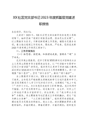 XX社区党支部书记2023年度抓基层党建述职报告各位领导、同志们:大家好!2023年,XX社区党支部在新华街街道党工委的领导下,始终坚持党建引领基层治理、服务民生促发展,以主题教育为抓手,不断创新党建工作思路,增强为民服务本领,着力推动党建工作实起来、强起来、严起来。现将我支部2023年度党建工作情况汇报如下:一、工作开展情况(一)抓思想、强觉悟,加强理论武装,坚持在硬上下功夫。扎实开展主题教育。把学习贯彻XXX新时代中国特色社会主义思想主题教育作为首要政治任务,以听讲座+专题学+记笔记+宣讲团的形式,组织党员认真学习党的XX大精神,深刻领会XXX新时代中国特色社会主义思想精髓要义,进一步增强四个意识,坚定四个自信,做到两个维护。自主题教育开展以来,XX社区党支部突出深学,确保学习效果。全体党员严格按照支部制定的学习计划开展集中学习,26名党员制定个人学习计划并进行自学。支部通过线上+线下的学习方式,为全体党员发放学习资料39套,充分利用学习强国、共产党员网等平台,通过集中学、自主学、送学上门三种途径开展全方面的学习。突出实做。以我为群众办实事为载体,将主题教育与社区重点工作有机融合,通过我为群众办实事、立足岗位做贡献,组织党员承诺践诺,调动党员为民服务的积极性。突出立改。把问题整改贯穿主题教育始终,奔着问题去、带着问题学、对着问题改;组织党员第一时间解决群众身边的急难愁盼,着力让群众得实惠。(二)党建引领践初心,铸牢中华民族共同体意识,坚持在强上下功夫。社区党支部以铸牢中华民族共同体意识〞为主线,积极贯彻执行党的民族政策。通过聚焦共居、共学、共享、共建四项重点,促进各民族广泛交往、全面交流、深度交融,使各民族像石榴籽一样紧紧拥抱在一起,辖区呈现出民族团结、宗教和顺、邻里和睦、社会和谐的良好局面。社区定期召开民族团结工作会议,分析当前辖区内民族工作情况。通过制作民族团结宣传栏,发放宣传资料、居民微信群宣传、与辖区内天主教堂开展民族政策与法律法规宣传教育活动等,使广大居民群众在耳濡目染中接受了民族团结教育,营造了民族团结平等互助的良好氛围。(三)民主协商议事,提升社区治理效能,坚持在实上下功夫。一是持续深化基层党建亮晒比创先争优行动,积极创建坚强堡垒模范支部。社区党支部组织党员开展志愿服务活动6次;开展我为群众办实事活动8次,七一慰问困难党员1人,八一慰问退役军人1人,中秋慰问困难群众15人;帮助基层困难群众解决了低保待遇办理3件,申请残疾人无障碍设施1户。切实将亮身份、晒成绩、比贡献活动做实做细做出成效,真正做到党员身份亮出来,服务居民动起来,关键时刻站出来,先锋形象树起来。不断提高党组织的凝聚力、战斗力和影响力。社区党支部严格落实每月四日制度,强化党员教育管理,组织党员参加组织生活。全年共召开主题党日14次、支委会会议12次,党员大会4次,党课10次。按时按标准收缴党费,做好党费收缴情况等党务公开工作。紧扣重要时间节点,围绕重要学习内容,强化主题活动,进一步坚定了理想信念,增强了政治觉悟。二是推进民主协商议事,提升社区治理效能。社区党支部一核引领,多措并举抓小区组织建设和阵地建设,以小区党群服务站为依托,把小区图书馆和众人议事室有机结合起来,通过每月3日、13日、23日定期开展逢三说事活动,面对面商量,想办法、提建议、献良策、支实招、作答复。2023年共召开协商议事会10余次,协商解决小区监控、维修单元门平台、更换玻璃、维修墙皮脱落等事宜7件。(四)落实党建责任制,打造廉洁支部,坚持在严上下功夫。一是切实履行主体责任。认真履行支部书记党建工作主体责任,坚持将党建工作与业务工作一体部署、一体推进,并将党建任务细化到人、量化到岗。二是落实一核多元四条链,通过打造红色物业和送你一朵小红花党建品牌,把党建融入物业管理和志愿服务,激活群众参与社区治理的活力。2023年共开展富有实效、形式多样的志愿服务活动18次,红色物业为民办实事6件,并提供日常24小时不间断服务。三是强化意识形态监管。严格落实意识形态工作责任制,加强意识形态学习,传播、传递好党和政府的声音。开展党员党性分析,通过谈心谈话了解党员思想、工作生活等方面的情况,搭准党员的思想脉搏,把握党员的关注热点,着力统一思想认识、激发工作动力。支部对重大事件、重要情况、重要社情民意中的苗头性倾向性的问题,有针对性地进行科学引导,先后回复处置网络舆情10余件,有力维护了意识形态领域安全稳定。四是落实帮办代办机制,促民生保障水平不断提升。社区将帮办代办全方位融入社区服务体系建设,全力打通服务群众最后一公里,由网格长带领小区三户三长,主动走进居民家中进