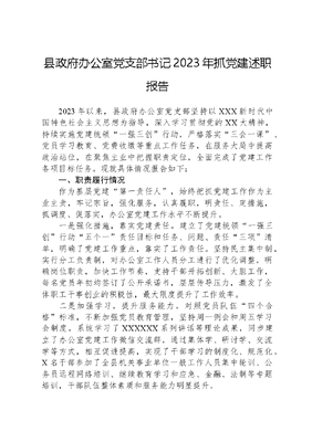 县政府办公室党支部书记2023年抓党建述职报告2023年以来,县政府办公室党支部坚持以XXX新时代中国特色社会主义思想为指导,深入学习贯彻党的XX大精神,持续实施党建统领一强三创行动,严格落实三会一课、党员学习教育、党费收缴等重点工作任务,在服务大局中提高政治站位,在聚焦主业中把握职责定位,全面完成了党建工作各项目标任务。现就具体情况报告如下:一、职责履行情况作为基层党建第一责任人,始终把抓党建工作作为主业主责,牢记宗旨,强化服务,认真履职,明责任、定措施,抓调度、促落实,办公室党建工作水平不断提升。一是强化措施,靠实党建责任。建立了党建统领一强三创行动五个一责任目标和任务、问题、责任三项清单,明确了党建工作重点,靠实了工作责任。坚持民主集中制,实行分工负责制,对办公室工作人员分工进行了优化调整,明确岗位职责,加快工作节奏,支持干部开拓创新、大胆工作,每名党员年初均签订了公开承诺书,层层传导压力,激发了全体职工干事创业的积极性,最大限度提升了工作效率。二是加强学习,提升服务能力。对照党员队伍四个合格标准,不断加强党员教育管理,坚持周一例会和周五学习会制度,系统学习了XXXXXX系列讲话等理论成果,同步建立了办公室党建工作微信交流群,通过集体学、研讨学、交流学等方式,相互促进提高,实现了干部学习的制度化、规范化。X名干部参加了全县机关事业单位一般工作人员集中轮训、公务员远程网络培训、继续教育学习和应急、金融、法制等专题培训,干部队伍整体素质和服务能力明显提升。三是健全制度,规范工作运行。坚持把党建工作与中心工作同谋划、同部署、同推动、同落实,健全了三会一课制度,按要求严肃、认真、规范召开支委会和党员大会,定期开展讲堂课活动,推进三会一课全过程纪实、痕迹化管理,认真规范填写党支部工作手册。修订并完善办公室考勤值班、财务管理、信访接待、信息调研等规章制度X项,严格落实X小时领导带班和专人值班工作制度,及时处理各类突发事件X起。四是综合协调,服务经济发展。围绕全县中心工作,认真履行政务服务、以文辅政、督查落实等工作职能,筹备迎接上级督查检查X余次,牵头组织常务会议、专题会、调度会等会议X余次;受理上下级来文X件,印发县政府及办公室文件X件,编印《政务信息》X期,向市政府报送政务信息X条;高质量起草领导讲话、工作汇报等综合性材料X余篇X余万字,开展集中调研X次、专题调研X次,形成有分析、有见解、有价值的调研报告和理论文章X多篇;编发《督查件》、《督查通报》等X期,督办领导批示件X件、常务会议定事项X项,答复人大代表建议和政协委员提案77件。五是统筹推进,兼顾各项任务。开展银企对接活动X次,协调落实X户小微企业贷款X亿元,衔接落实特色产业发展工程贷款X户X万元,组织开展金融宣传、小贷公司检查、非法集资专项整治等活动X次,有效保障了县域经济社会发展和金融秩序稳定;审查规范性文件X件,开展行政执法检查X次,受理行政复议案件X起,应诉案件X起;接待群体访X起、个人访X起,受理县长热线X件,答复率达到X%;完成了办公室档案的系统录入;新签约招商引资项目X个,签约资金X万元,到位资金X万元,保障了各项工作责任及时高效落实。二、存在问题及下一步打算一年来,县政府办公室党支部党建工作在取得了一些成绩但与上级的要求相比仍有一定的差距,主要表现在:组织党员干部开展活动不够经常,结对帮扶工作开展不够深入;抓党建工作投入的精力不足,重办公室综合协调服务、轻党建工作的思想仍有所存在;服务水平还需进一步提高,协调运转不够高效流畅,工作机制还需进一步完善。下一步,我们将围绕抓好党建促发展这一目标,重点抓好以下三个方面:一是抓班子、聚合力、履职责。强化党建主体责任,严格落实一岗双责工作责任制,通过量化考核、述职评议、责任倒逼等方式,进一步靠实党建工作责任,推动办公室党组织建设和经济工作同步发展。二是强队伍、夯基础、激活力。根据工作需要,适时调整办公室人员工作分工,调动工作人员积极性;及时考察补充相关人员到办公室工作,持续抓好干部培养、人员推荐等工作;积极组织开展各类党内活动,激发干部干事创业热情。三是抓学习、建制度、促落实。加强思想政治、干部作风建设,严格落实党组织和办公室各项规章制度,不断创新党员教育管理服务模式,建机制强服务,转作风树形象,持之以恒抓好党员队伍建设,着力提升服务质量和服务水平。