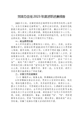 党政办主任2023年度述职述廉报告2023年以来,在镇党委的正确领导和分管领导的悉心指导下,在各位同事的支持帮助下,我牢记岗位职责,坚持学思践悟提升政治修养、抗牢责任强化履职尽责、廉洁自律守好个人底线,深入落实上级决策部署,围绕改革发展稳定中心工作,充分发挥党政办统筹协调、参谋助手的职能作用,各项工作再出新成效。现就一年来工作情况作以下报告。一、政治思想方面本人牢牢把握住主题教育这一契机,深入、系统、全面加强理论学习,能够自觉用XXX新时代中国特色社会主义思想凝心铸魂、指导实践、改进工作;认真学习党的XX大精神,在积极参加主题教育集体学习的基础上,注重开展个人自学,坚持原原本本学、原汁原味学,在不断学习中深刻领会两个确立的决定性意义,切实增强四个意识、坚定四个自信、做到两个维护。发扬标杆模范作用,坚持以身作则,带领部门深入贯彻市委X和区委X作风要求,在工作中服从大局、求真务实、履职尽责、事争一流,为X党委、政府工作的开展及推进做出了积极贡献。二、分管工作完成情况(一)围绕中心、服务大局,参谋辅政工作积极主动1.科学精细安排会务活动。党政办公室树牢标准化、规范化、精细化服务理念,认真、负责组织党委会、政府办公会、重点工作推进会、项目调度会等各类会议,认真做好会前通知、会中服务和会后督办。全年共记录留档党委会会议纪要X余篇,其他各类工作会议纪要X余篇,高效推动了各项工作的顺利开展。细致、周到地组织、筹备、协调调度X、X、项目观摩等各类活动,坚持组织超前、服务周全、勤俭高效的工作标准,保障了我镇各项重大活动的顺利开展。2.从严从细规范公文办理。严格落实中央八项规定和《关于解决形式主义突出问题为基层减负的通知》部署要求,大力转变文风会风,有效控制和压缩发文、会议数量,公文处理时效、会议召开质量不断提高。2023年共发红头文件X个,其中党委红头文件X个,政府红头文件X个,发文率较去年降低近X%。3.以文辅政强化文字水平。党政办公室立足基层,扎实开展调研,认真搜集整理素材,切实弘扬短实新文风,高质量做好各类党委政府文稿的起草及整理工作,全年上报政府重点工作简讯X期,截至目前被采X条;政务信息、国办约稿、省办专报等X篇,政务信息积分稳居全区前三名;高质量起草领导发言稿、主持词、讲话稿X余篇;起草政府工作报告等综合性文字材料X余篇,其他文字材料、工作简讯等X余篇。4.严肃常态推动政务公开。严格落实公开为常态,不公开为例外要求,重点做好本年度新旧系统的更替及数据迁移工作,全年在区政府政务公开网站发表、更新各类文件X余篇,持续发挥本级政务公开职能,更好实现以公开促落实、强监管、转作风的作用,保障辖区干群参与镇政府民主决策、管理和监督的权利,推动全镇工作提质增效。(二)严格规范、健全机制,管理协调工作提质增效1.上传下达规范有力。认真履行承上启下、沟通内外、协调左右职责,为应对上级、沟通下级、服务本级做好统筹协调和综合服务。凡上级来文,能够及时呈送镇党委、政府主要领导,并严格按照领导批示及文件要求呈送主管领导或相关部门和人员。凡应上报的材料,能做到统筹协调、规范及时上报。一年来,累计办理传阅件、领导批示件、机要件等各类来文来电X件。2.档案工作可圈可点。充分发挥档案工作管理小组作用,严格落实《X镇档案管理制度》,自X月份以来,共抽调X名机关干部集中到区档案馆办公,高标准完成全镇X年以来共计X册档案归纳、整理、存档、鉴定、保管等工作;对档案室进行规范化建设,完善各项基础设施,并做好安全保密、日常维护等工作。在市、区两级档案馆的督导检查中,我镇档案工作获得上级一致好评。3.保密工作常抓不懈。全面树牢不谋全局者,不足谋一域的战略思维,精准贯彻上级保密工作要求,进一步发挥保密工作领导小组作用,负责保密法规的传达,落实情况的监督、检查和管理工作。对涉密文件、材料的立卷、归档严格按照镇政府保密制度办理,对于保密事项严格遵守保密制度,不泄密,不传播,未发生泄密、失密事件。4.值班工作安全有序。党政办公室严密部署、执行全镇24小时值班制度以及领导带班制度,提前制定值班表,发布值班通知并确保值班人员到位。全年安排值班人员X人次,落实每日安全生产检查和节假日期间日报告制度,积极应对上级查班工作,并做好日常督导,严肃值班纪律,确保值班正常运转。(三)强化履职、细致入微,服务保障能力持续提升1.接待工作更周到。全力坚强前哨和巩固后院,积极、热情地做好上级部门、巡视组等来访、调研及接待工作。全年共接待来访、视察、合作交流X余次,接待工作精心、认真、细致,被接待人员反映我镇接待工作周到、入微、暖心。2.后勤保障更入微。坚持周到、节约、务实的物资管理方针,保证各类物资管理有序、取用有度,严防铺张浪费等现象。完善机关食堂