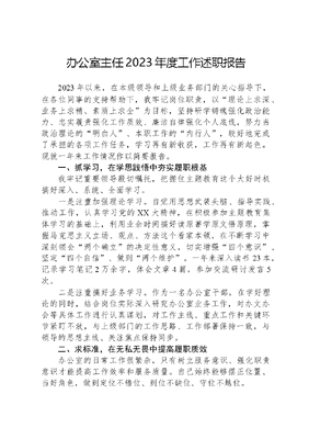 办公室主任2023年度工作述职报告2023年以来,在本级领导和上级业务部门的关心指导下,在各位同事的支持帮助下,我牢记岗位职责,以理论上求深、业务上求精、素质上求全为目标,坚持研学铸魂强化政治能力、忠实履责强化工作质效、廉洁自律强化个人底线,努力当政治理论的明白人、本职工作的内行人,较好地完成了承担的各项工作任务,学习再有新收获,工作再有新起色。现就一年来工作情况作以简要报告。一、抓学习,在学思践悟中夯实履职根基我牢记重要领导殷切嘱托,把握住主题教育这个大好时机搞好深入、系统、全面学习。一是注重加强理论学习。自觉用思想武装头脑、指导实践、推动工作,认真学习党的XX大精神,在积极参加主题教育集体学习的基础上,利用业余时间搞好读原著学原文悟原理,掌握马克思主义立场、观点、方法这个看家本领,在不断学习中深刻领会两个确立的决定性意义,切实增强四个意识、坚定四个自信、做到两个维护。一年来深入读书23本,记录学习笔记2万余字,体会文章4篇,参加交流研讨发言5次。二是注重搞好业务学习。作为一名办公室干部,在学好理论的同时,结合岗位实际深入研究办公室业务工作,对办文办会等具体工作进行认真谋划,对工作主线、重点工作和关键环节紧盯不放,与上级部门的工作思路、工作部署保持一致,与领导的思想主线、关注焦点保持同步。二、求标准,在无私无畏中提高履职质效办公室的日常工作很繁杂,只有树立服务意识、强化职责意识才能提高工作效率和服务质量。自己始终能够摆正位置、当好角色,做到定位不错位、到位不缺位、守位不越位。一是认真抓好党建工作。作为支部书记,始终坚持党建工作与业务工作同部署、同落实,严格落实三会一课、组织生活、谈心谈话、重大事项报告等制度,规范党内政治生活,进一步发挥党建工作服务大局、服务中心的职能作用。一年来,自己3次讲廉洁党课,积极到红色教育基地、警示教育基地等参观见学,并参加党建业务培训班被评为优秀学员。二是认真做好文字起草工作。牢固树立以文辅政和与时俱进的思想,发挥白加黑五加二精神,经常加班加点,努力捕捉领导的关注点,做重要会议提前介入,积极发挥参谋助手作用。在人少事多、文字综合人员相对紧缺的情况下,积极担当重任。一年来,共起草撰写各类会议纪要、讲话及汇报材料200余份。三是认真做好协调保障工作。坚持纵向多协调、横向多服务、内部抓协管,大事不糊涂、小事不马虎、熟事不大意,把服务第一铭记在心底,落实到行动,尽量把工作准备在先,把存在的和可能出现的问题考虑在前,尽可能保证大事不误、小事不漏。遵照领导指示,积极做好与有关部门的沟通、衔接和协调,确保了领导调研检查、召开会议部署任务、陪同接待等工作有条不紊的开展。一年来,先后保障重大会议27次、参与重大调研5次、深入基层49天。四是认真做好值班值守工作。按照高起点,高标准的要求,认真负责地做好每一项工作,办好每一件事,坚持与办公室人员一道按时值班,保证了重大事项的上传下达和政府领导临时交办的各项工作任务能够及时落实,及时报送值班信息,保证了信息的畅通和突发事件的及时处理,不让需要办理的文电在自己手中积压,不让各种差错在自己身上发生,不让来办公室联系工作的同志在自己这里受到冷落。一年来,先后参与值班60余次,办理文件130余份,有效处置突发情况30余起。三、强自律,在干净清爽中守好履职底线我始终牢记清廉是福、贪欲是祸的道理,严格落实为民务实、清廉要求,守住守好政治关、权力关、交往关、生活关、亲情关,不断加强党性锻炼和道德修养。一是坚持自省。自觉按照好干部20字标准修身立德,经常对照重要领导重要讲话、重要指示批示精神,经常对照党的路线方针政策,经常对照党章党规党纪,看清一些事情该不该做、能不能干,做到见善如不及,见不善如探汤。二是坚持自律。始终牢记两个务必,从未打着领导旗号拉关系办私事谋私利,遇事主动向领导汇报,对大是大非问题的处理,认真听取领导意见后坚决抓好落实。坚持大事讲原则,小事讲分格,严格遵守中央八项规定,在工作生活中,坚持身先士卒,要求别人做到的,自己首先做到,要求别人不做的,自己坚决不做。三是坚持自重。注重家庭家教家风,在管好自己的同时,严格要求配偶和亲属,真正做到敬畏人民、敬畏组织、敬畏法纪,止于名利、止于物欲、止于浮躁、止于侥幸。一年来,虽然努力做了一些工作、取得了一定成绩,但是自身还存在许多不足,如统筹谋划不到位,办公室工作干得多,对应急管理工作抓得不够紧;平时忙于文字工作,与同事之间沟通交流不足;工作亲力亲为的多,向下传递压力不到位等。在今后的工作中,我将不懈努力,克服困难,加强学习,不断改进,争取在新的一年实现更大提升。