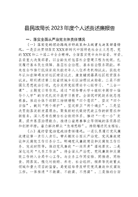 县民政局长2023年度个人述责述廉报告一、落实全面从严治党主体责任情况(一)落实党的理论路线方针政策和上级重大决策部署情况。一是坚决贯彻落实XXX新时代中国特色社会主义思想、党的XXX和二十届二中全会精神,全面落实党中央和省委、市委、县委重大决策部署,以全龄友好包容社会营建工程为统领,扎实履行基本民生保障、基层社会治理、基本社会服务职能,率先在全市推行低保家庭失能老年人入住养老机构试点,获批老年认知症障碍友好社区建设试点、康复辅助器具社区租赁服务试点,顺利通过第三批省级城乡社区治理试点验收。二是不断强化思想政治引领,充分发挥党组理论中心组学习、三会一课、主题党日等作用,通过领导带头学+组织专题学+倡导个人学的方式扎实开展学习教育,全面筑牢民政系统思想根基,推动全体干部职工持续增强四个意识、坚定四个自信,做到两个维护,坚定捍卫两个确立。三是坚决贯彻落实新发展理念,聚焦新时代做好民政工作的新要求和新任务,深入思考在健全社会救助体系、推动一老一小发展、提升基层治理能力、推进公益慈善事业等领域的落实路径和创新举措,着力解决群众急难愁盼,持续增进民生福祉。(二)履行管党治党政治责任情况。一是认真履行党风廉政建设第一责任人责任,带头制定全面从严治党、党风廉政建设和反腐败工作任务分工,明确党风廉政建设和反腐败工作任务、完成时限等,推动党风廉政一岗双责落地落实。二是深化运用九责工作法,将全面从严治党、党风廉政和反腐败工作纳入全局中心工作,与业务工作同安排、同推进、同检查、同落实,强化对救助、养老、社会组织、殡葬等民政重点领域和重大项目的监督,局党组每季度研究党风廉政和反腐败工作,一体推进不敢腐、不能腐、不想腐。三是推动全面从严治党向基层延伸、向纵深发展,强化业务领域问题排查整治,聚焦养老社保领域专项整治重点,深入查找最低生活保障救助错保漏保,村(社区)日间照料中心管理混乱、监管不力,养老待遇领取资格认证、社保费补缴、提前退休审批等社会保障公共服务中以权谋私、违规办理、慵懒散拖绕便民度不高等问题并及时整改。截至目前,养老领域排查问题X项,低保领域排查问题X项,社保领域排查问题X项,共计X项问题,现已全部整改到位。(三)严明党的政治纪律和政治规矩情况。一是认真履行意识形态工作第一责任人责任,每季度专题研究意识形态工作,牢牢掌握意识形态工作的领导权、主动权。二是扎实开展政治生态分析研判,组织党员干部开展经常性政治体检,对照政治生态评价指标中的评价内容开展自查自评和整改。三是坚持用制度管权、管人、管事,修订完善《县民政局三重一大事项决策机制实施细则(新修订)》《县民政局首问责任、公文处理、印章使用》等系列规章制度。聚焦救助、养老、收养等重点领域和关键环节,梳理排查廉政风险点,逐条制定防范措施,从源头上强化对权力运行的制约和监督。四是全力支持配合巡察工作开展,及时召开巡察工作安排部署专题会议,对巡察方向四个聚焦进行重点解读,推动全体干部职工严守巡察工作纪律,勇于直面问题,以高度的政治责任感接受巡察工作并坚决抓好问题整改。(四)支持和保障纪检监察机关(机构)履行监督责任、加大纪律审查力度情况。全力支持和配合派驻纪检组工作,主动接受派驻纪检组监督,及时部署落实纪检组安排的工作任务,每季度向纪检组汇报党风廉建设情况和班子成员落实一岗双责情况。邀请纪检组列席党组会议,配合纪检组做好安全生产、养老、救助等领域监督检查工作。(五)持之以恒正风肃纪情况。一是严格落实谈心谈话制度,经常性与分管领导、科室负责人开展谈话提醒,及时了解党员干部思想、工作状态,督促落实中央八项规定精神和省委省政府、市委市政府、县委县政府相关规定和实施细则,深入整治形式主义、官僚主义顽瘴痼疾,对苗头性倾向性隐蔽性问题及时咬耳扯袖,全面筑牢干部职工廉政底线。二是扎实开展主题教育,深入学习领会XXXXXX重要讲话精神,认真贯彻党中央和省市县委关于开展主题教育的部署要求,牢牢把握学思想、强党性、重实践、建新功总要求,紧紧锚定目标任务,以整改检视和规纪法相结合同推动,促进民政事业高质量发展。三是通过以案说法、观看警示教育片等方式持续开展警示教育,及时传达学习《关于落实中央八项规定精神正反典型的通报》等案例通报和警示读本,组织观看《欲壑--个别领导干部违纪违法案警示录》等警示教育片,积极用身边人、身边事加强教育警示,为全局干部职工打好预防针、敲响警示钟。(六)践行以人民为中心的发展思想情况。一是全面落实兜底保障政策,累计发放城乡低保金、散居特困供养金、临时救助金、残疾人两项补贴约X万元,保障特殊困难群体X万人次。完成困难群众春节、中秋国庆慰问,发放慰问物资X份、慰问金X余万元。建立县民政局、镇(街道)领导干部联系