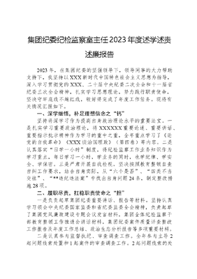 集团纪委纪检监察室主任2023年度述学述责述廉报告2023年,在集团纪委的坚强领导下,领导同事的大力帮助支持下,我坚持以XXX新时代中国特色社会主义思想为指导,深入学习贯彻党的XXX、二十届中央纪委二次全会和十一届省纪委三次全会精神,扎实学习思想理论,努力践行职责使命,坚决守牢底线不越红线,较好得完成了年度工作任务。现将有关情况汇报如下。一、深学细悟,补足理想信念之钙坚持将深学习作为提高自身政治理论水平的重要法宝。一是扎实学习重要政治理论,将XXXXXX重要论述、重要讲话、重要指示批示精神作为学习的重中之重,全年重点学习了《论党的自我革命》《XXX谈治国理政》(第四卷)等内容。二是认真落实日学一小时制度,将纪检监察工作业务知识作为学习重点,每日学习一小时,学业务的同时,也学纪律、学安全、学保密。三是严肃开展自我检视,坚决按照教育整顿自查自纠工作要求,结合自身实际,从六个是否、四类不当交往、**违纪违法案中找出自身问题24条,制定整改措施28项。二、履职尽责,扛稳职责使命之担一是负责起草集团纪委重要讲话、报告等材料。坚持认真学习领会中央纪委国家监委和省纪委监委全会精神,负责起草了集团党风廉政建设专题会议发言材料,集团全体纪检监察干部教育整顿工作推进会讲话材料,集团纪委案件质量评查整改工作报告及年度工作总结、政治生态分析报告等多项重要材料。二是认真参与监督执纪、审查调查工作。全年参与主导2起问题线索处置和1起案件的审查调查工作。2起问题线索的处置工作中,分批次带领纪检监察室全体干部实现对问题线索函询和初步核实流程的掌握;在案件的审查调查工作中,纪检监察室全体干部认真履职,边学边干,顺利完成对案件的立案审查调查、谈话、取证、定损等工作。三是全力协助纪委综合室开展案件审理工作。集团纪委自成立以来,所处理案件较少,没有专门审理人才,对案件审理工作程序比较欠缺,今年8月我借调参与了省纪委监委组织的案件质量评查工作,学习掌握了一些案件审理上的流程和工作要求,回来后我积极主动协助和指导纪委综合室的同事,厘清审理工作流程和工作要求,帮助纪委综合室的同事顺利完成了对集团2023年度所办案件的审理工作。四是扎实配合开展教育整顿各项工作。教育整顿工作中,主要负责问题线索的每周汇总与梳理上报工作,同时根据有关要求,着重负责对集团办案工作三个不规范和五个专项行动情况进行检视整治,负责对案件质量评查反馈情况进行整改完善。五是参与集团纪委重要工作。作为集团纪委的一员,认真参与对集团党委的政治监督工作;紧盯安全生产责任,参与对集团重点场所的安全生产专项监督检查工作;参与制度建设完善工作,对6项完善制度和3项新制定制度均提出了个人意见参与集团党风廉政建设工作会的组织筹备和集团党委党风廉政建设方面议题的准备工作;参与对党员干部的警示教育和纪律教育以及对四风问题的监督检查等。三、忠诚干净,绷紧遵规守纪之弦始终保持忠诚干净的良好形象,牢固树立底线意识和红线思维,时刻把纪律和规矩挺在前面,严格要求约束自己,慎欲修德,省己律身,真正做到在名利上、待遇上不计较、不攀比、不失衡,老老实实做人,干干净净做事,以敬畏之心对权,以淡泊之心对位,以律己之心对利,扛得住艰苦,耐得住寂寞,抵得住诱惑。回顾一年来的学习、工作,虽然取得了一定进步,但深感与组织期盼、领导要求、同事期待还有不小差距。一是思想认识有偏差。思想上没有对标先进找不足、找差距的常态思维,在精研深思上缺少打破砂锅问到底的钻劲儿,在勤学笃行上缺少千磨万击还坚劲的韧劲儿,践行职责使命,真管真严、敢管敢严、长管长严的主观自觉仍有差距。二是能力素质有短板。虽然自己从事纪检监察工作多年,但未参加过纪检监察机关全流程办案的实操培训和锻炼,也未认真借鉴学习过其他单位先进的执纪办案工作经验,办好案、办高质量案的能力素质不足,业务不熟练、基本功欠缺、本领恐慌。三是程序意识有欠缺。纪检监察工作是一项原则性、政策性、专业性、程序性比较强的工作,履行好法定的程序既是案件工作的现实需要,也是纪检监察工作规范化、法治化、正规化建设的必然要求。我对办理案件的程序意识树得还不够牢,有时甚至不知道还要履行哪些程序。下一步,我将高度重视自身存在的缺点和不足,进一步提高政治三力,做好自身整改工作。一是注重理论武装,强化政治担当。坚持将政治建设摆在首位,不断加强思想淬炼、政治历练和实践锻炼,筑牢信仰之基,补足精神之钙,持续涵养纪检监察干部的政治理论素养。二是聚焦主责主业,提升履职能力。既向书本学,也向实践学,从自身短板弱项出发,不断增加知识储备,更新知识结构,同时认真学习党纪国法,牢固树立以事实为依据,以纪法为准绳的监督执纪理念,充分运用好政策策略,做好监督执纪工作。三是严守纪律规矩,弘扬严实