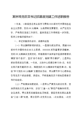 某林场党总支书记抓基层党建工作述职报告一年来,**林场党总支认真学习贯彻XXX新时代中国特色社会主义思想、党的XX大精神,认真贯彻党要管党、从严治党方针,严格落实党建工作责任,基层党建工作得到进一步加强。现将工作情况报告如下:一、书记抓基层的总结、成绩和经验(一)带头旗帜鲜明讲政治。一是强化政治担当。围绕XXX新时代中国特色社会主义思想、XXXXXX系列重要讲话精神、党的XX大精神及党规党纪,积极落实中央和省市区委部署要求,增强四个意识、坚定四个自信、做到两个维护。二是带头抓好思想政治引领。一年来,主持中心组理论学习共*次,各党支部开展专题研讨*次。围绕党的XX大精神讲专题党课*次。组织学习党的XX大精神主题党日活动,带头撰写学习心得体会,引导党员干部谈感悟、话担当,不断提高党员干部的思想意识和行动自觉。(二)严格落实制度建设。一是带头严肃党内政治生活。坚决贯彻执行民主集中制,涉及三重一大事项严格集体研究、会议决定。带头落实双重组织生活制度,督促各党支部认真落实三会一课制度,累计召开*次党员大会,*次支委会,*次党课。二是开展谈心谈话。定期开展谈心谈话工作,及时掌握党员干部的思想政治情况,认真倾听党员对林场党建工作的意见和建议。一年来,做到班子成员之间、班子成员与联系支部之间、各党支部书记与普通党员之间谈话全覆盖,共谈心谈话*余人次。三是开展主题党日活动。今年共开展*余次主题党日活动,我们结合工作实际,开展了党员干部与社区携手文明城市创建、义务植树、森林防火宣传、我为群众办实事等活动,丰富了党员干部的组织生活,增强了凝聚力,提高了干事创业的积极性。(三)认真履行管党治党责任。一是强力推动工作责任落实,专题研究全面从严治党工作*次,把全面从严治党纳入全场工作同谋划、同部署、同推进。主持修订完善《**林场全面从严治党责任清单》,明确各相关负责人的责任分工,全面压实一岗双责。二是强化风险防控,聚焦五一、国庆、元旦等节假日,持续落实中央八项规定及实施细则精神,加强对我场党员干部职工的教育、提醒、监督,努力营造风清气正的良好氛围。三是严格落实意识形态工作责任制,旗帜鲜明地站在意识形态工作第一线,带头抓意识形态工作,带头批评错误观点和错误倾向。二、抓基层党建方面存在的突出问题(一)突出问题。一是抓党建责任意识有待加强。对党建工作的标准、内容、程序掌握得不全面,对党建工作的重视程度有待加强。二是抓理论学习的深度有待提高。学习过程中存在实用主义,与工作有关的学习的深些实些,其他方面学习比较浅显,学深悟透、融会贯通能力需要进一步提升。三是深入各党支部调查研究有待加强。对各党支部的业务工作缺乏研究,党建与业务结合不够紧密。(二)原因分析。一是对党建工作重视程度不够,对各党支部存在的困难没有仔细研究和解决,没有做到经常深入支部实地指导。二是抓基层党建工作缺乏经常性、持续性,没有把每项工作、每个任务完完全全的抓到底、落实到底。三是党建工作人员专业化程度不高,党建工作人员及各党支部书记多为兼职做党建工作,党建业务不够熟悉,加上业务工作比较多,难以有时间和精力专注党建工作,不利于党建工作的推动与创新。三、2024年度书记抓基层党建工作的思路、重点和措施(一)提高政治站位。坚持把政治建设摆在首位,认真贯彻落实党的XX大精神,带头履行党建第一责任人职责,继续把林场党建工作作为重点工作来开展,定期召开党建专题会议。严格落实三重一大民主决策及议事制度,认真履行党风廉政主体责任和一岗双责职责。及时向党员干部传达党建工作最新要求,提高党员思想政治敏感性。(二)深化理论武装。坚持以XXX新时代中国特色社会主义思想为指导,把学习贯彻党的XX大精神作为当前和今后一个时期的首要政治任务,用好学习强国等学习平台,进一步筑牢思想根基。旗帜鲜明地站在意识形态工作第一线,及时传达学习落实XXXXXX系列重要讲话、重要指示批示精神,牢牢占据意识形态阵地。(三)注重宣传教育。把宣传教育工作摆到重要位置,配强党建专业人才,全力做好党建宣传教育工作,通过请进来与走出去的方式,不断提升宣传员的理论素养,提高新形势下引导舆论的本领,增强政治敏感性,及时捕捉单位宣传工作的亮点。加强舆情监督监测管理,围绕年度重点工作,通过开展各项教育活动,切实把新思想融入渗透到党员干部具体工作中,进一步凝聚思想共识,推动发展。(四)严守廉洁纪律。始终坚持做事先做人、修身先修德,认真贯彻落实中央八项规定精神,自觉按时、如实向组织报告个人有关事项,主动管理好亲属和身边的工作人员。坚持秉公用权,在三重一大事项方面始终按照议事规则、政策法规、职责要求办事,在原则问题上绝不越雷池。