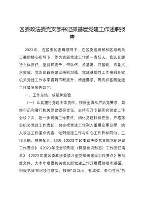区委政法委党支部书记抓基层党建工作述职报告2023年,在区委的正确领导下,在区委组织部和区级机关工委的精心指导下,作为支部党建工作第一责任人,我认真履行主体责任,坚持抓班子、带队伍,抓基层、打基础,抓重点、求突破,党支部自身建设得到加强,党建基础性工作得到夯实,机关党建工作水平得到不断提升。根据要求,现将抓基层党建工作情况报告如下:一、工作总结、成绩和经验(一)认真履行党建主体责任。按照全面从严治党要求,始终牢记和履行机关党建领导责任,主持召开专题研究党建工作会议2次,进一步明确工作要点,细化党建目标任务。严格落实机关党建工作责任,切实把党建工作列入重要议事日程,纳入政法工作重点内容,做到党建工作与中心工作目标同向、工作合拍、措施配套。印发《2023年区委政法委党支部党的建设工作要点》《2023年度意识形态(网络意识形态)工作责任清单》《2023年度区委政法委学习型党组织建设工作要点》等制度文件,为本年度委机关党支部党建工作开展提供根本遵循。积极抓好书记项目落实,按照切口小、有成效、牵引性强的原则,结合政法工作实际和群众反映强烈的问题,开展政法队伍为民服务进网格当好八大员活动项目,进一步强化党建责任意识和为民服务意识,推进基层党建工作抓实落靠。严格落实党支部决策议事规则,凡重大事项,均召开领导班子会议集体研究决定,充分发扬党内民主。(二)规范开展党内组织生活。严格落实三会一课、中心组学习、固定学习日、党员集中活动日、主题党日等学习制度,定期开展民主生活会、组织生活会和民主评议党员工作,召开政治忠诚剖析会,持续深化党建工作规范化、制度化、常态化建设。严格落实意识形态工作责任,组织专题研究意识形态工作会议2次,每季度定期汇报、分析政法领域意识形态形势,接受市委宣传部和市委政法委对全区政法系统意识形态专项督查1次,组织开展委机关意识形态工作专项督查1次。开展清查整治突出问题规范党务工作专项行动,针对*等问题,通过查阅机关党建方面实施方案、通知、制度等文件,查阅财务资料、管理制度、工作流程等方式逐一过筛子,严格落实党务工作相关制度要求和工作程序,进一步规范提升机关党务工作。(三)不断加强政治素养淬炼。坚持将理想信念教育放在首位,推进学习教育常态化开展,带领委机关党员干部持续补足精神之钙。严格落实第一议题制度,坚持以党的XX大精神、XXX新时代中国特色社会主义思想、XXX法治思想、XXXXXX对政法工作的重要指示批示精神和《XXX谈治国理政》第四卷等为重点,充分利用三会一课、中心组学习等各类学习载体,制定支部学习方案,列出学习计划、明确学习篇目,每月开展集中学习教育活动不少于3次。通过开展政治轮训、七一实景课堂、党支部书记和单位一把手讲党课等活动,不断提高党员干部的政治判断力、政治领悟力、政治执行力。组织开展学习党的XX大精神和学习《XXX谈治国理政》第四卷专题研讨会带领党员干部撰写心得体会,进一步坚定党员干部政治忠诚素养。(四)全面提升机关作风效能。持续开展党建引领转作风、提效能、树形象活动,促进机关干部队伍作风转变。进一步完善单位内部管理制度规定,成立委机关作风建设督查小组,对委机关人员迟到早退情况、每日工作情况、请销假和值班情况等进行督查。围绕统筹推进防范化解重大风险、强化务实为民服务等,常态化组织在职党员到社区开展双报到双服务活动,领导班子成员和支部党员进一步发挥基层党支部战斗堡垒和党员先锋模范作用,积极投身全国文明城市创建、森林防火等志愿服务活动中,坚持将学习教育成果转化为推动工作、保障发展的强大动力,把作风建设成效转化为为民服务的实际行动,支部全体党员宗旨意识、服务意识和工作效能明显提升。(五)充分发挥政法职能作用。坚持以党建为统领,委机关党员干部攻坚克难,全区政法工作不断取得新成效。圆满完成各个重点时期、重大活动期间安保维稳任务。开展矛盾风险隐患拉网式大排查大起底大化解专项活动,共排查交办各类社会矛盾风险隐患*件,涉重点人员*名、重点群体*个。深入实施网格治理3365创新工程,形成街道—村(社区)—网格—微网格—户五级治理体系,选任楼栋长十户长*人。推动与法院执行、食品安全监管、舆情监测等工作融合,建立网格+工作机制,进一步提升治理效能。对特殊困难群体救助帮扶、侵害妇女儿童权益、严重精神障碍患者服务管理以及基层社会治理短板弱项等方面问题进行排查整治,出台《关于建立困境妇女儿童司法救助与社会救助衔接机制的意见(试行)》,探索构建司法救助+社会化救助的多元共助模式。扫黑除恶斗争常态推进。在全市率先出台《**区乡街政法委员管理办法(试行)》,进一步提升街道政法委员队伍建设水平。(六)持续优化良好政治生态。全面落实从严治党责任,制定政法委领导班子、主要负责